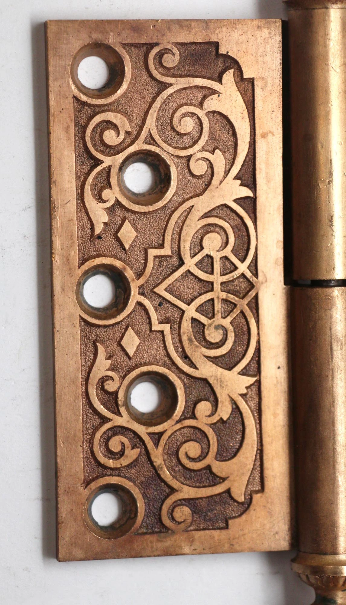 Steeple tip decorative bronze lift off antique door hinge with a polished finish. Staggered hole pattern. Priced each.
