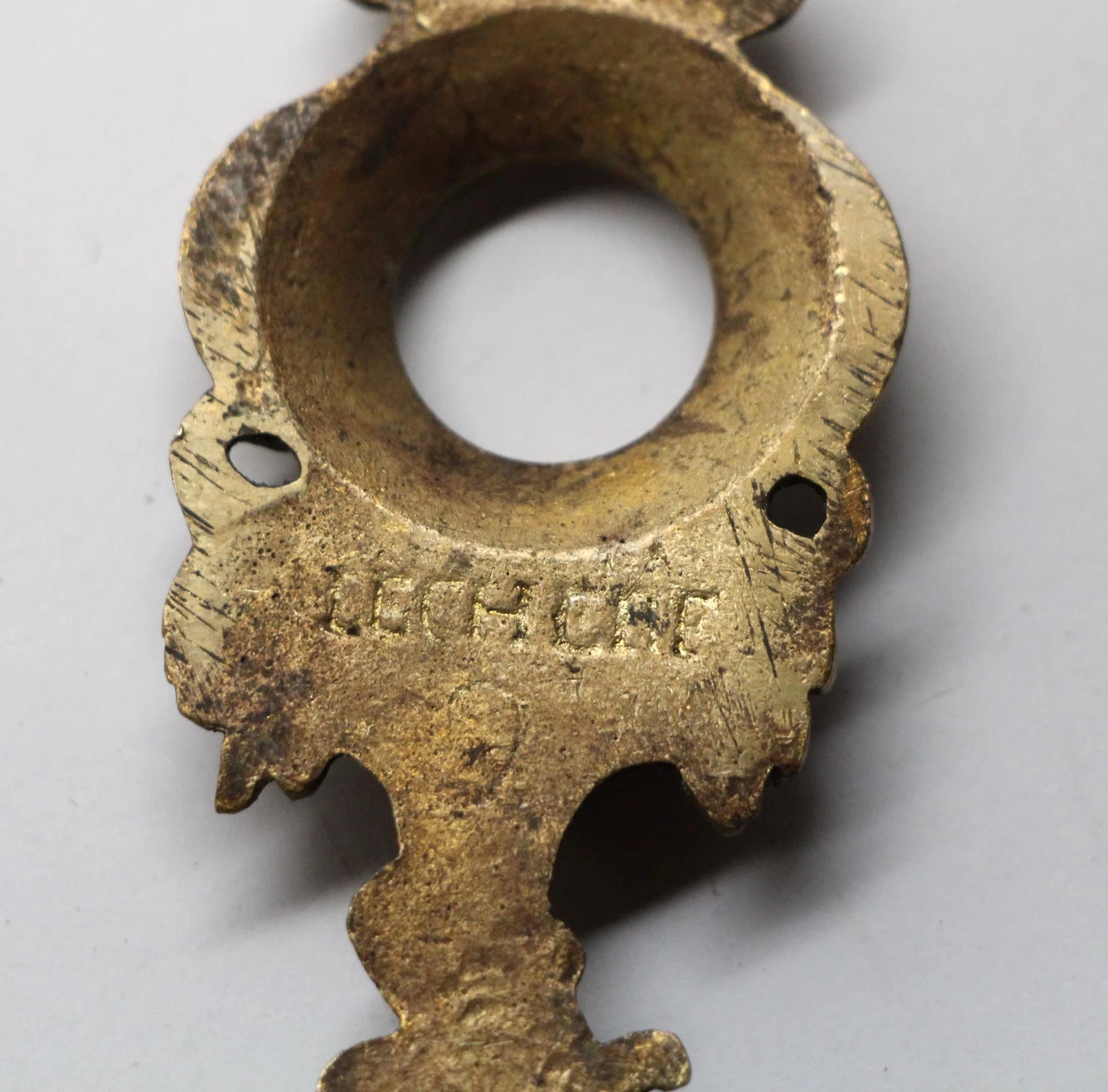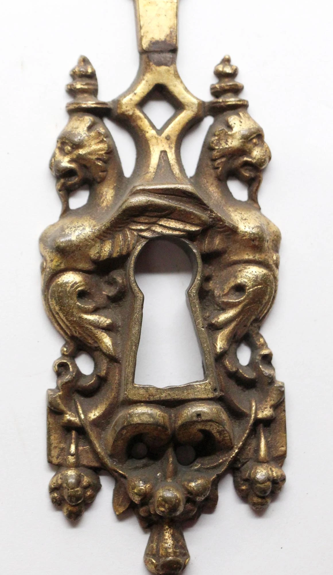 Decorative French back plate with figural bottom detail and a wide keyhole. Inscribed on back. One available.