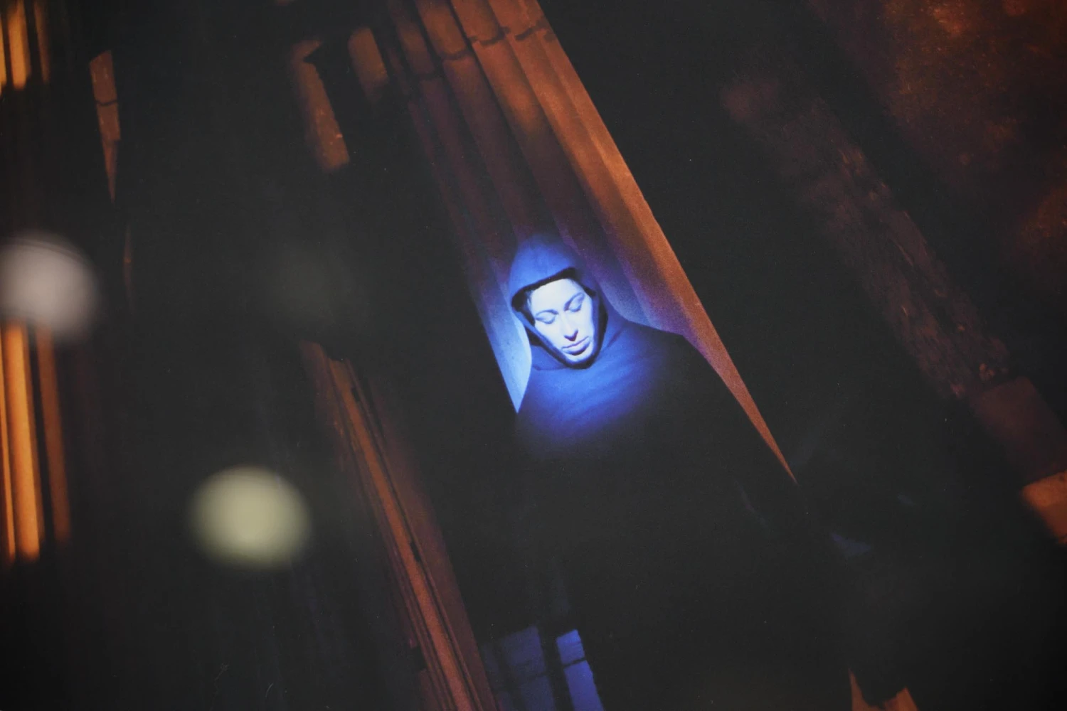 The Curtis Salonick architectural Gothic columns steel framed photograph captures the grandeur of Gothic architecture and figural mystery, showcasing intricate details and a sense of timeless beauty, making it a captivating piece of wall art. Signed Curtis Salonick, 61st year. The glass is intact and this is in good condition, with some warping in the matting.