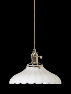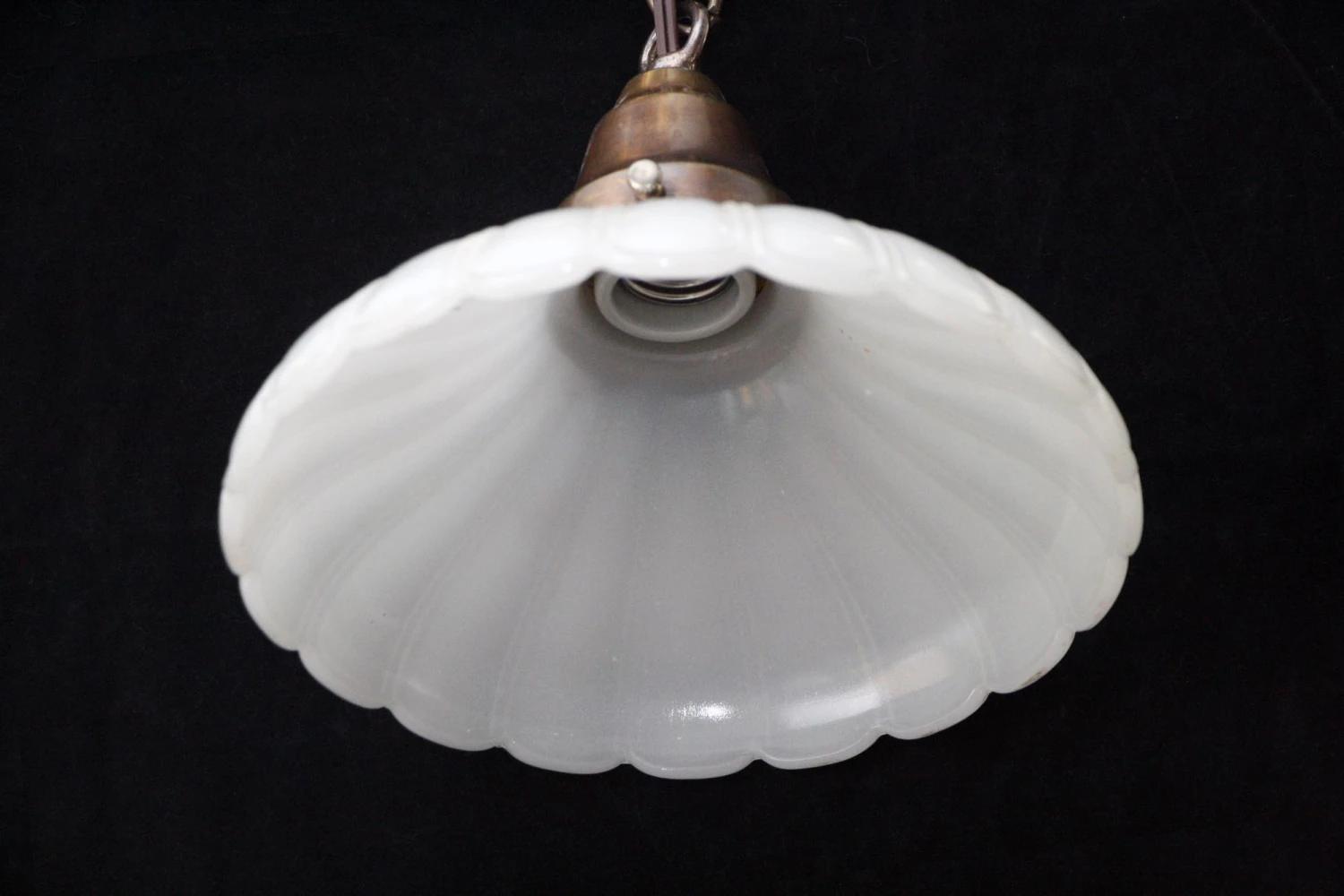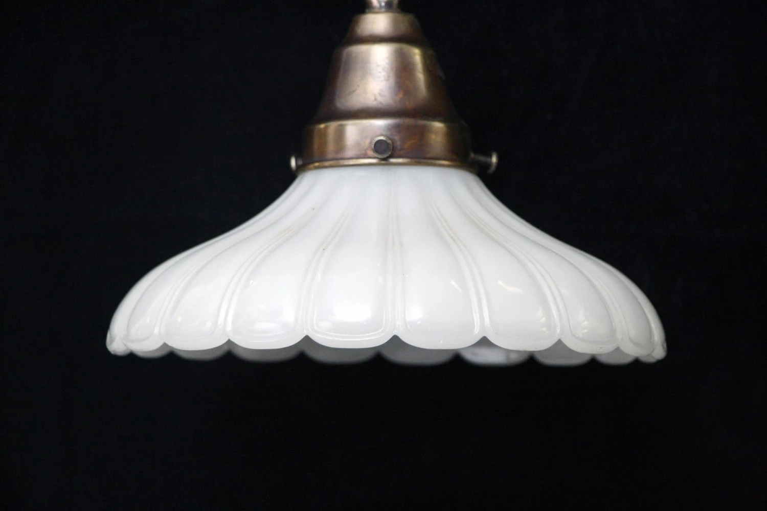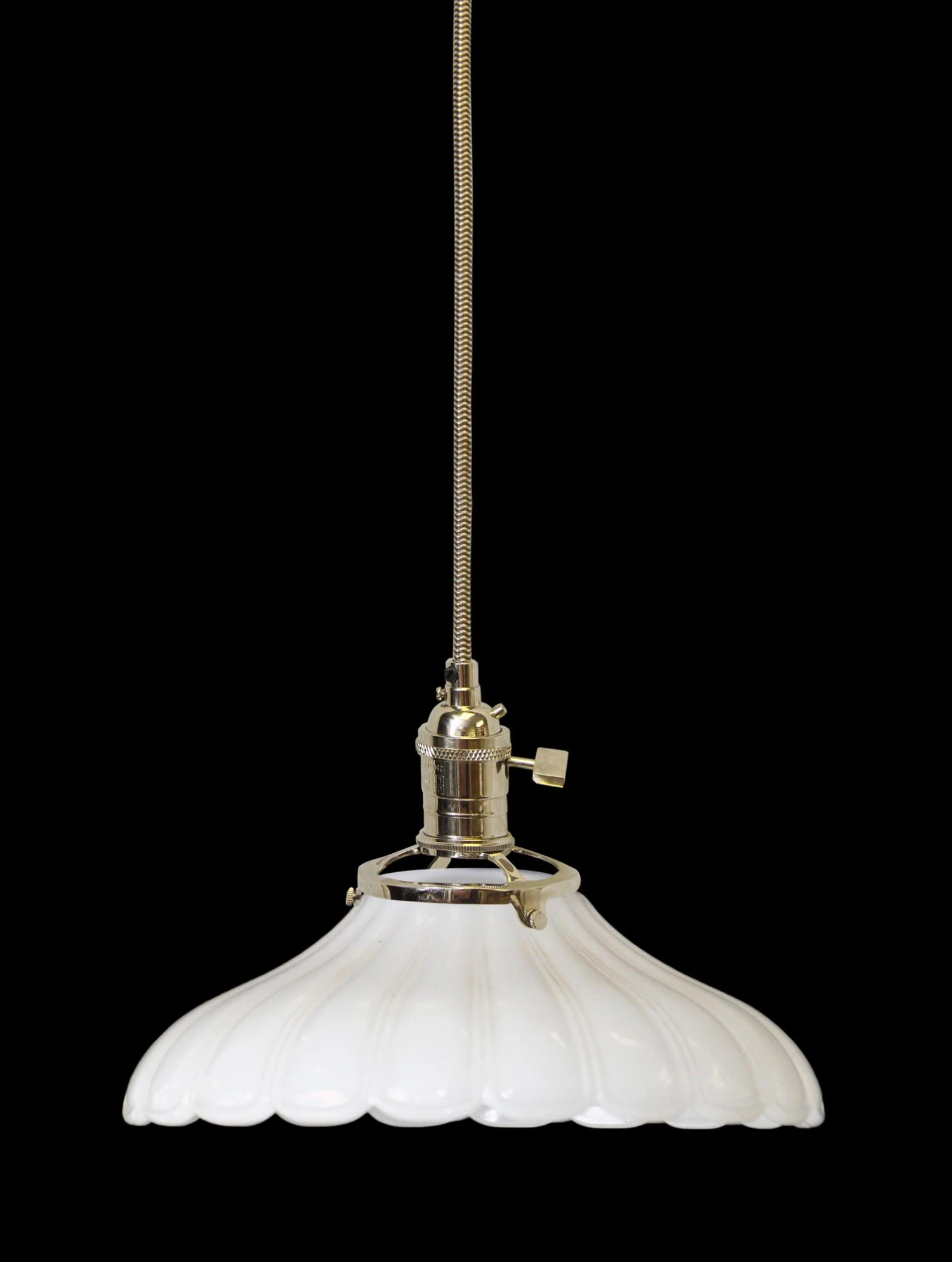 1920s fluted milk glass shade paired with a newly wired cloth cord fixture in polished nickel. Choose the fitter option you prefer. Please specify the overall drop that is needed upon purchasing. Priced each.