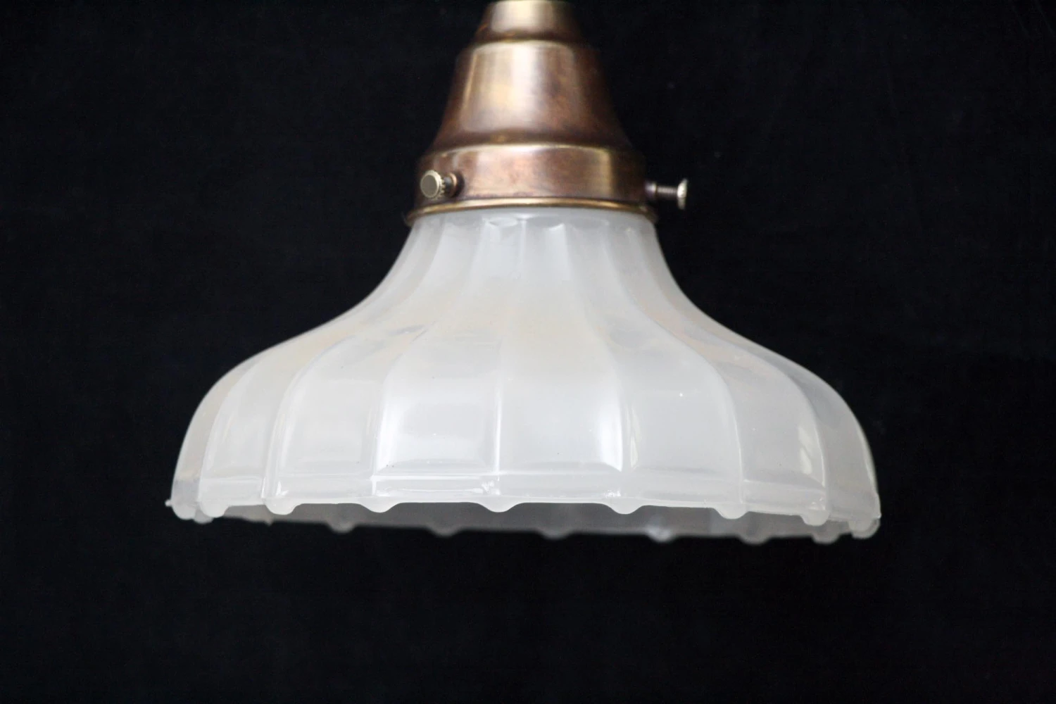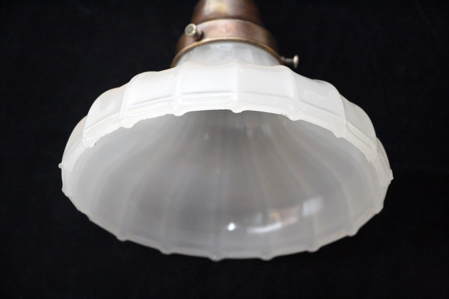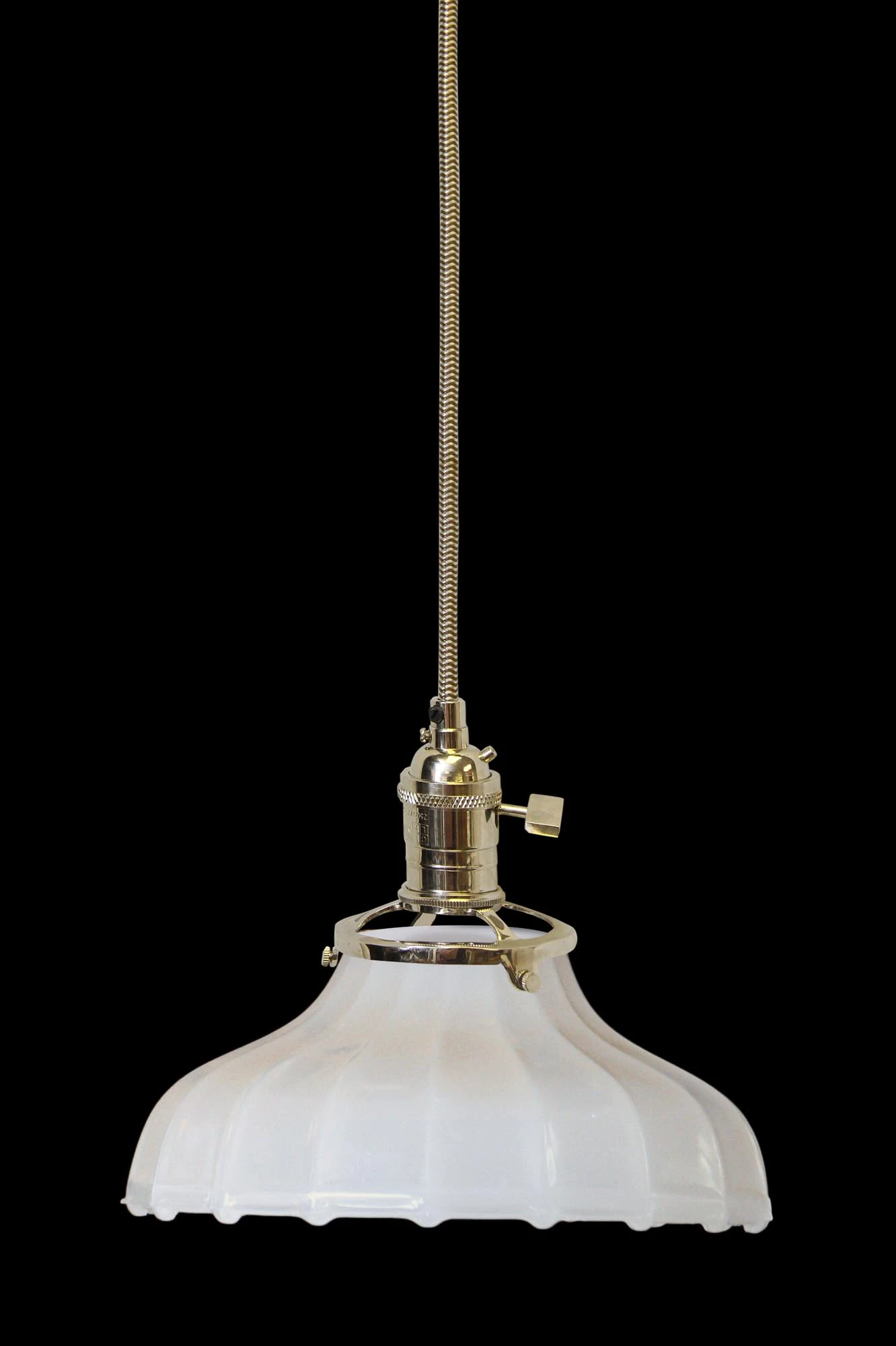 1920s fluted milk glass shade paired with a newly wired cloth cord fixture in polished nickel. Choose the fitter option you prefer. Please specify the overall drop that is needed upon purchasing. Priced each.