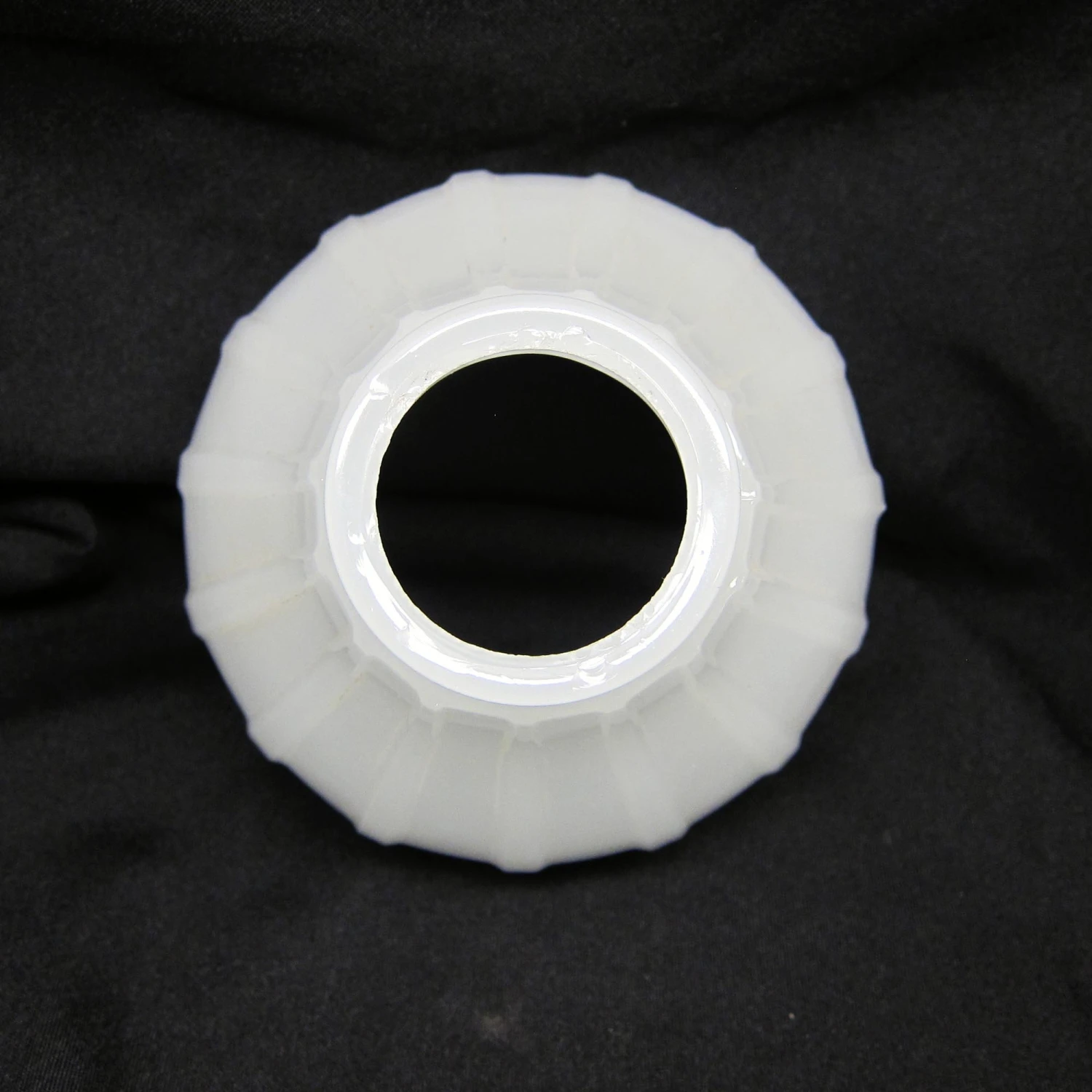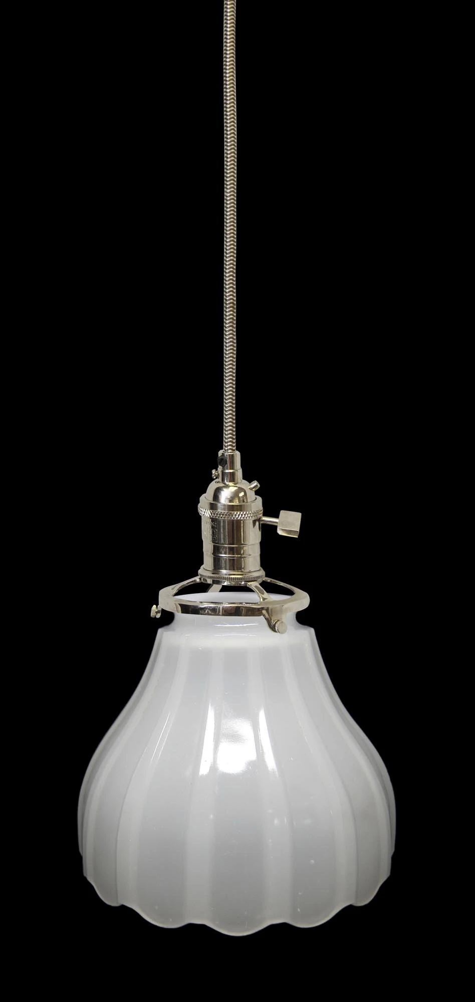 1920s fluted milk glass shade paired with a newly wired cloth cord fixture in polished nickel. Choose the fitter option you prefer. Please specify the overall drop that is needed upon purchasing. Priced each.