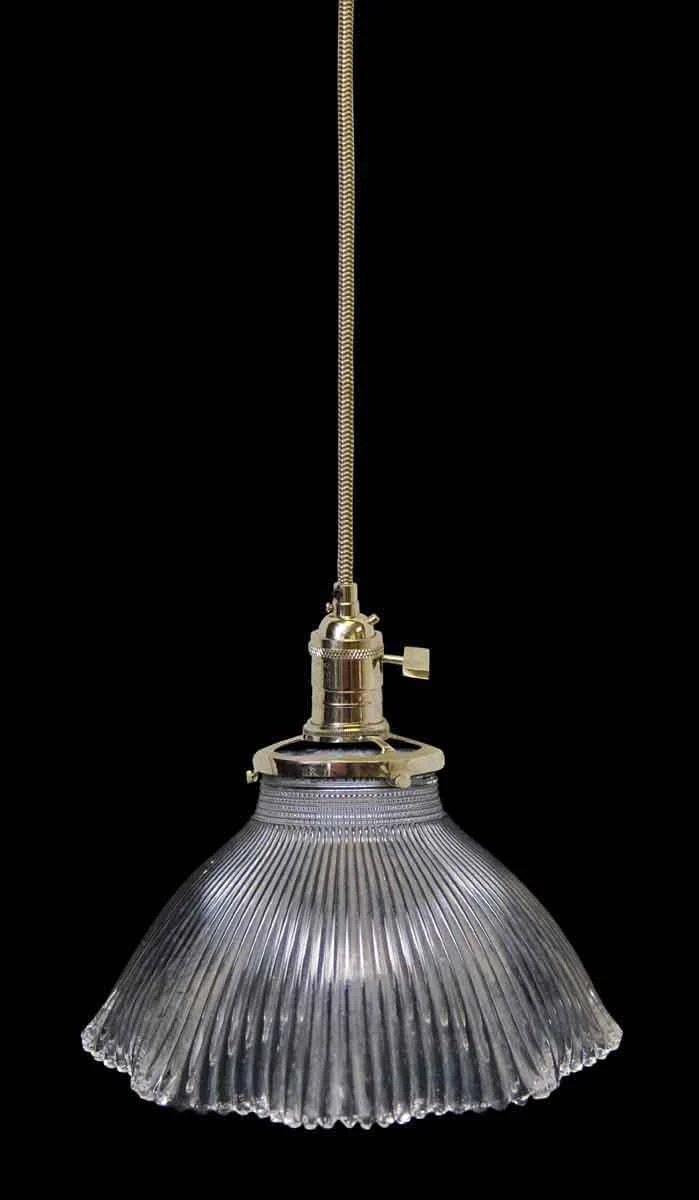 1920s Holophane clear prism glass globe pair with a newly wired fitter. Holophane is known for its scientifically designed prism glass which makes an even illumination. Choose the option of fitter you prefer. Please specify the overall drop and fitter style upon purchasing. Priced each.