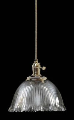 1920s Holophane clear prism glass globe pair with a newly wired fitter. Holophane is known for its scientifically designed prism glass which makes an even illumination. Choose the option of fitter you prefer. Priced each. Please specify the overall drop that is needed upon purchasing.