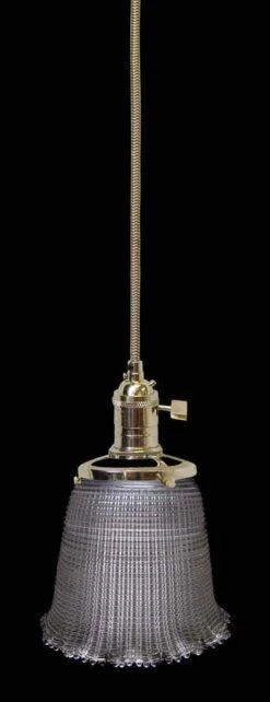 1920s holophane clear prism glass globe pair with a newly wired fitter. Holophane is known for its scientifically designed prism glass which makes an even illumination. Choose the option of fitter you prefer. Please specify the overall drop that is needed upon purchasing.