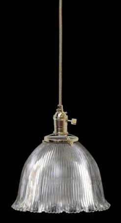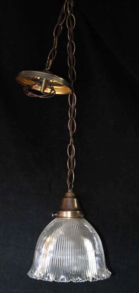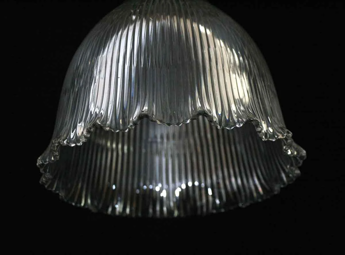 1920s Holophane clear prism glass globe pair with a newly wired fitter. Holophane is known for its scientifically designed prism glass which makes an even illumination. Choose the option of fitter you prefer. Priced each. Please specify the overall drop that is needed upon purchasing.