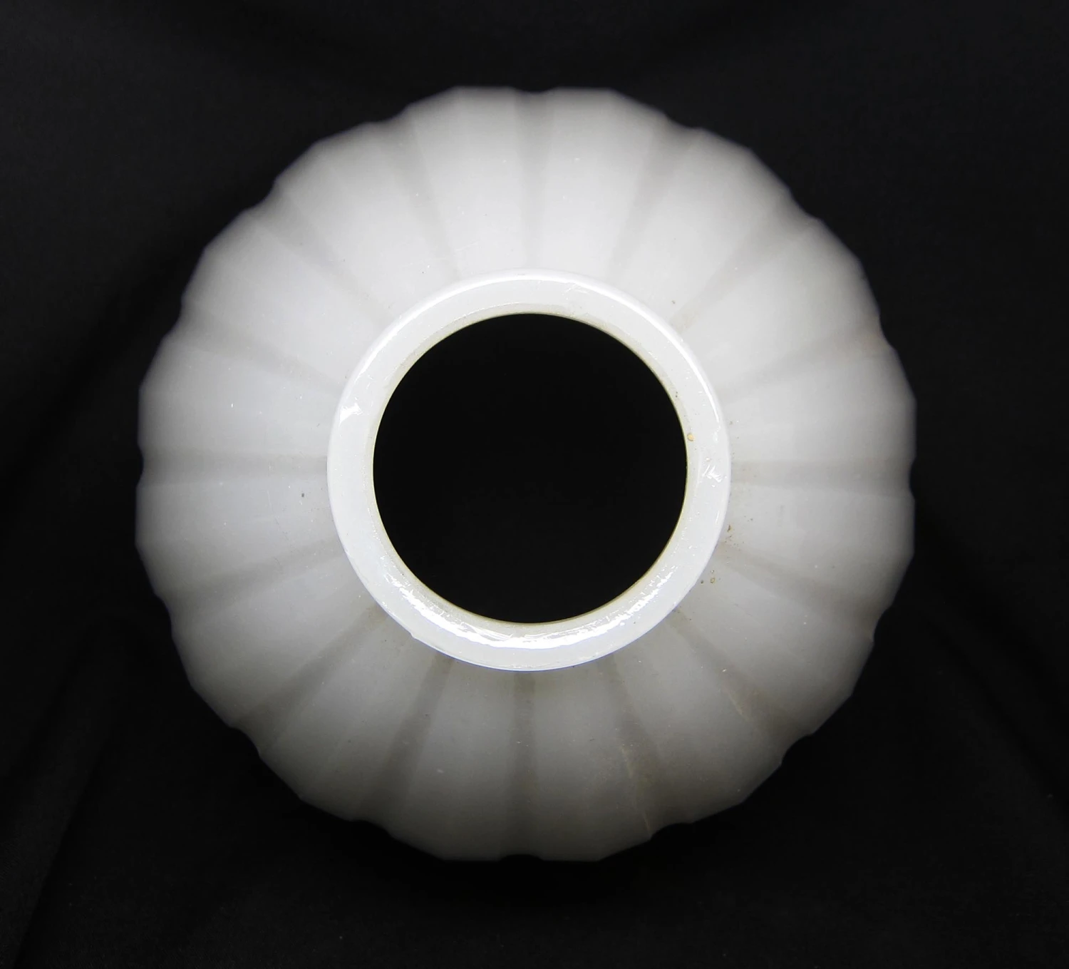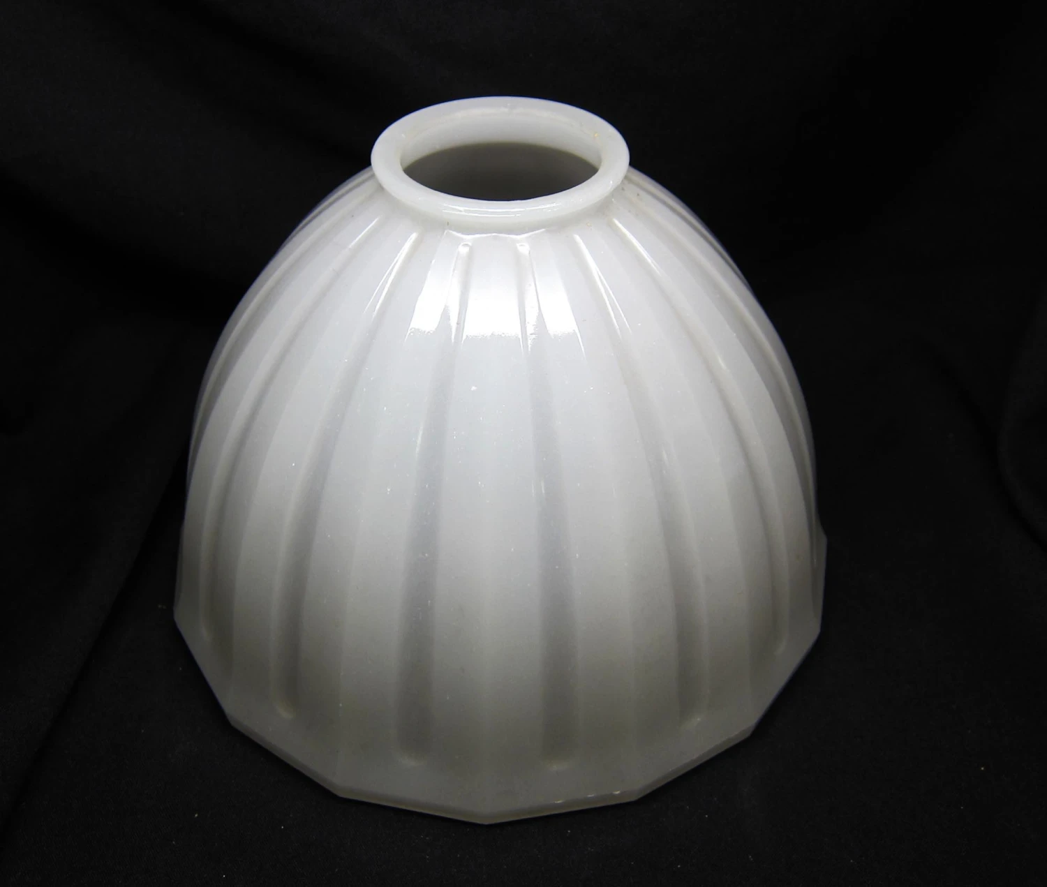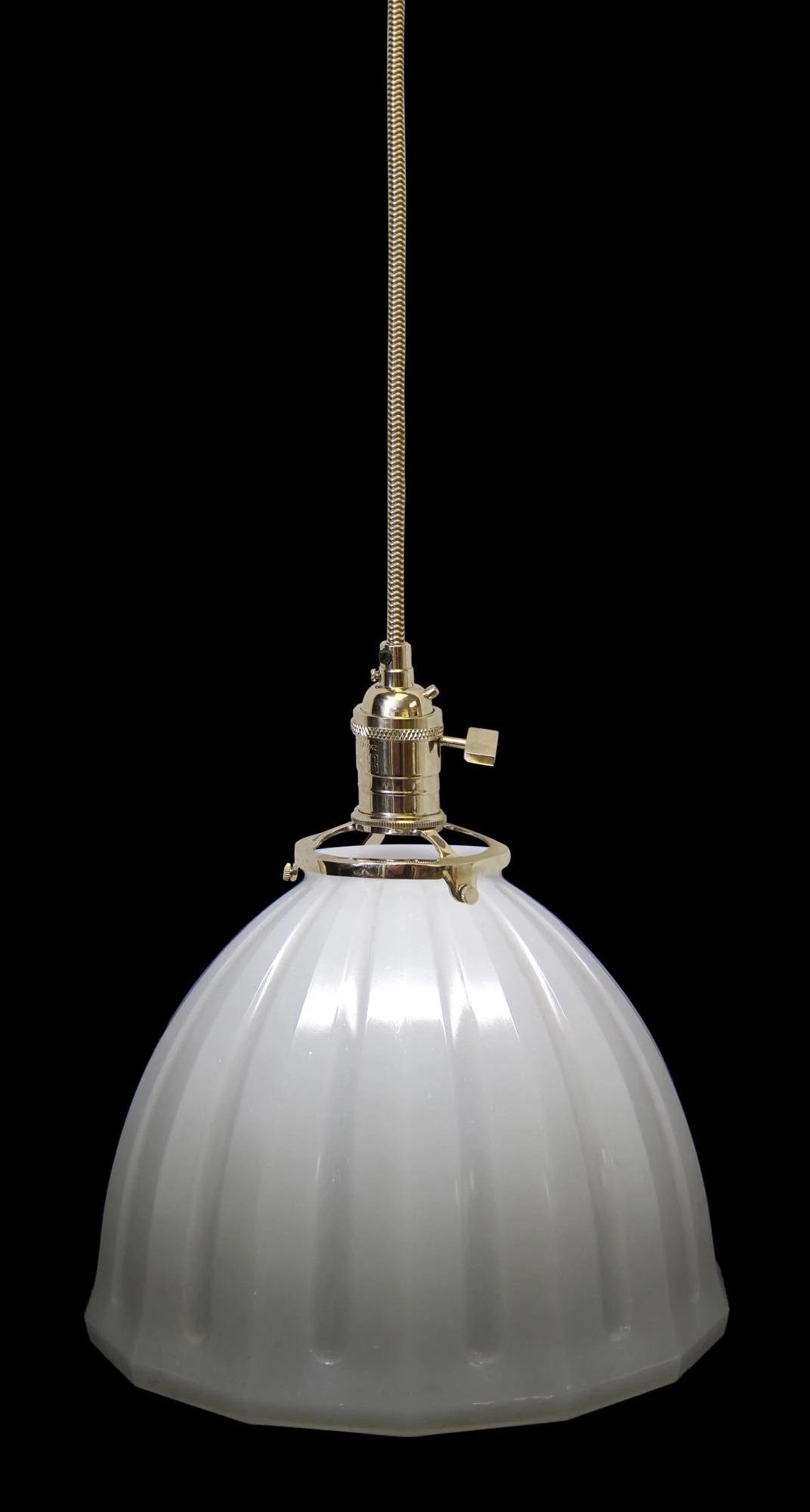 1920s fluted milk glass shade paired with a newly wired cloth cord fixture in polished nickel. Choose the fitter option you prefer. Please specify the overall drop and fitter style upon purchasing. Priced each.