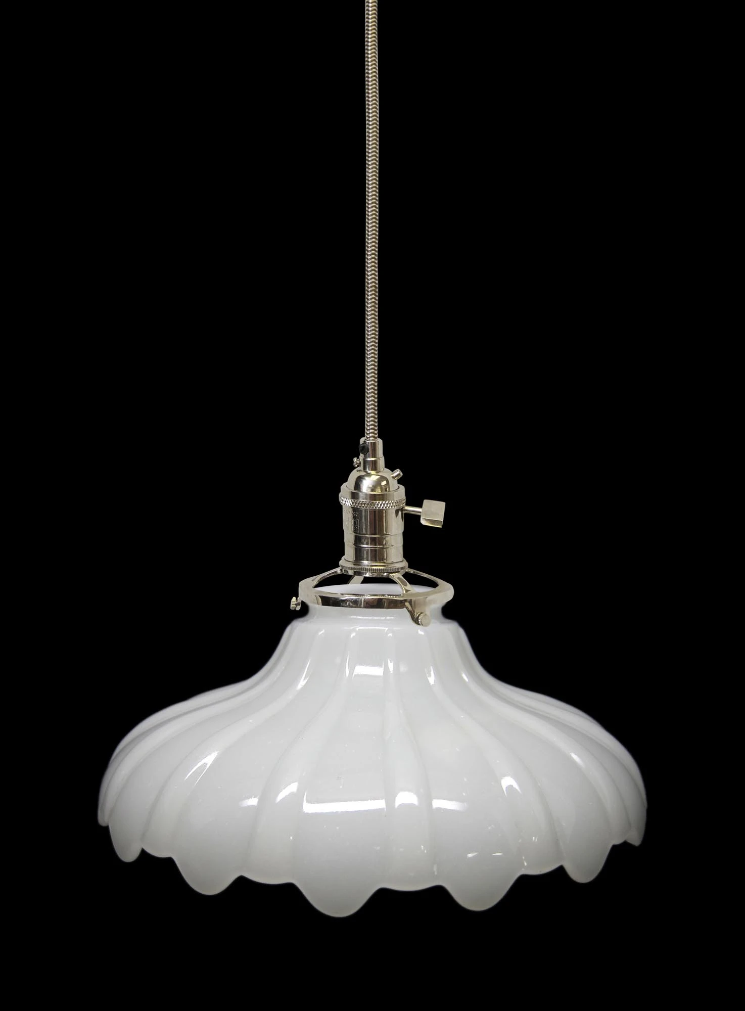 1920s fluted milk glass shade paired with a newly wired cloth cord fixture in polished nickel. Choose the fitter option you prefer. Please specify the overall drop that is needed upon purchasing. Priced each.