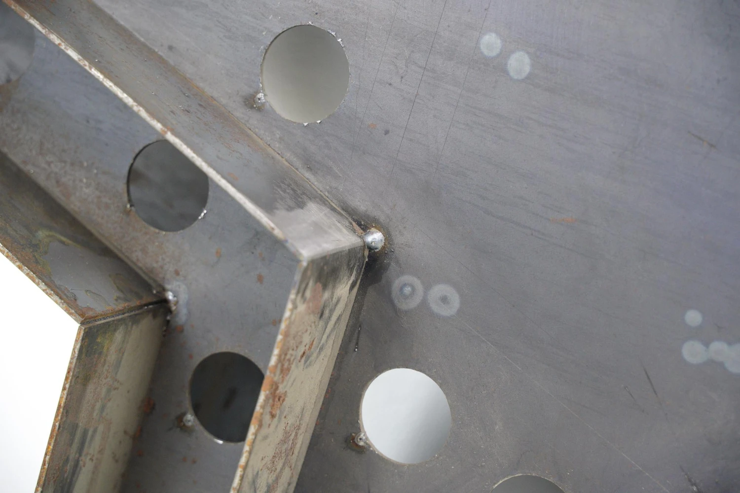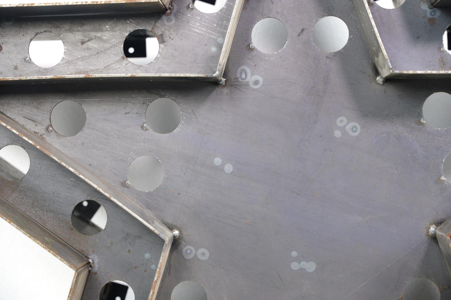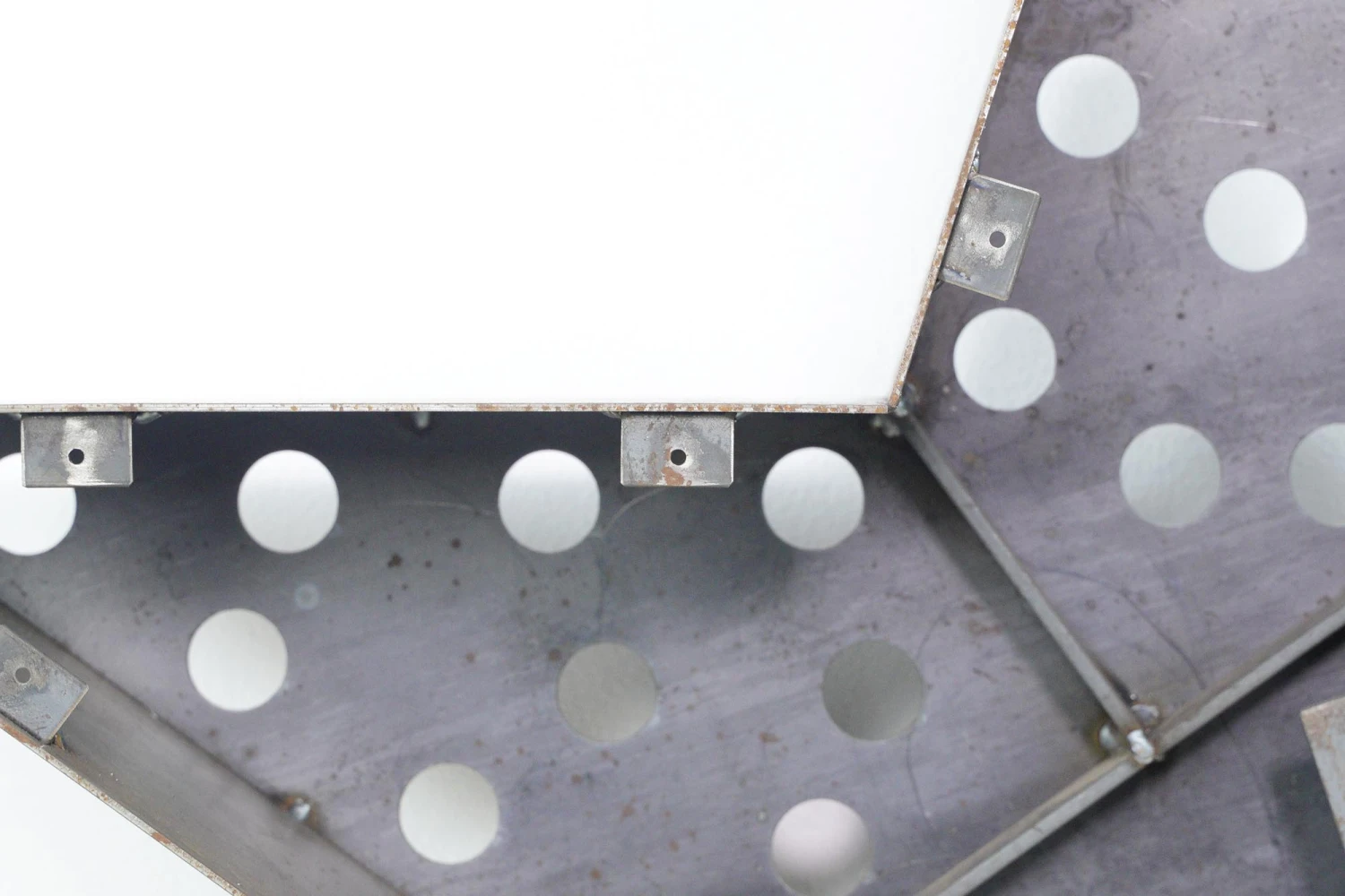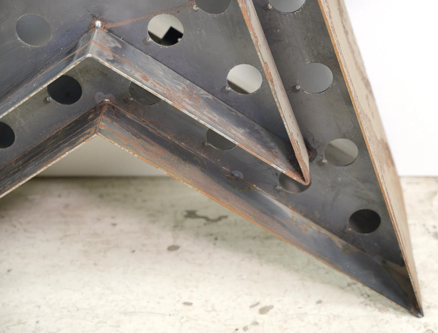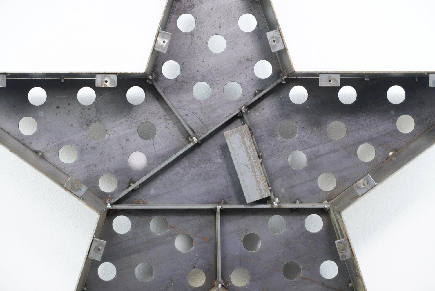 This custom made star shaped light with a steel frame offers a unique and eye-catching design. It provides structural strength, versatility, and aesthetic appeal for various architectural and decorative applications. They are in good condition, with some rust. Priced each. This listing is sold as just the frame with no lights. To view this with the multi speed bulbs included, view L199070.