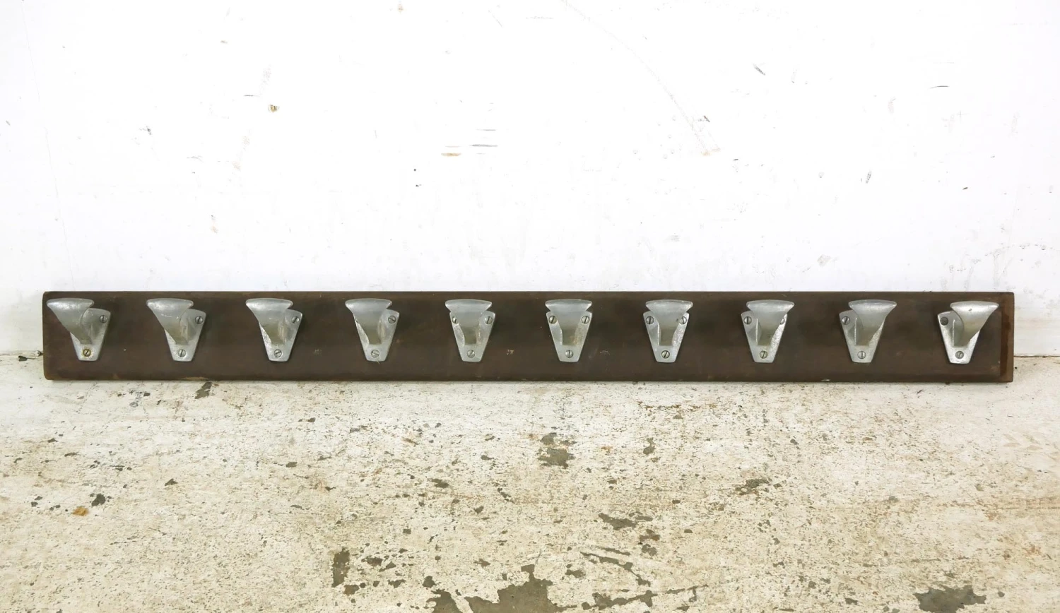 Vintage European dark tone wooden back rack with ten aluminum single arm hooks. Good condition with surface wear from age. One available.