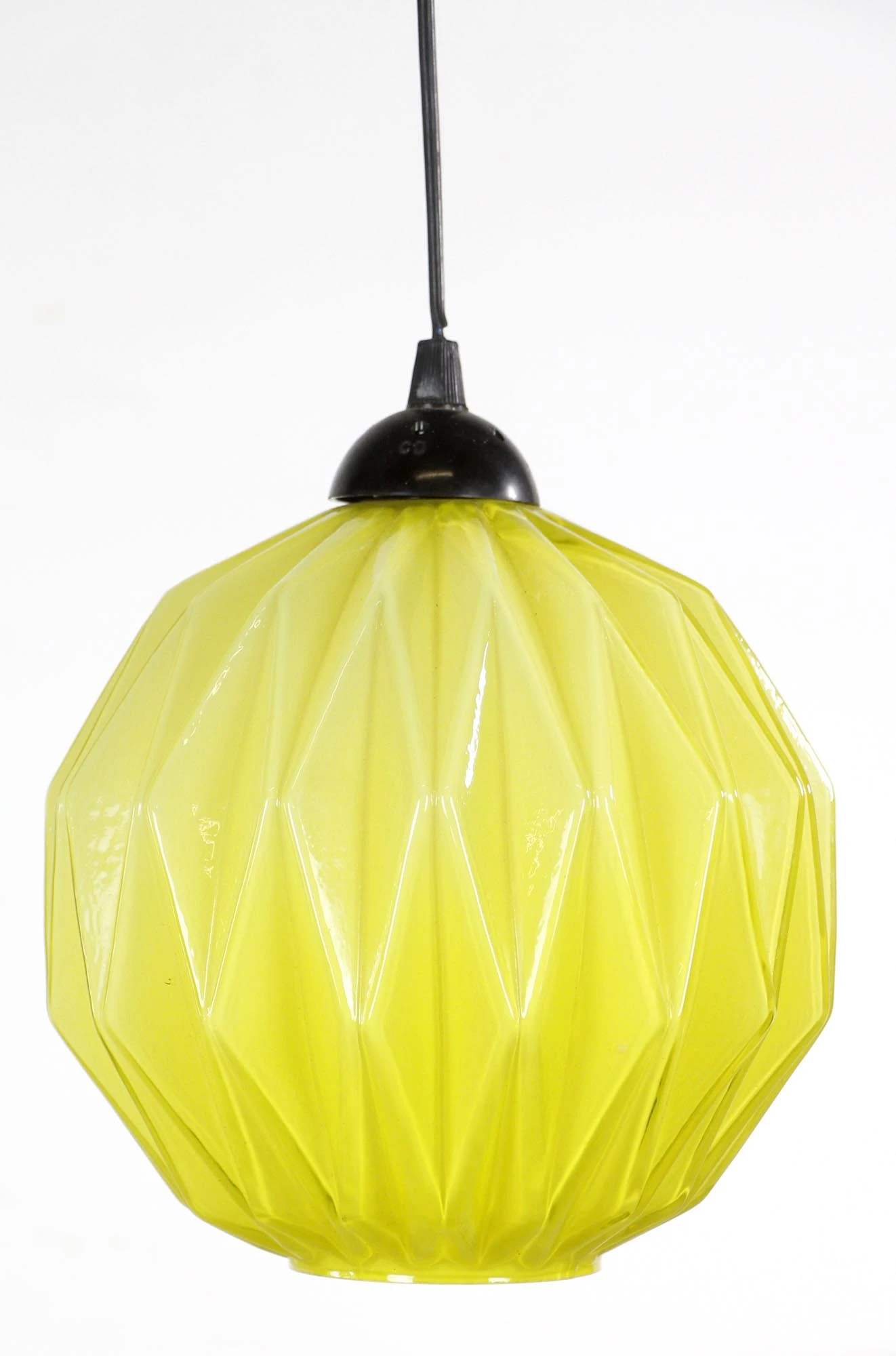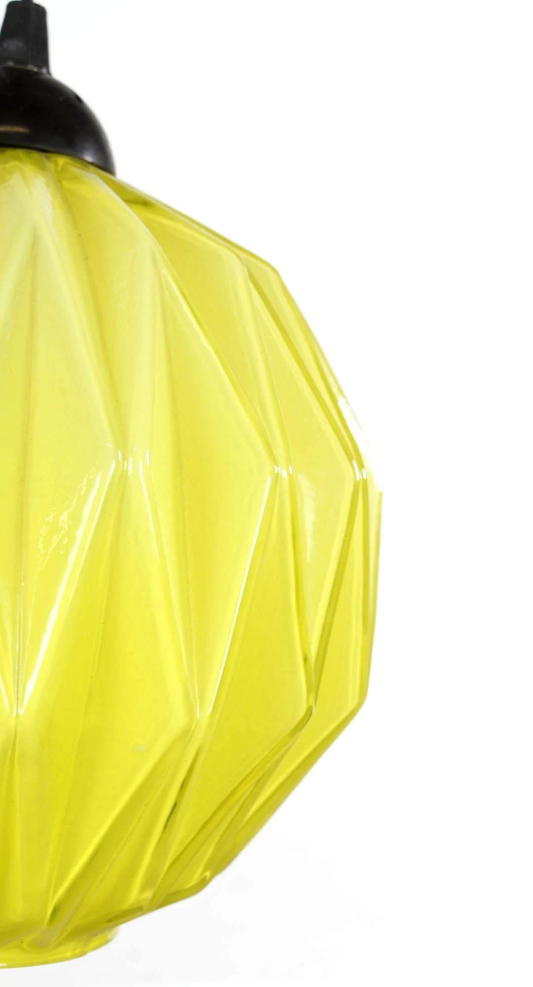 This European pendant light embodies Mid Century Modern aesthetics. Featuring a yellow geometric glass shade and a black cord. This is in good vintage condition. The price includes restoration of cleaning and rewiring. One available.