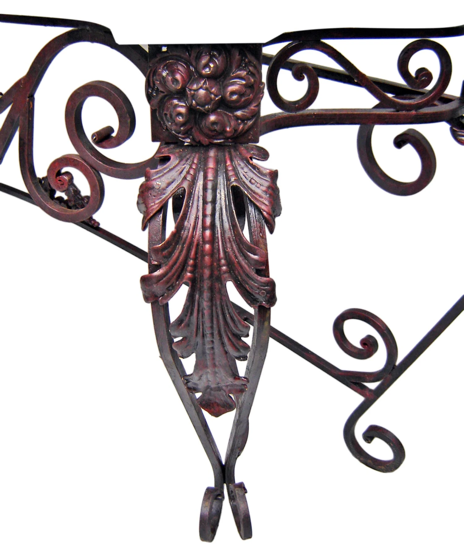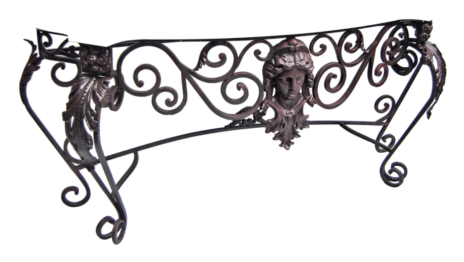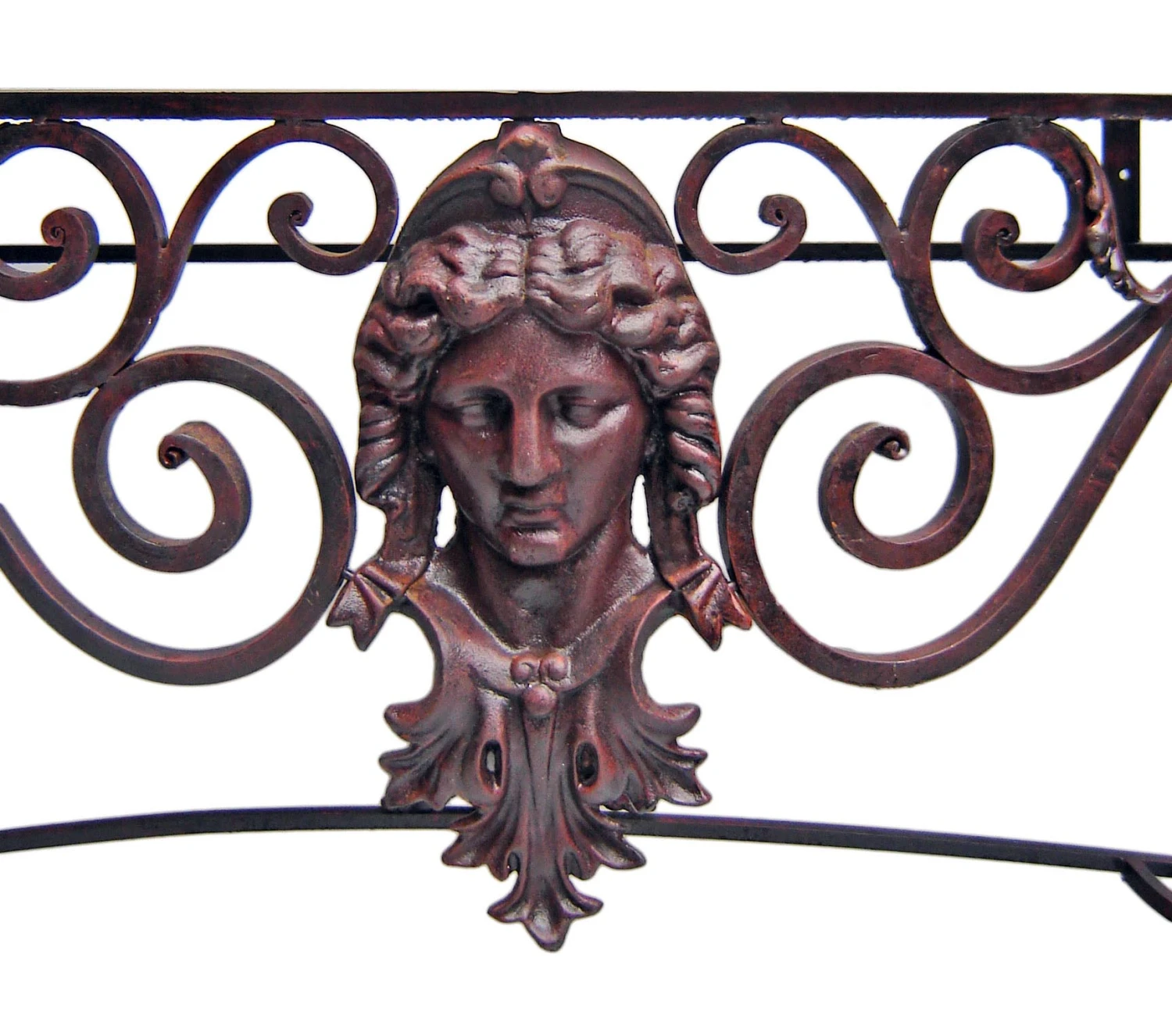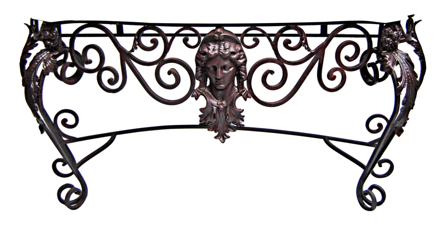 Wrought iron console with antique marble with a cast iron woman’s face in center.