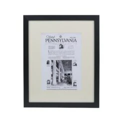 Matted black and white photo of an illustrated French article of the Hotel Pennsylvania in New York City. This is framed with black composite and Plexiglas. There are mounting hooks for a wire attached to the back. Priced each.