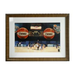 Matted and wood framed photograph of Liberty vs. Shock WNBA tip off photo at Radio City Music Hall 7-25 2004. There is a mounting wire attached to the back.