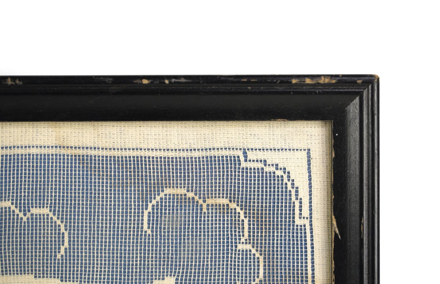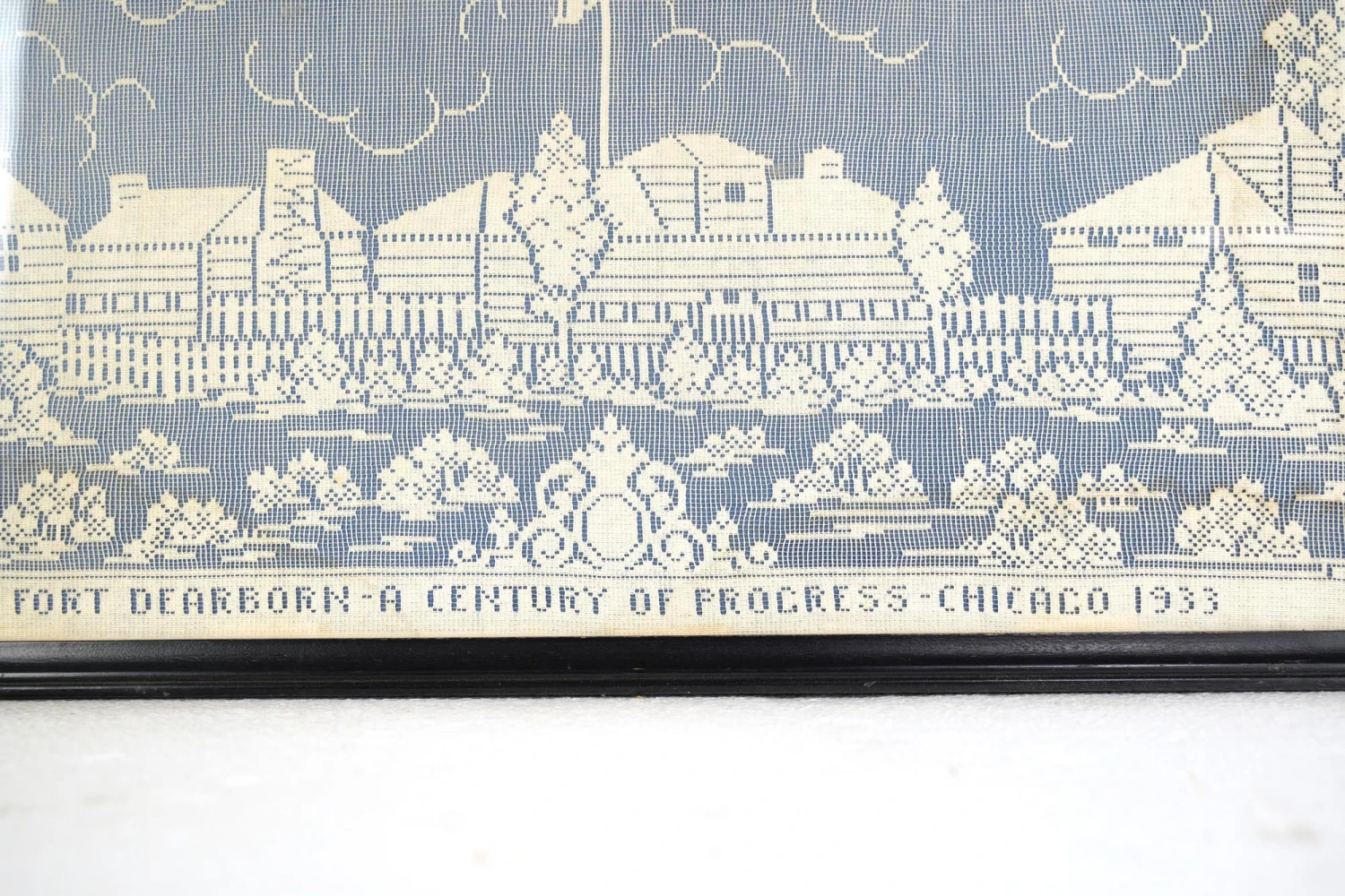 Inscribed “Fort Dearborn – A Century of Progress – Chicago 1933”. Folk art style blue and white lace piece in a black wood frame. Fort Dearborn was a wooden stockade built in 1803 on the south bank of the Chicago River. The fort was the U.S. Armys westernmost outpost in the early 19th century. The glass is intact. There is a mounting wire attached to the back. This is in good condition, with some staining.