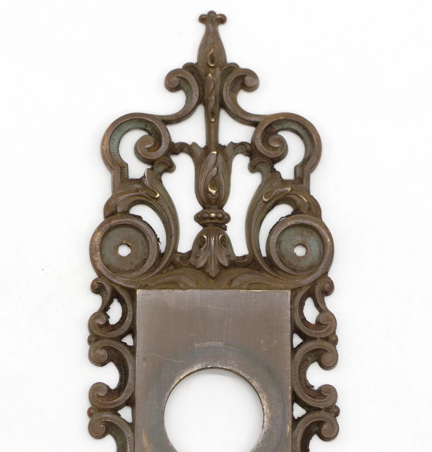 Antique brass door plate in a French style with a lock cut out. Good condition with appropriate wear from age. One available.