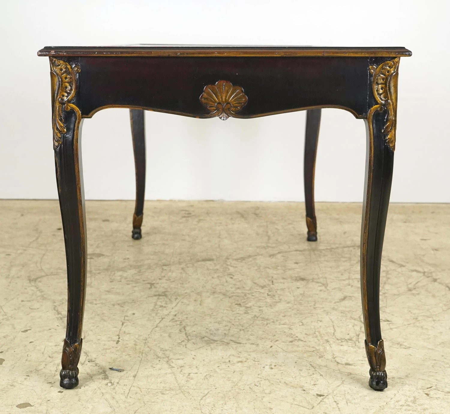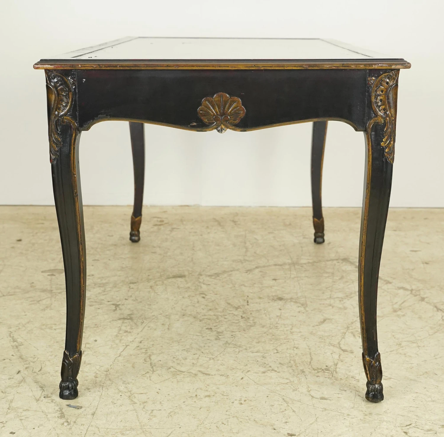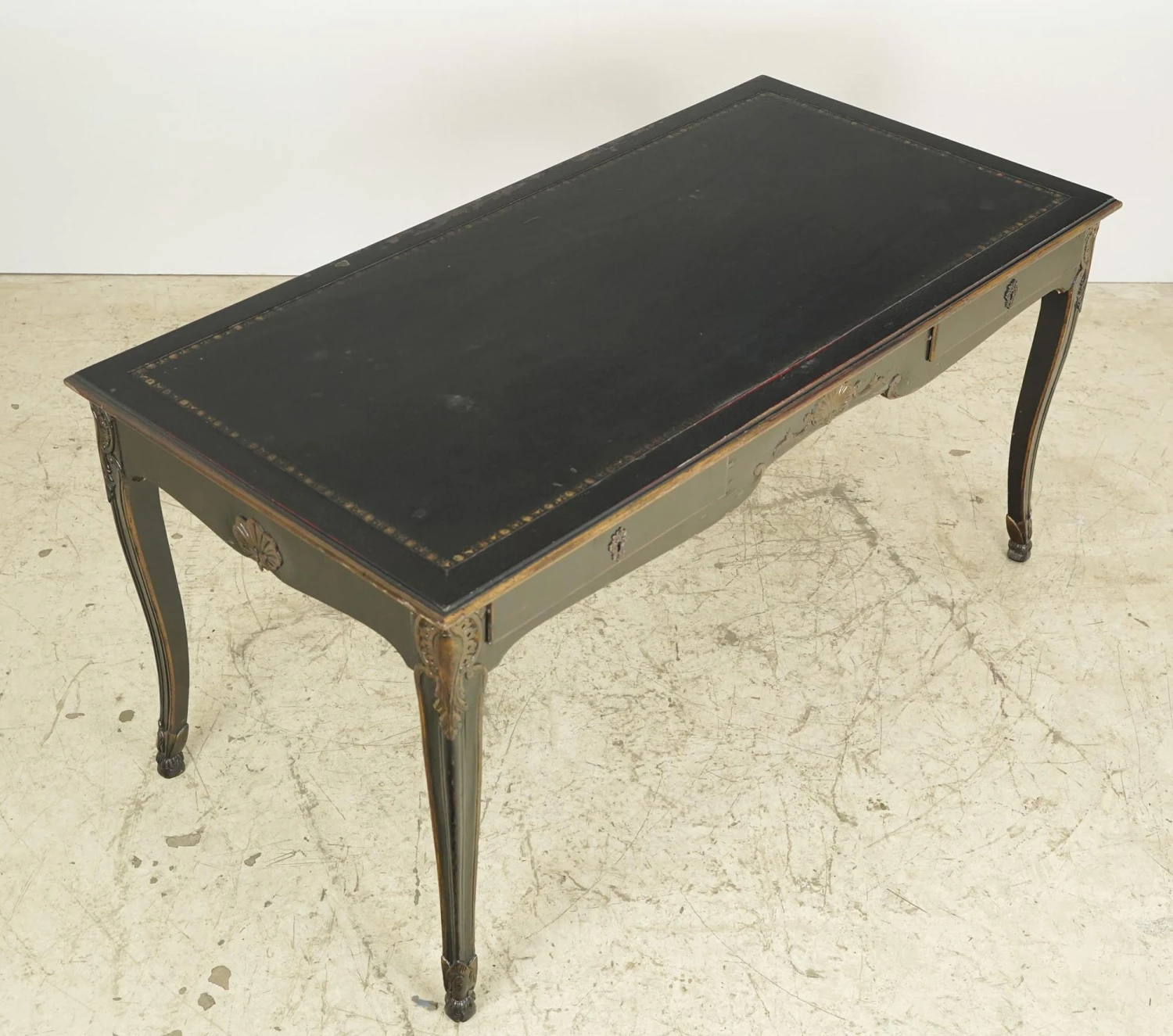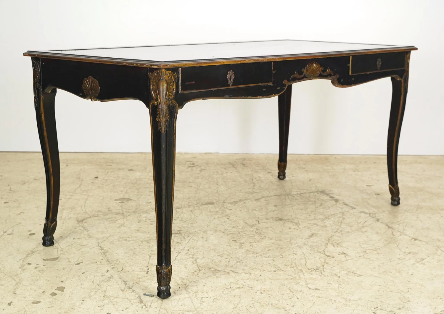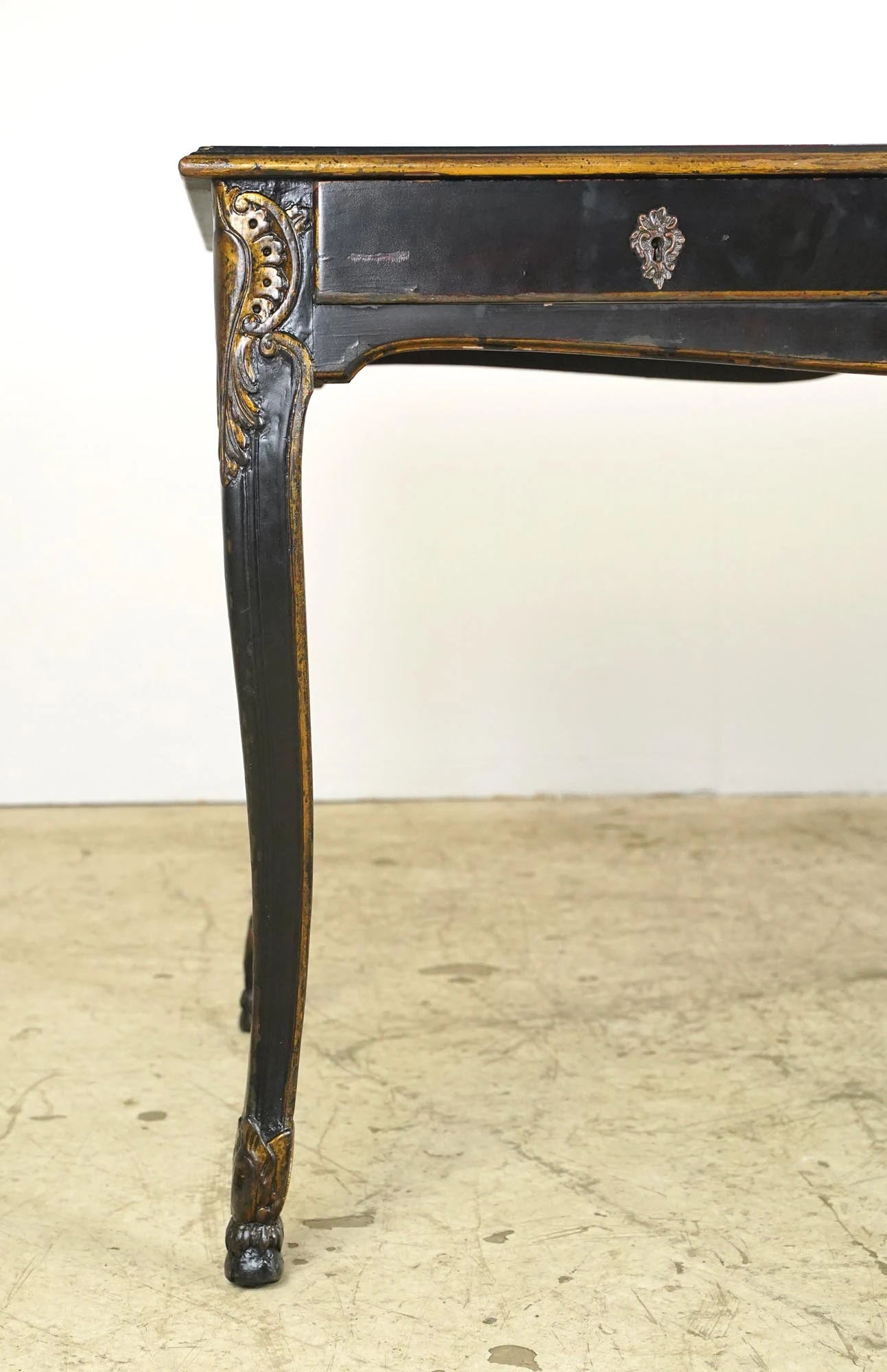 French writing desk made of wood painted black and gold with painted embellishments. It features two drawers with brass keyhole covers. Good condition with surface wear and tear. Please refer to the pictures for a full view of the condition. One available.
