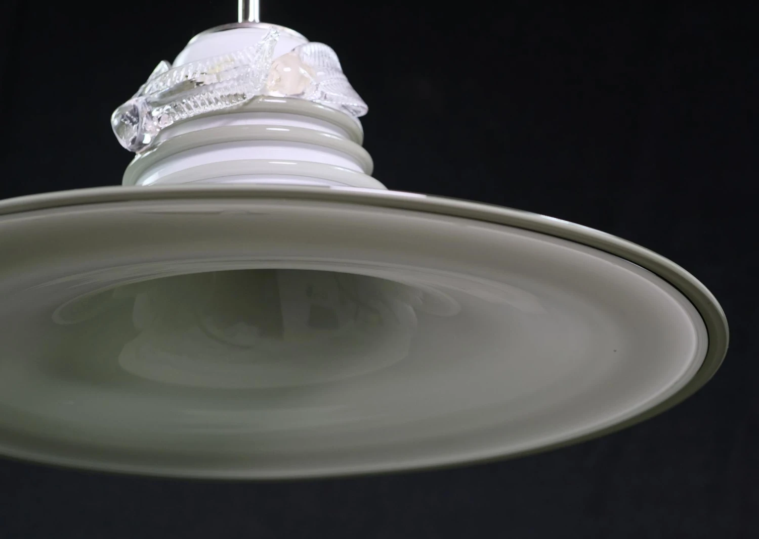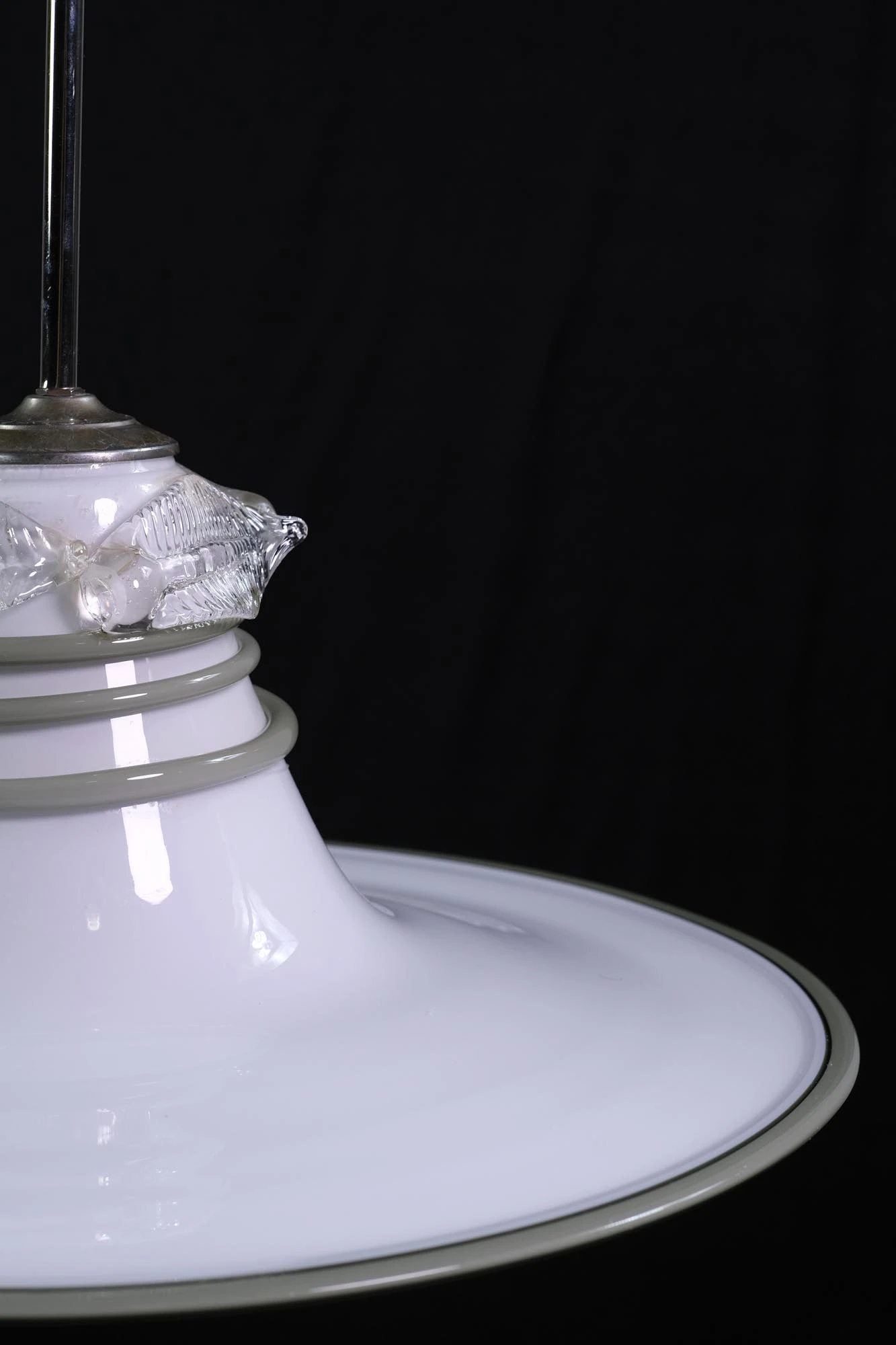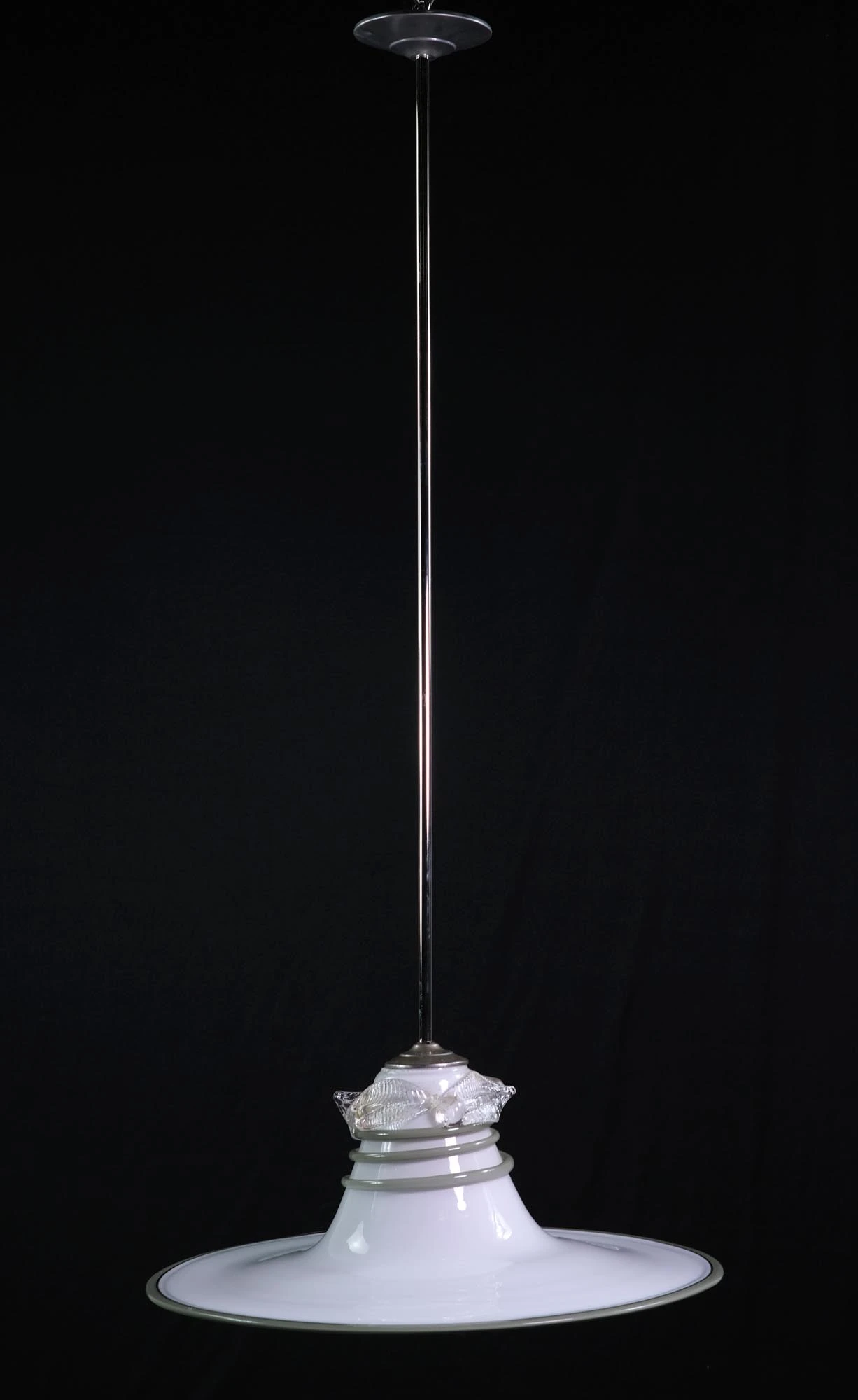 White, gray, and clear Vetri Murano glass pendant light with coil and leaf detail. This is attached to a nickel plated pole and canopy. The glass was hand blown in Italy. The price includes restoration. Please specify the overall drop that is needed upon purchasing.