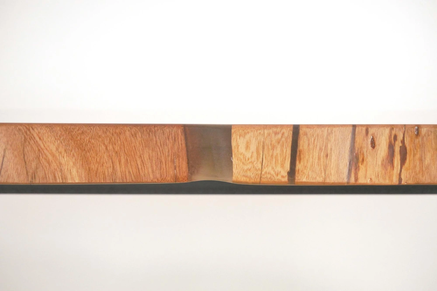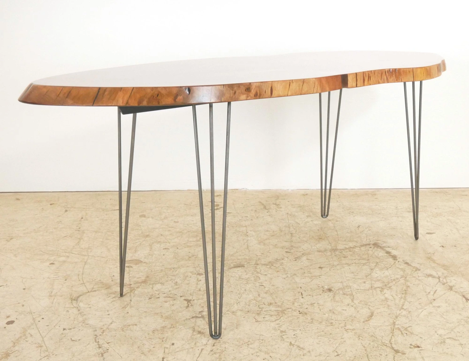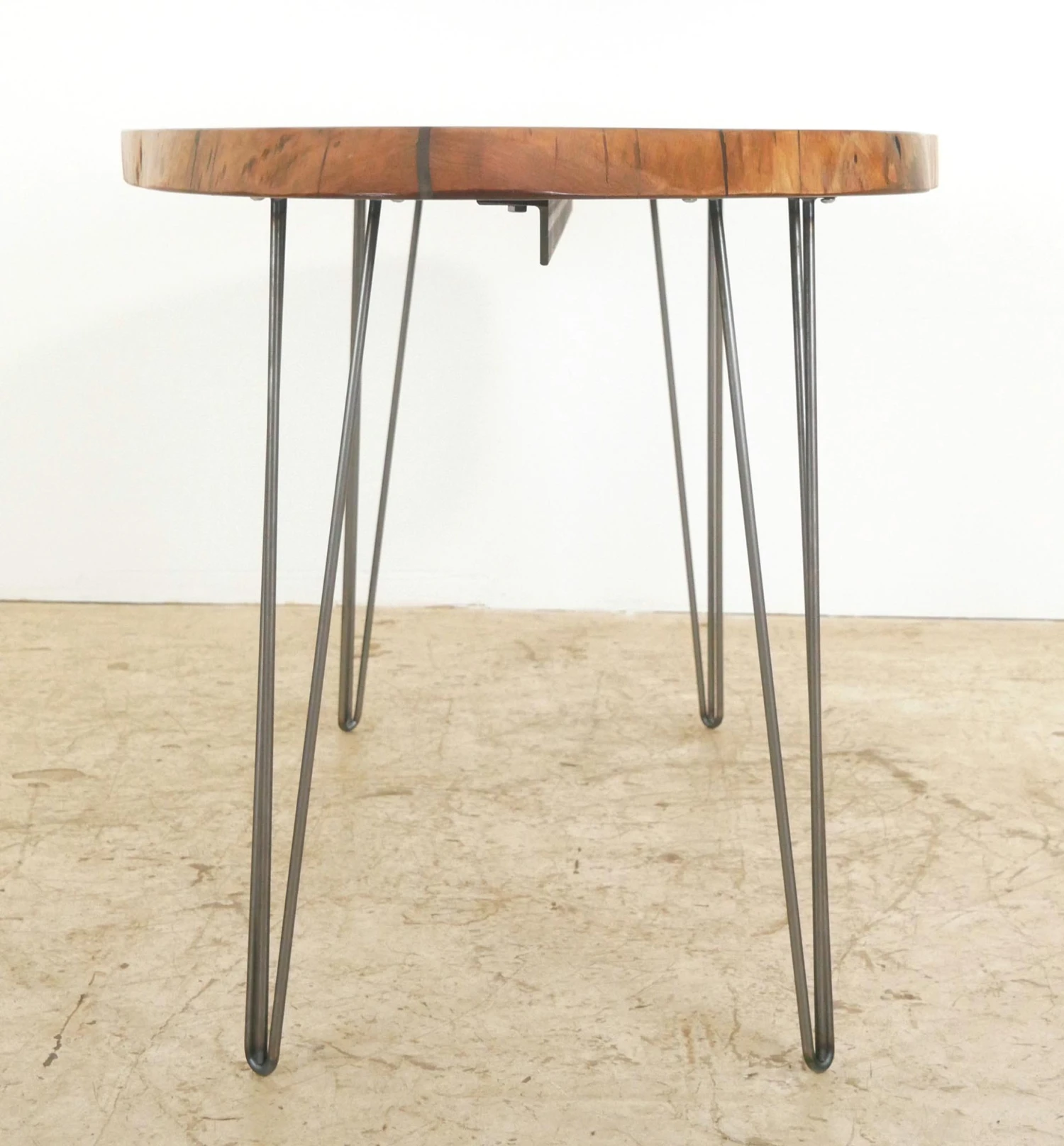 The top is made of mahogany wood that was salvaged from trees felled in Hurricane Wilma in 2005 in southern Florida. The black hairpin legs are made of steel. Epoxy was used to create a seamless surface. This piece was handcrafted in our table shop in Scranton, PA. It is ready to ship. One available.