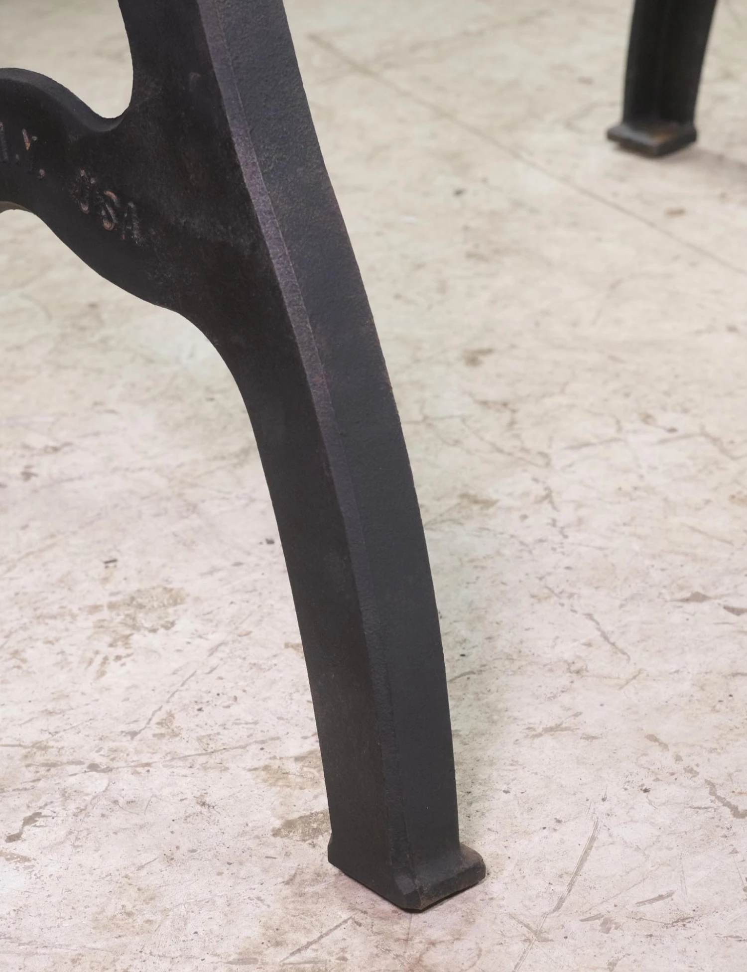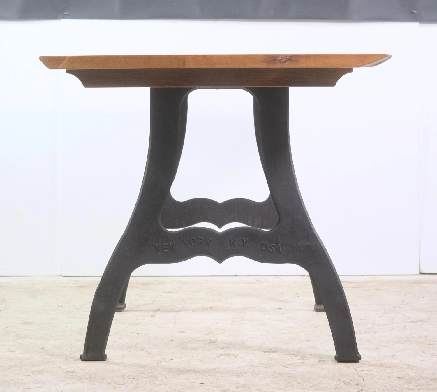 This table features a light tone maple top paired with cast iron New York legs. There is a slight twist. This table is ready to ship.