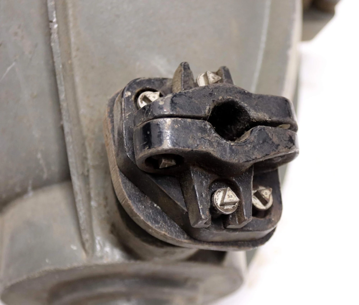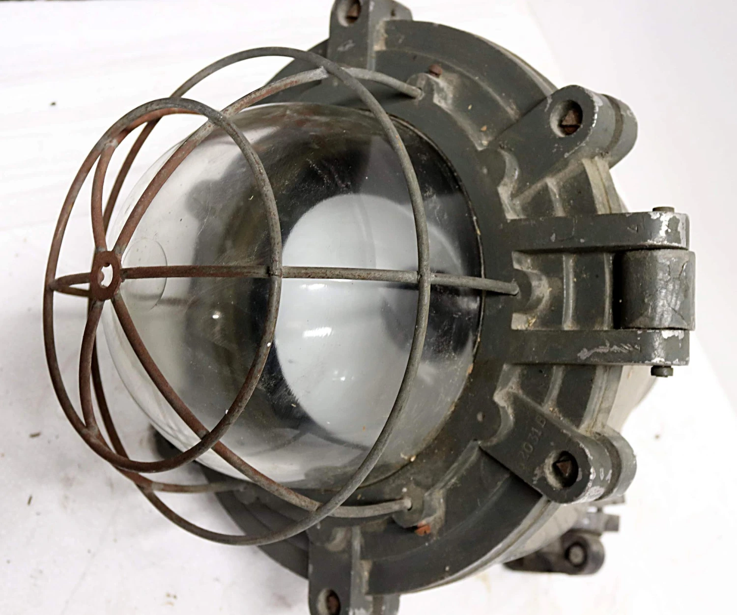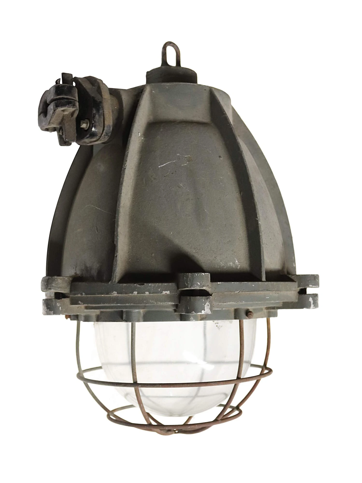 Vintage aluminum industrial style light with cage covered glass. This requires one bulb and will need rewiring. One available. Price includes rewiring and pole fitter to customer’s specified length.