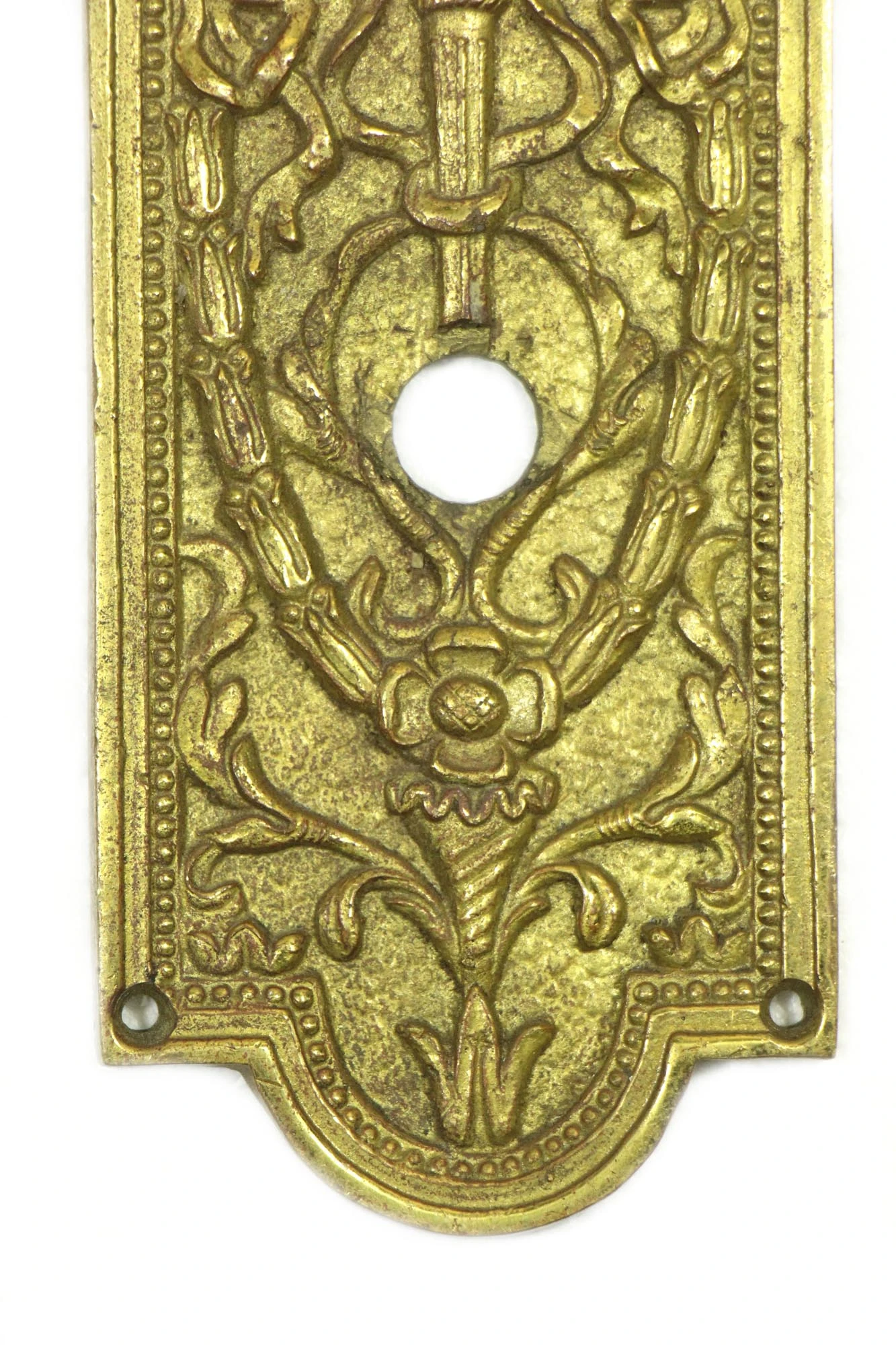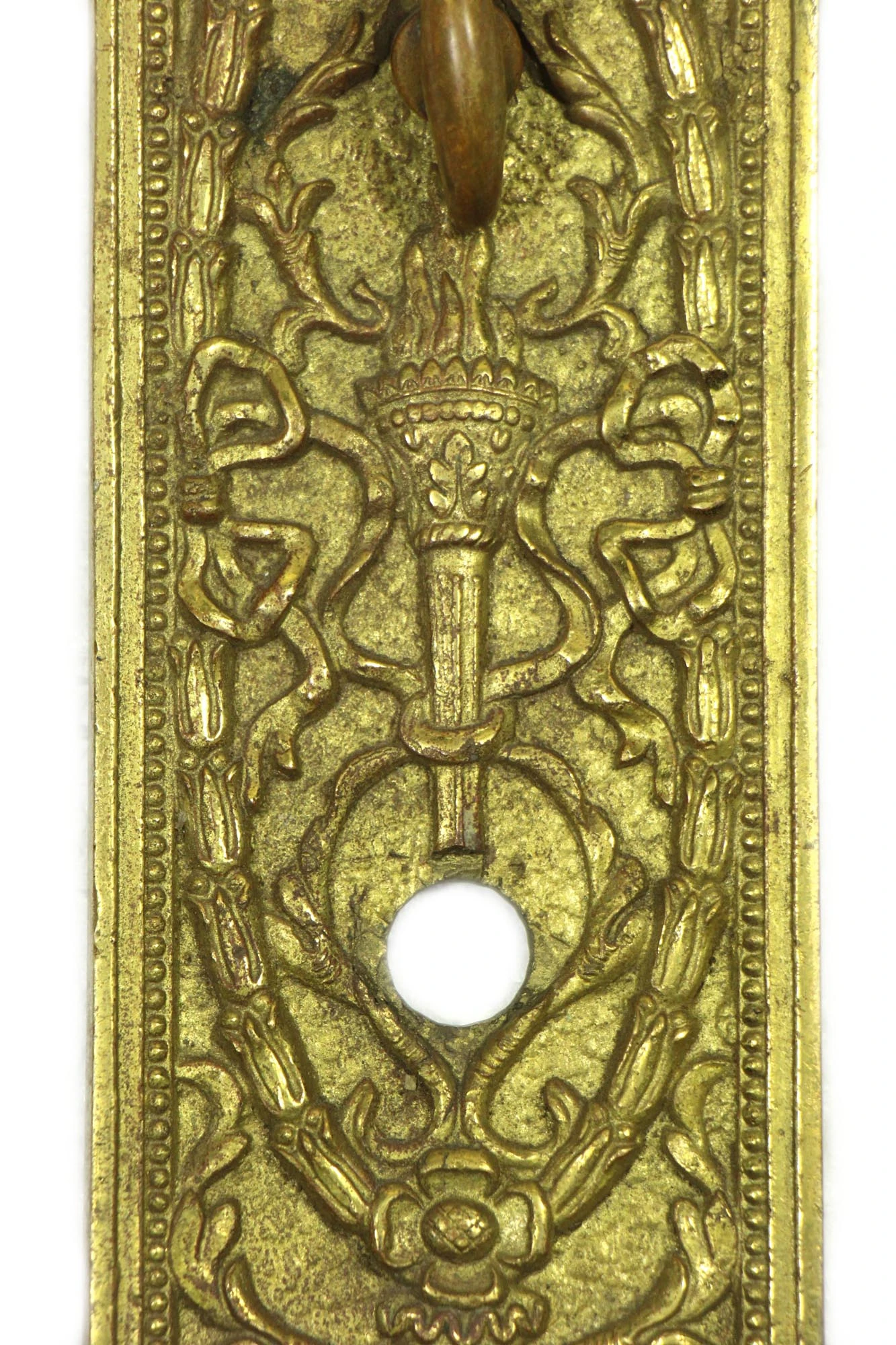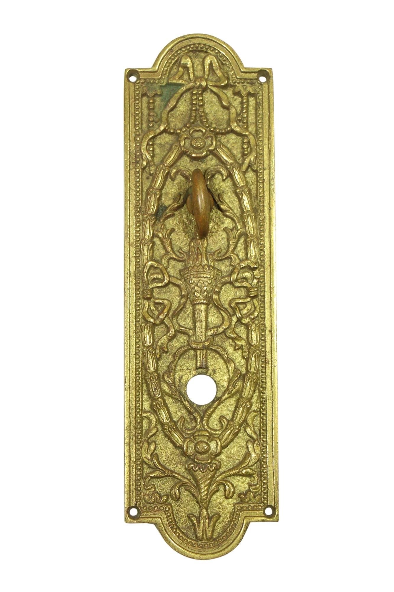 Great quality and very intricately designed door plate with a torch motif centered on the face of the plate. One available.