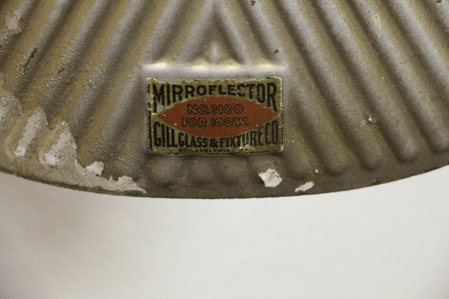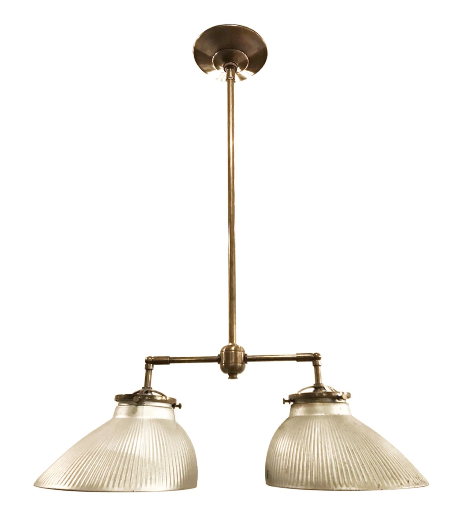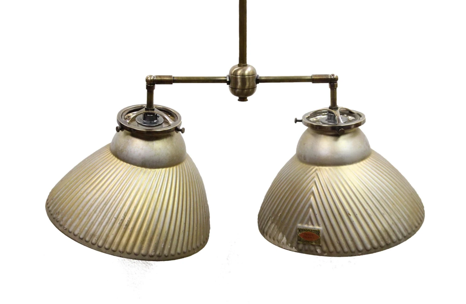 Early 1900s mercury glass permaflector shades on a double arm newly made brass pendant fixture. This requires two standard medium base bulbs. The price includes restoration of cleaning and rewiring. Priced each.