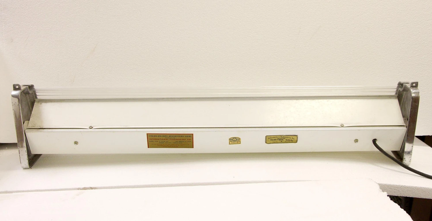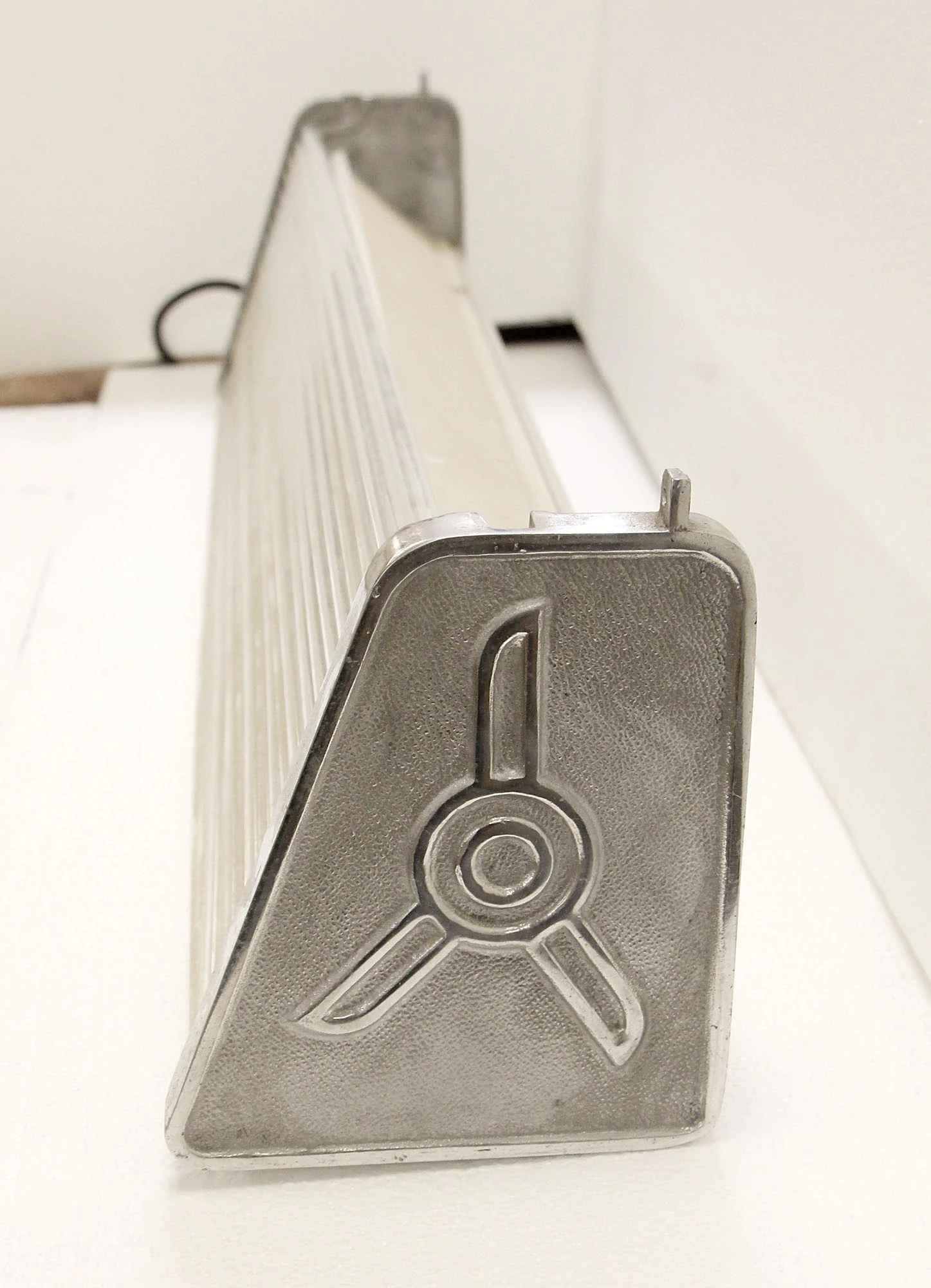Industrial wall mount fluorescent light fixture with an Art Deco nickel frame. They are old new stock, meaning they have never been used. Priced each.