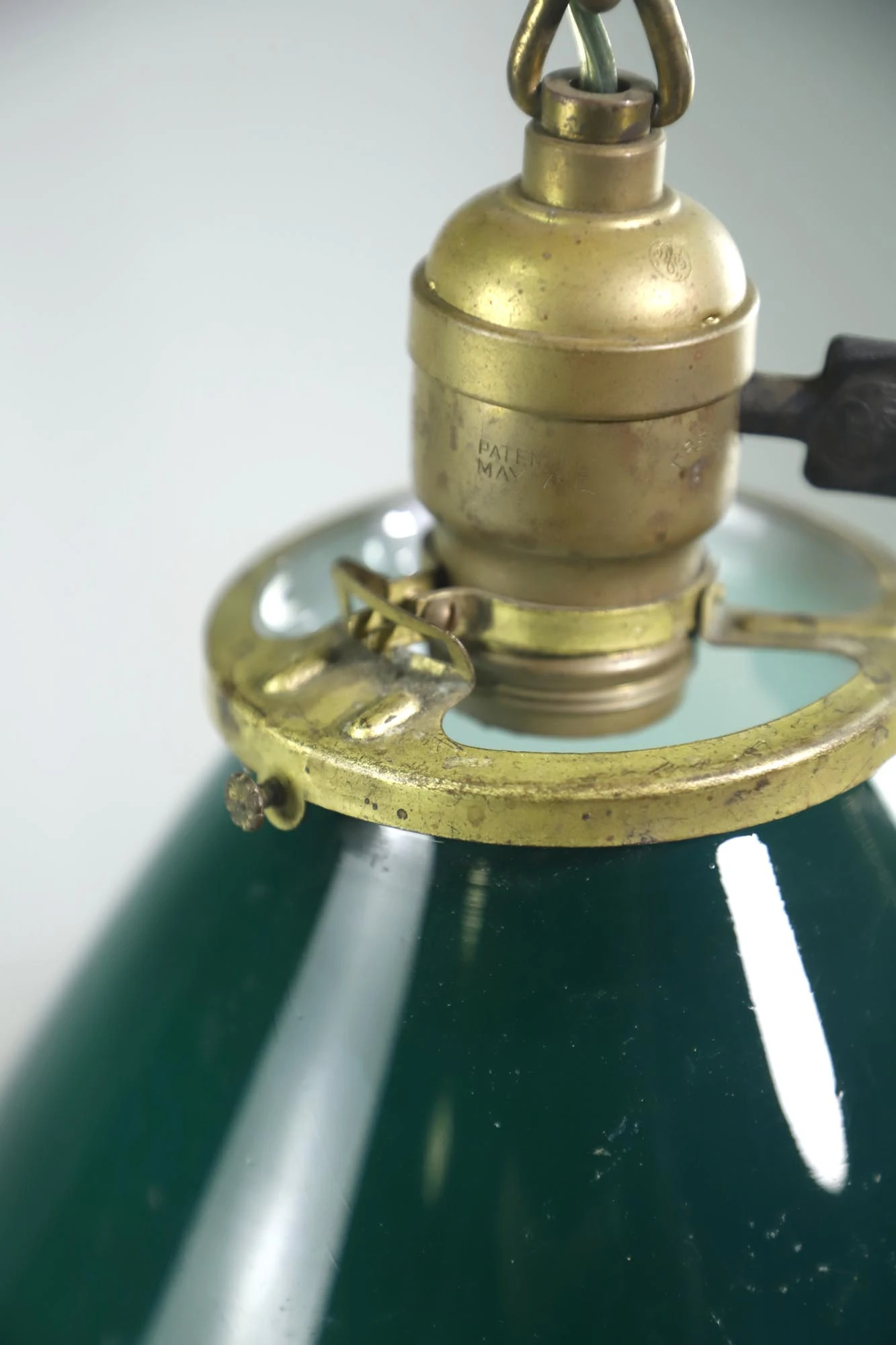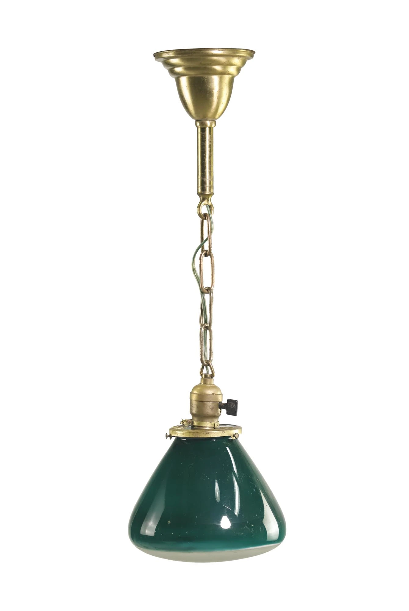 Small green glass pendant light with a clear frosted glass bottom and brass chain and canopy. This light has new wiring. The price includes restoration of cleaning and rewiring.