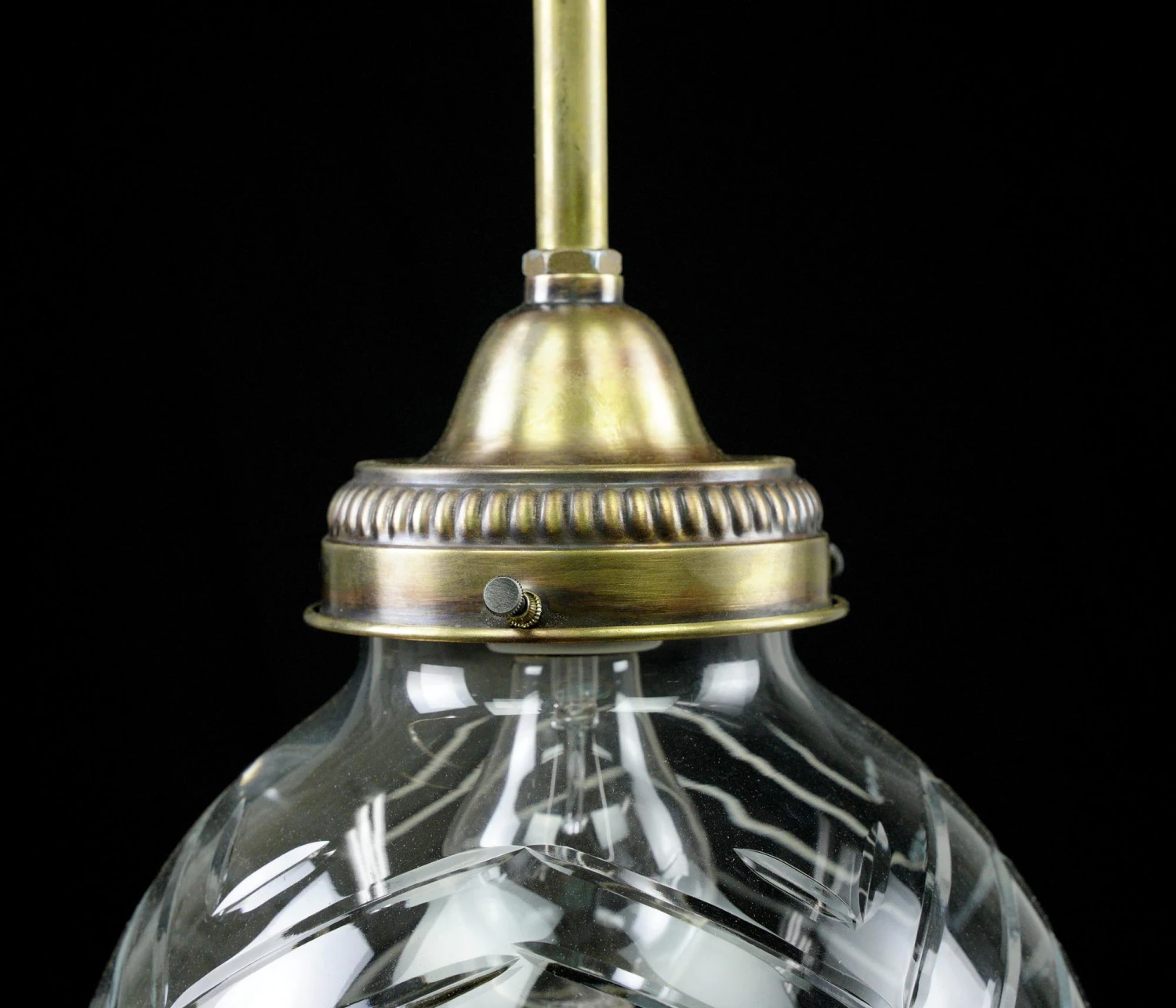 This pendant light combines elegance and craftsmanship. With an egg shaped crystal globe adorned with chevron etching and paired with a polished brass finished steel pole, it showcases Italian design excellence. This pendant light adds a touch of luxury, illuminating spaces with a unique blend of artistic flair and refined aesthetics. This requires one standard medium base bulb. This light is in good condition. The price includes restoration of cleaning and rewiring. Priced each.