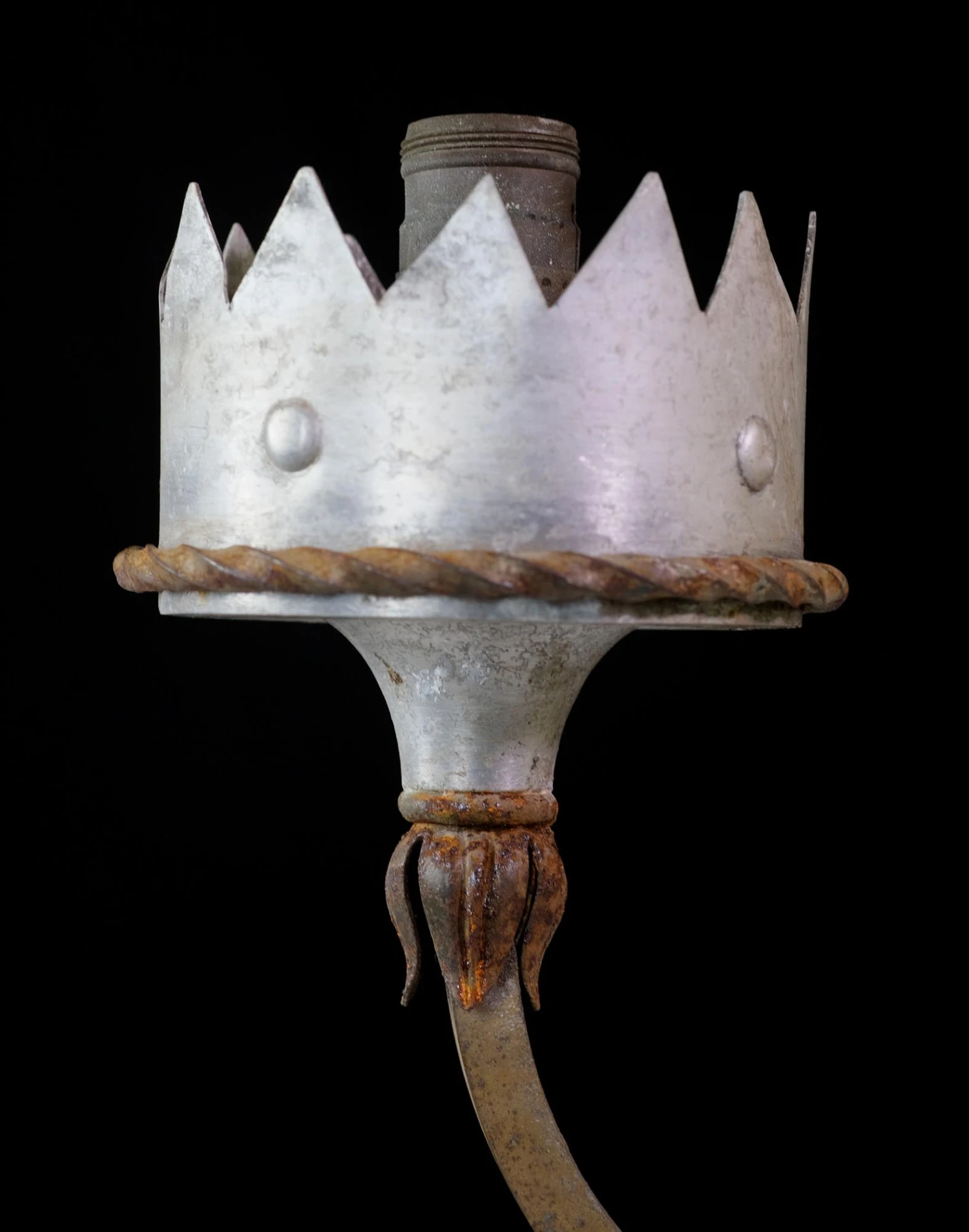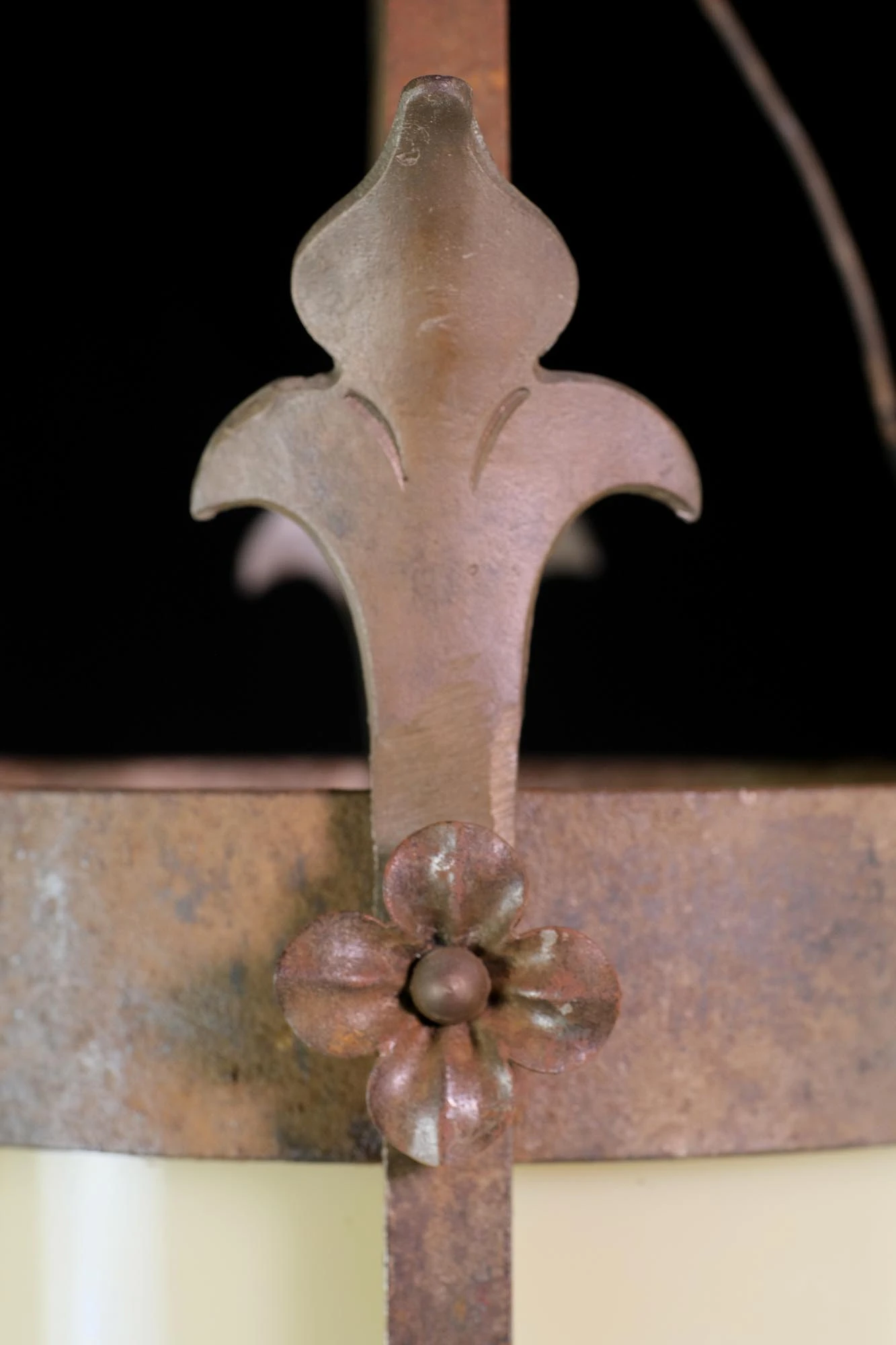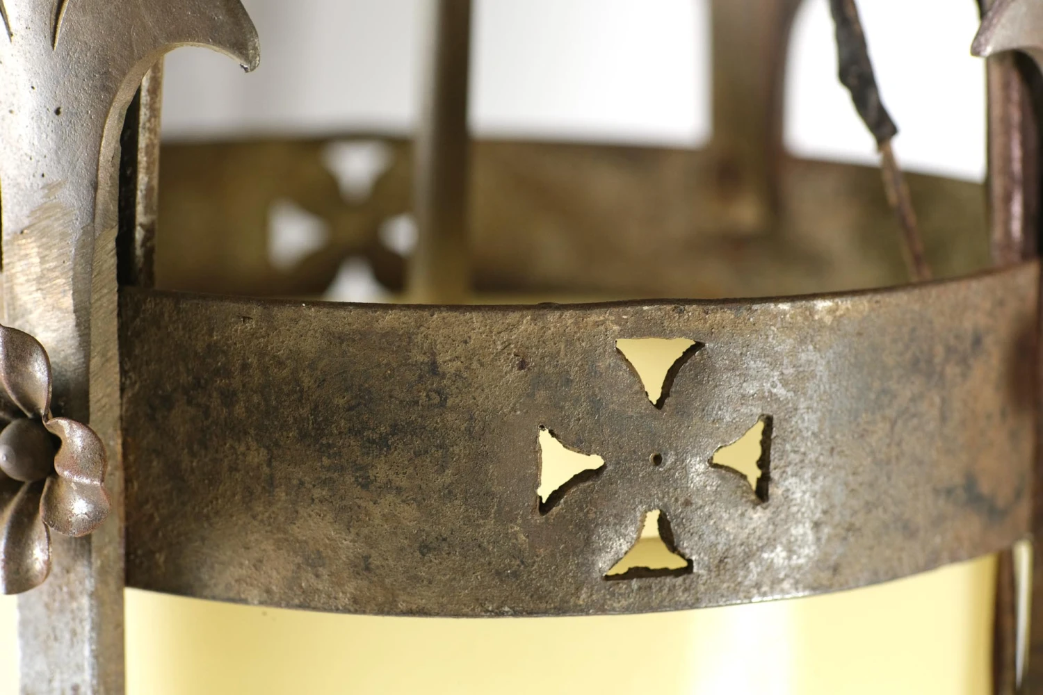 Gothic wrought iron pendant light with hand forged floret, foliage, and aluminum details. The glass is a warm muted yellow color. The light has five sockets total, one being on the inside. There is some rust from age. The price includes restoration. Priced each.