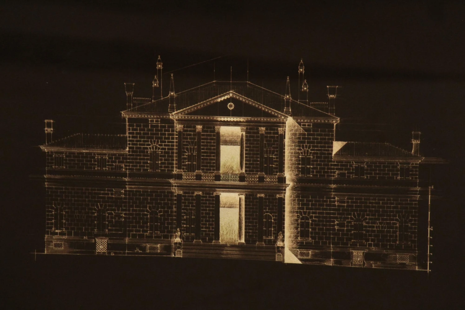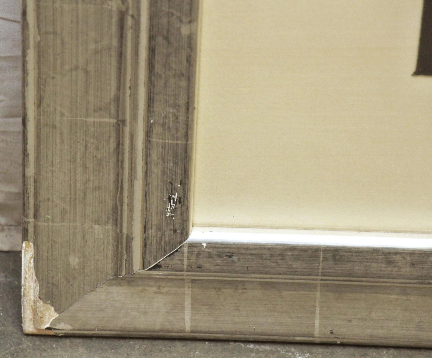 Newly framed rectangular silver painted wood frame with a gray matting encasing a black and white photo of a house.