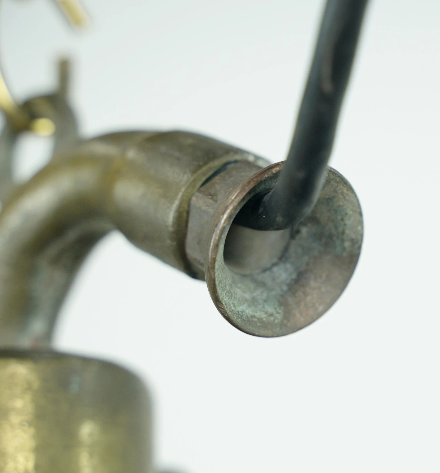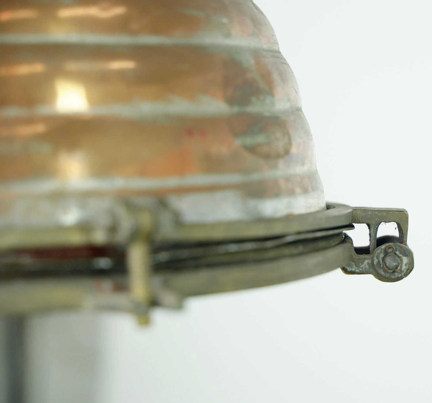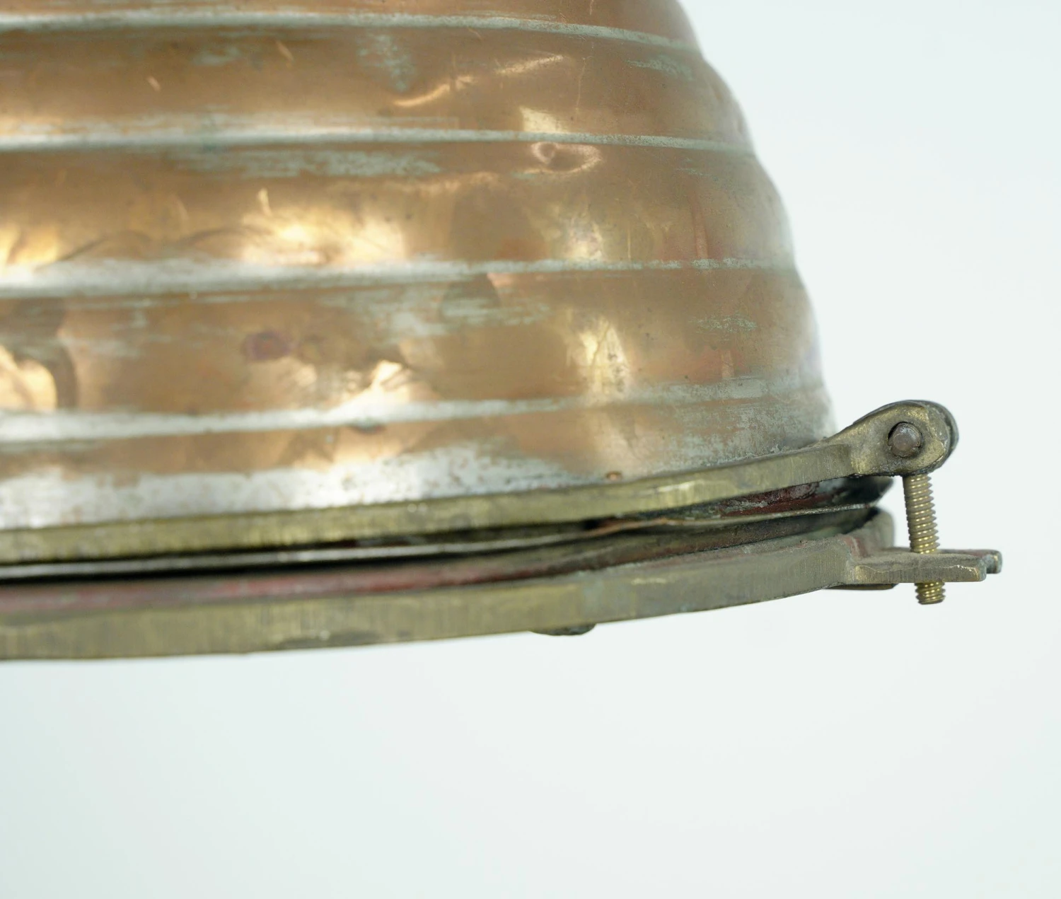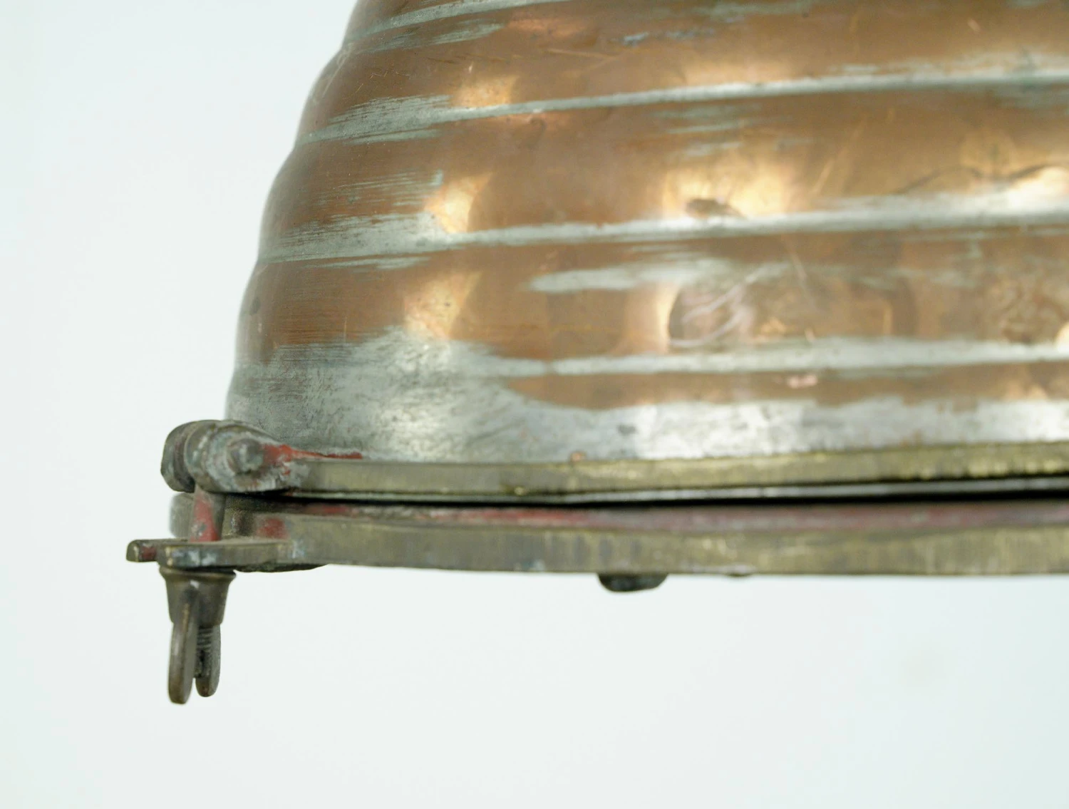 This pendant light combines maritime charm with vintage aesthetics. Crafted from copper and brass, its beehive spotlight design evokes a nautical atmosphere. This pendant light offers a touch of seafaring allure, making it an intriguing and stylish addition to interior decor. This is in good condition, with surface wear. The price includes restoration of cleaning and rewiring.