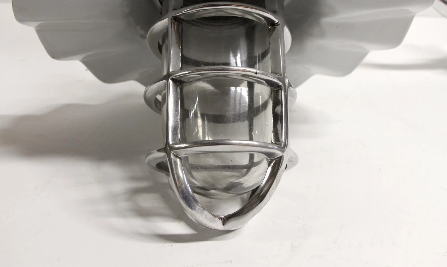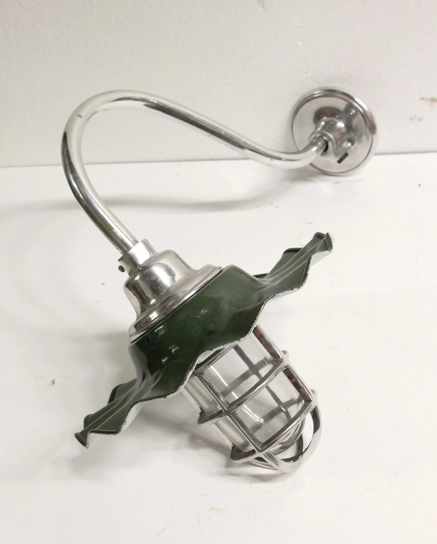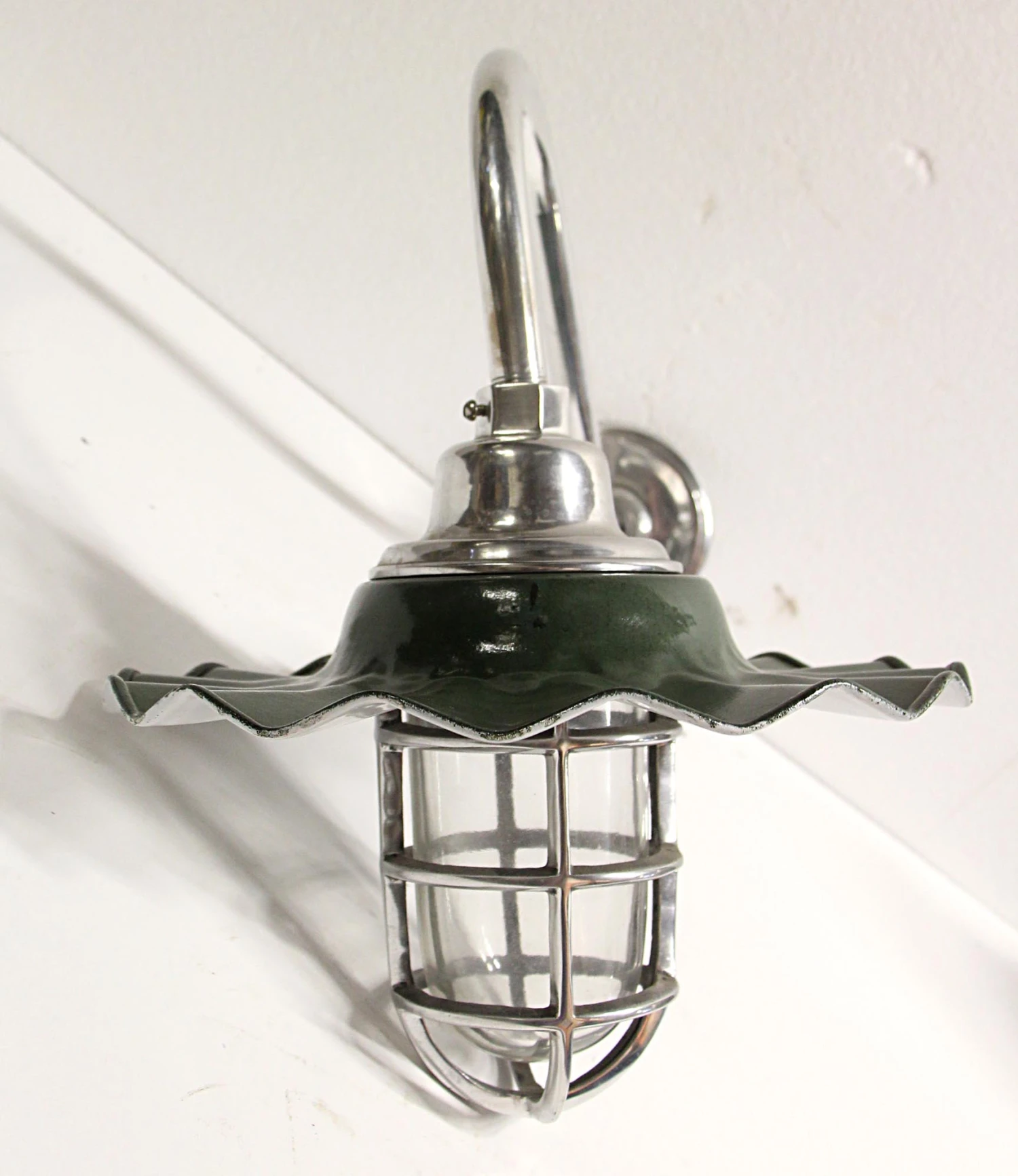 Nautical style cage light sconce with a long gooseneck arm and green enameled shade. The shade is white underneath. Price includes rewiring. Priced each.