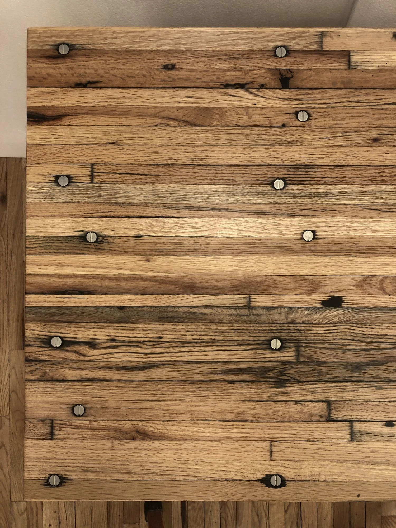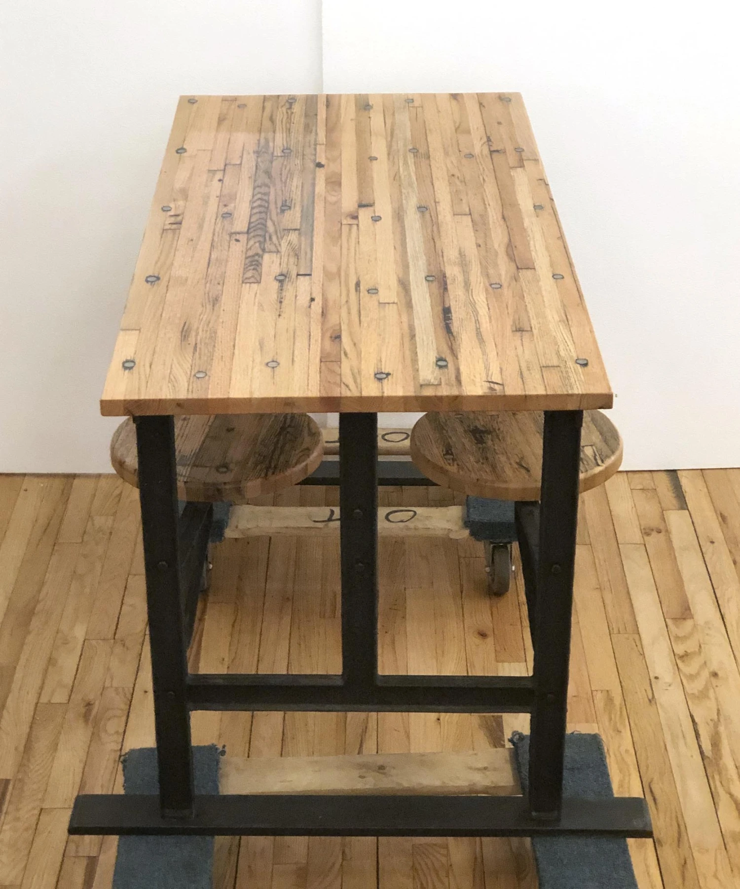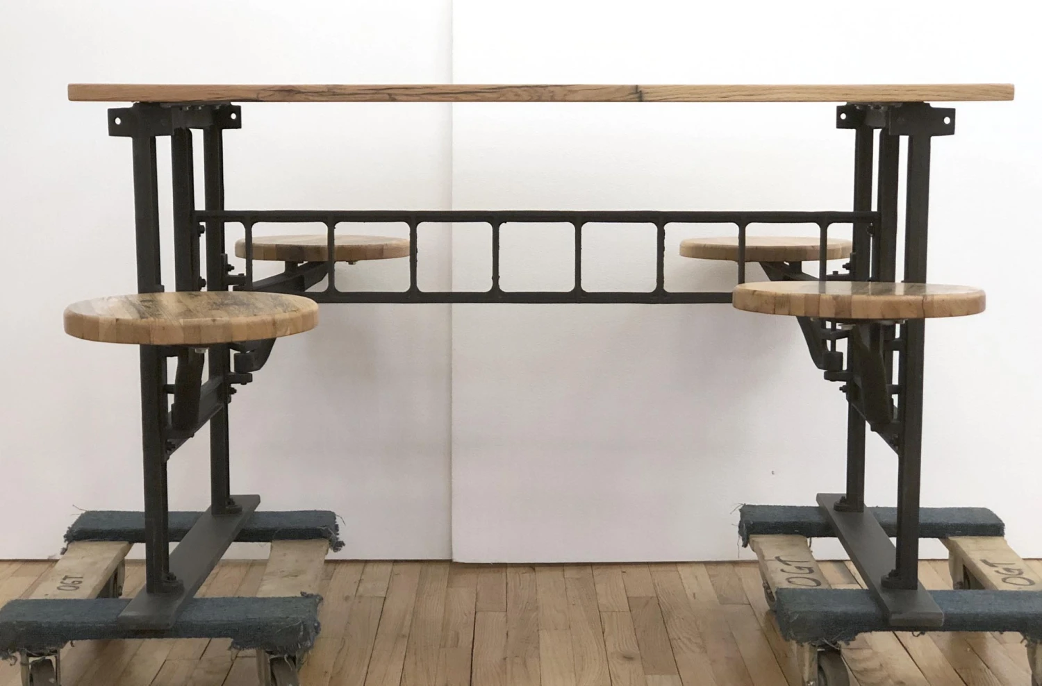 This four seat swing table features four arms that swing in and out with natural finish reclaimed oak industrial flooring top seats. These types of tables were originally very popular in factory cafeterias after WWII and advertised to make happy workers. They were also sometimes used in assembly lines. The base itself has been replicated from an original set we salvaged from a factory. This table is great for small spaces. This is ready to ship.