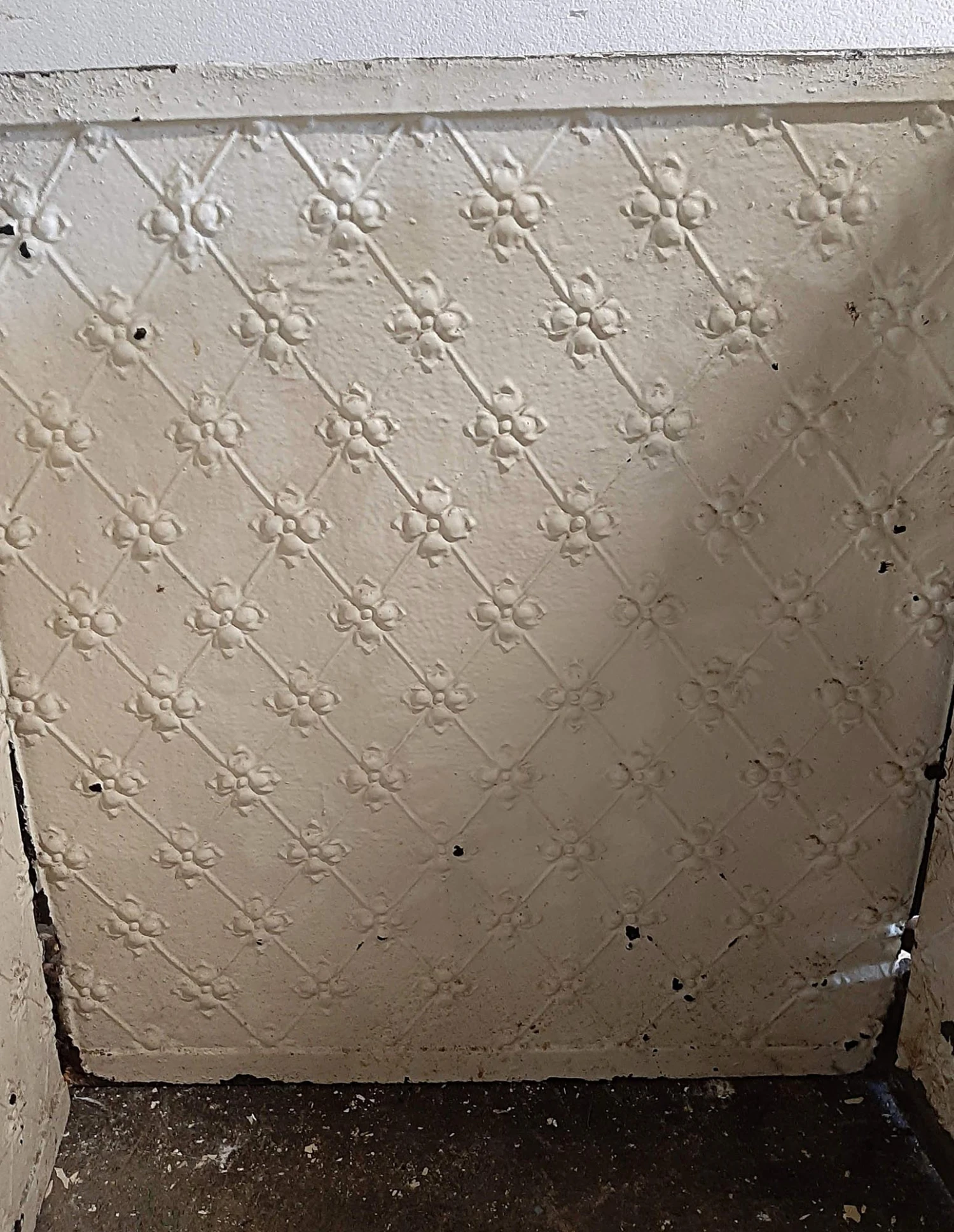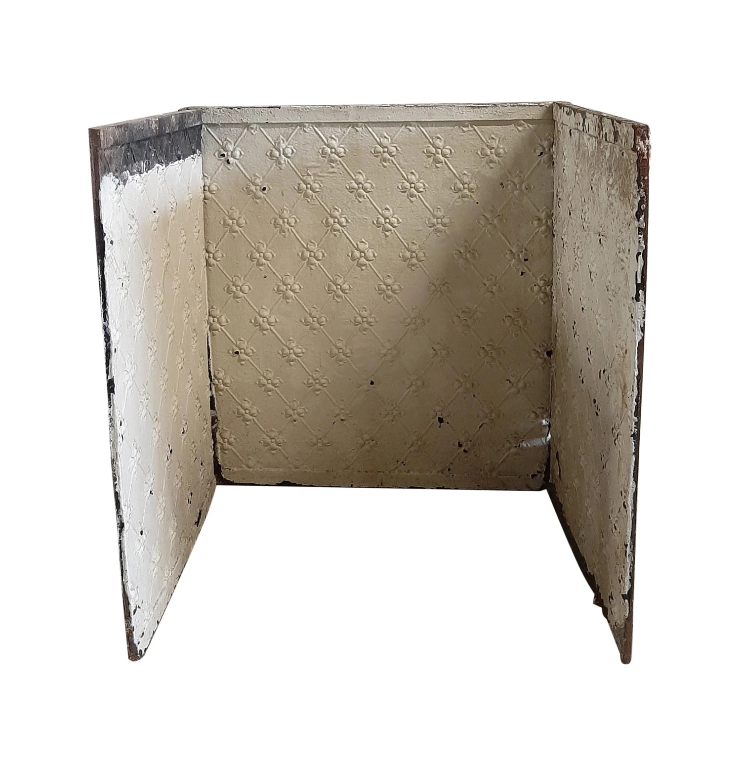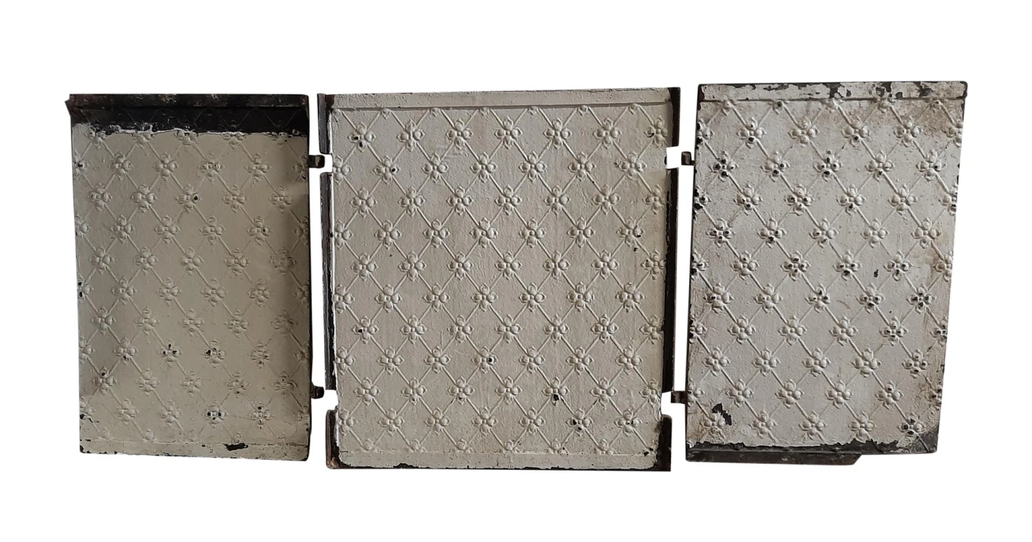 White painted cast iron three piece fire back set with fleur de lis detail. Priced per set.