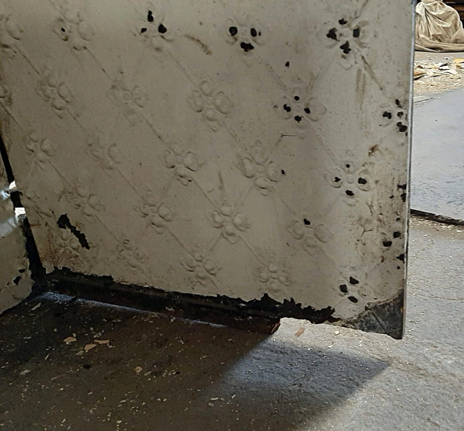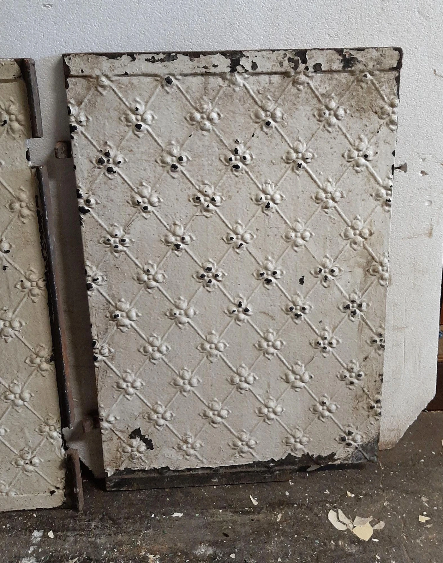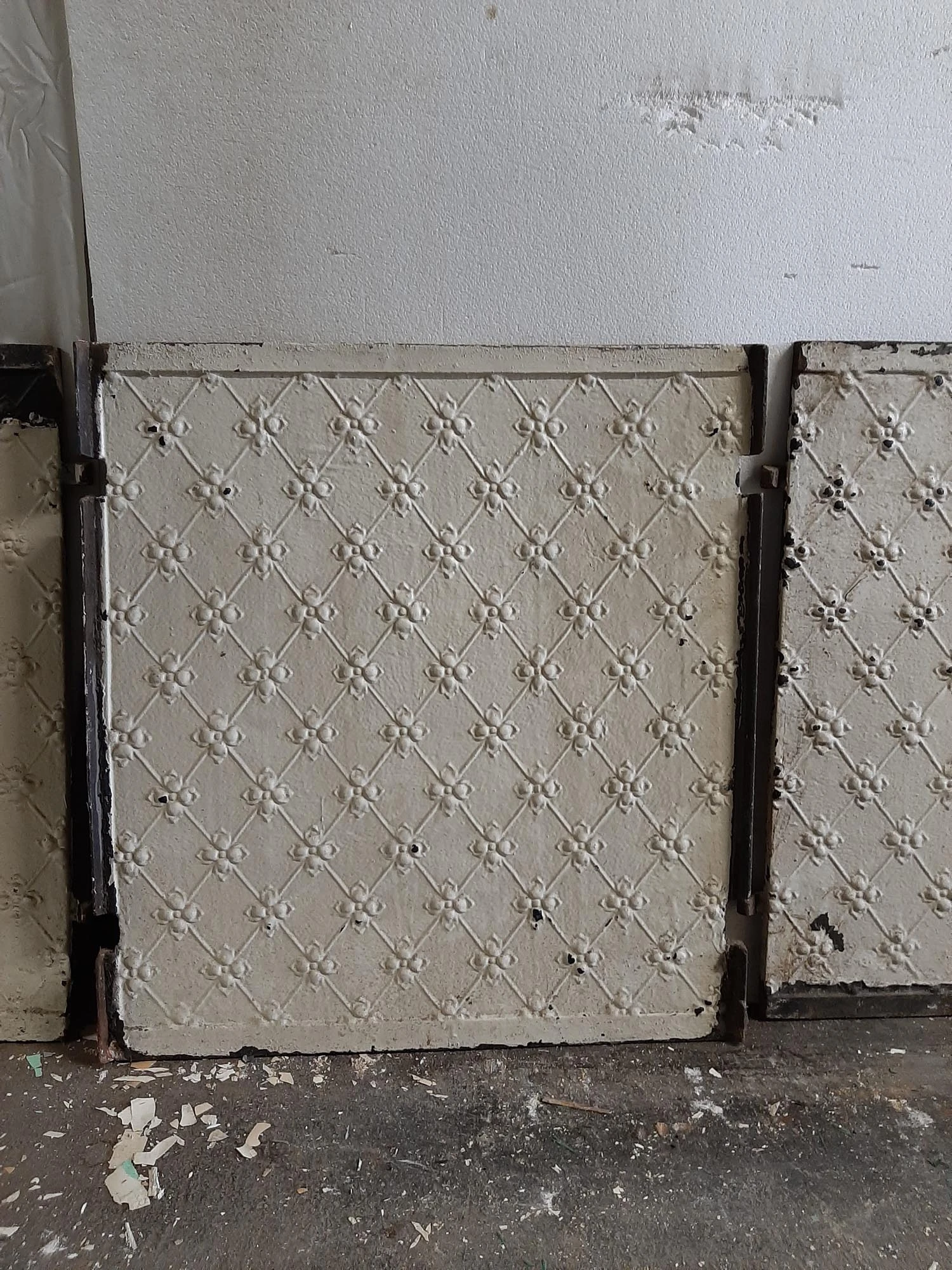 White painted cast iron three piece fire back set with fleur de lis detail. Priced per set.
