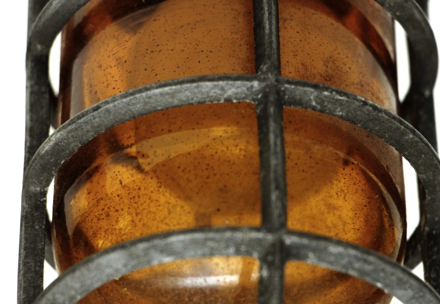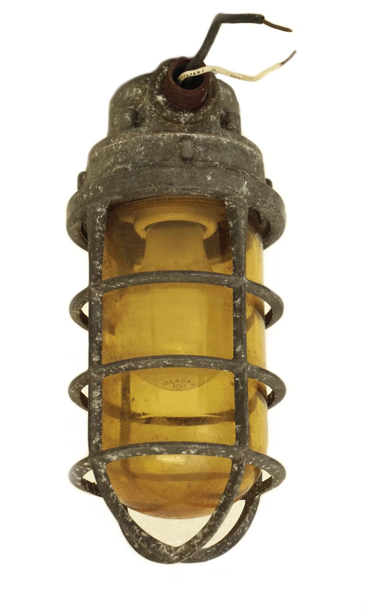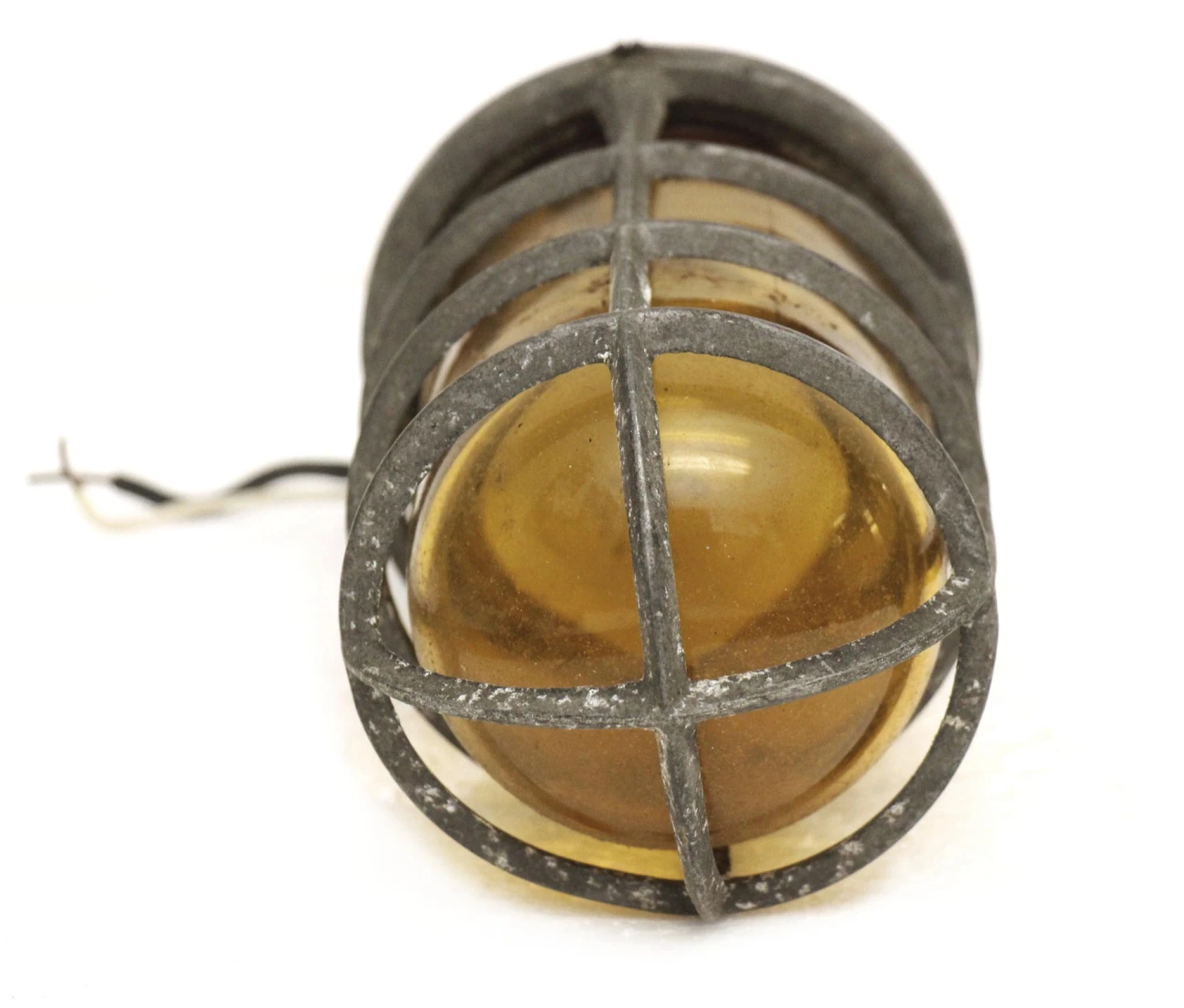 Original cast aluminum ship lights with amber glass. It can be mounted on the wall of ceiling. Price includes restoration.