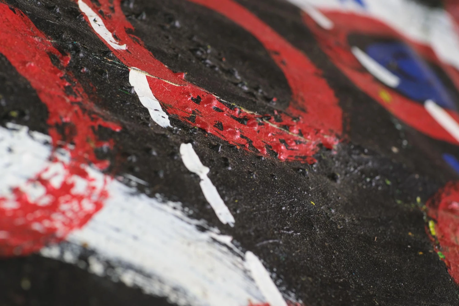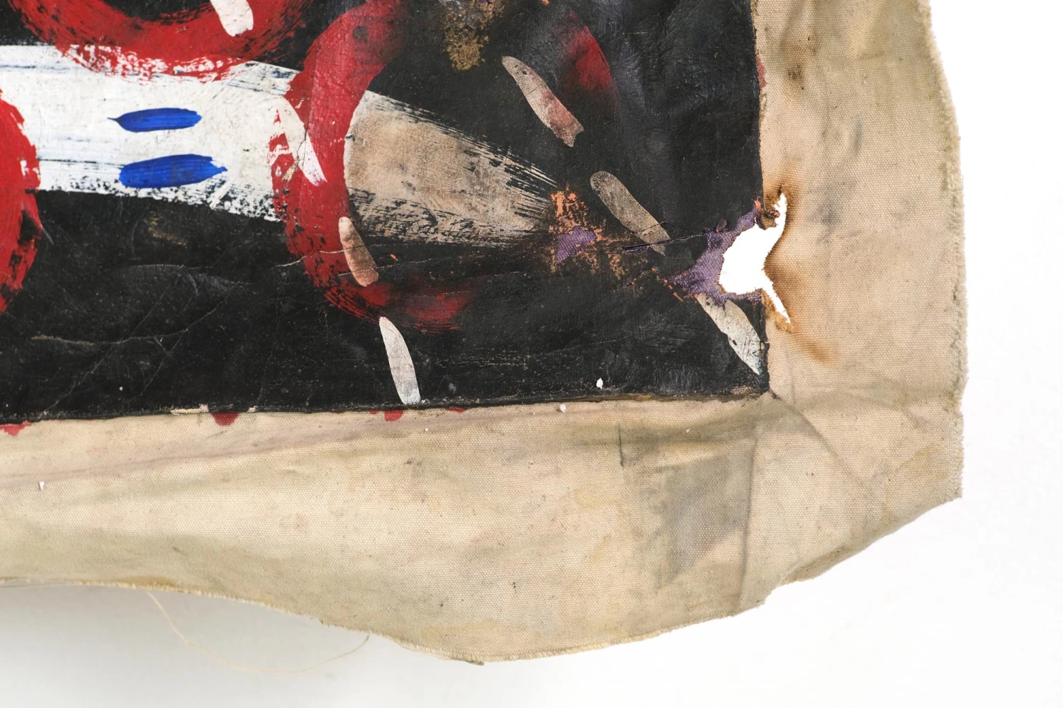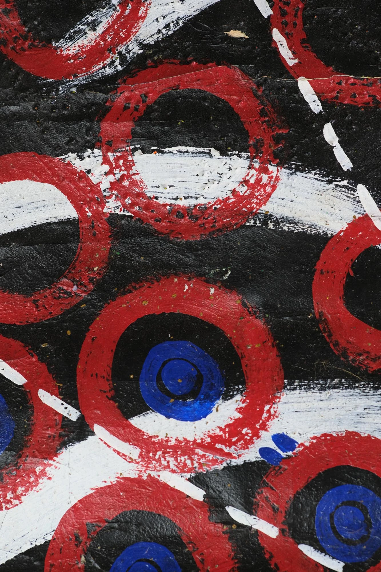 Unsigned abstract geometric black painting with red circles, white arches, and blue spots. There are some cracks and chipped paint. Please see the photos.