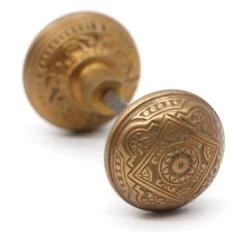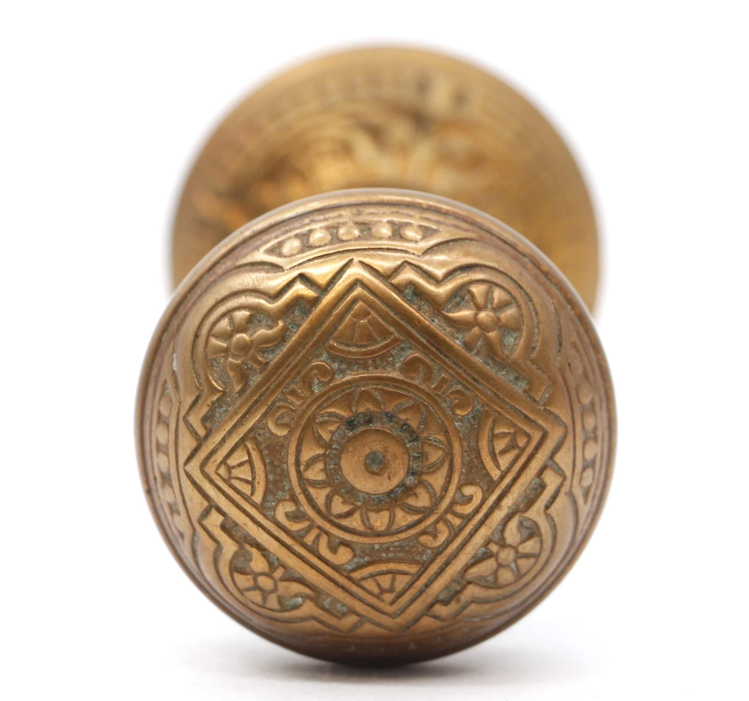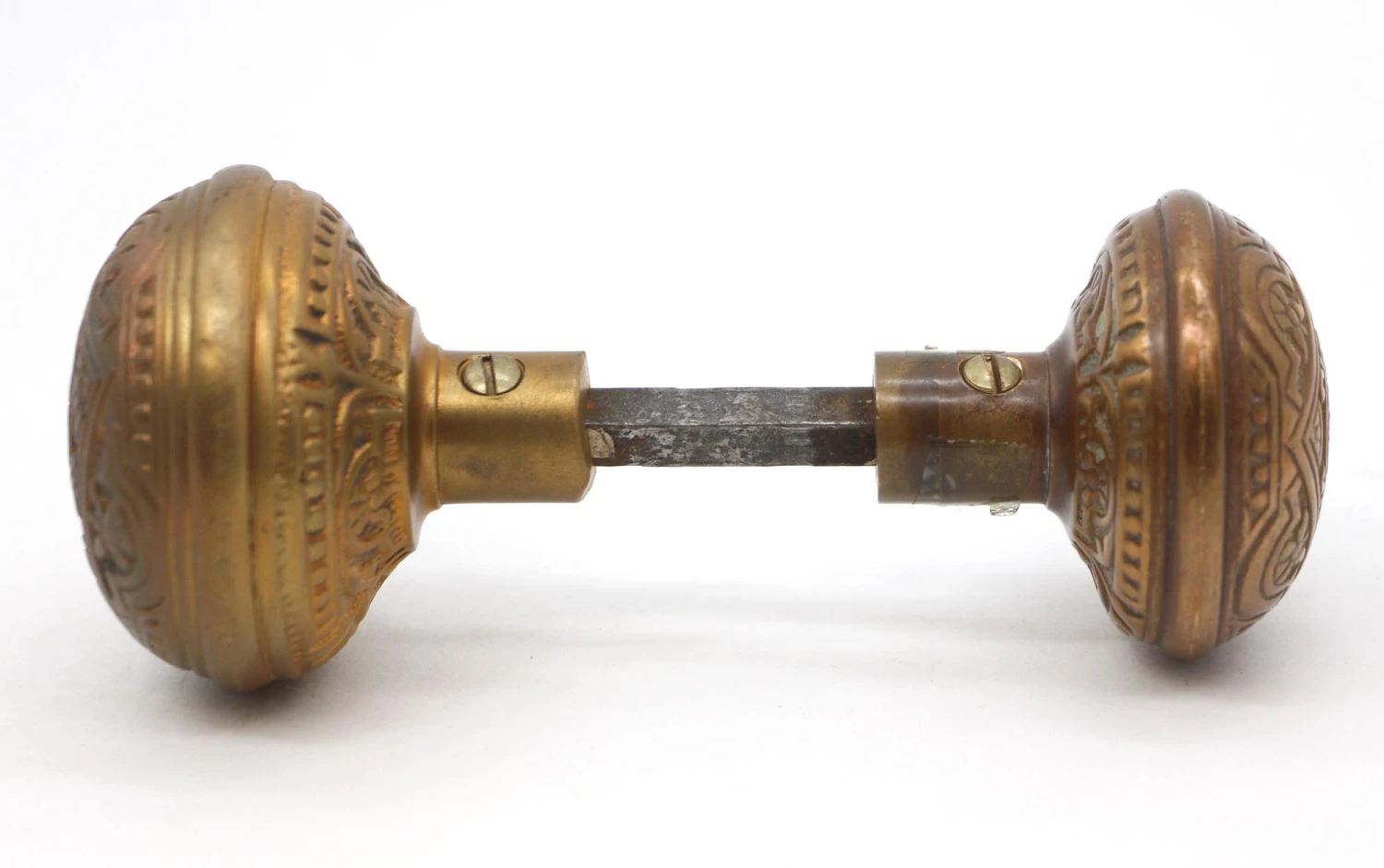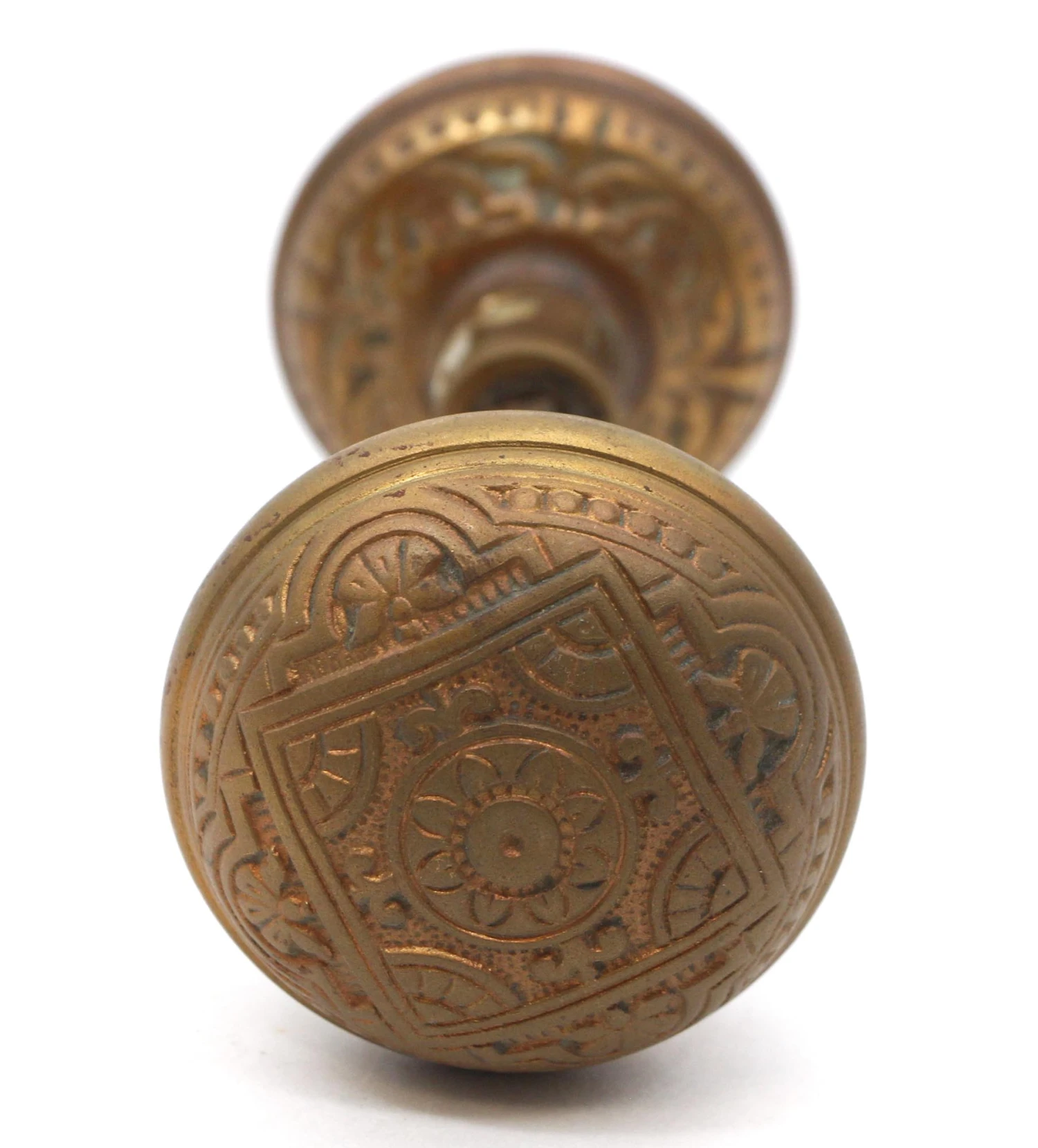 These entry door knobs were manufactured by Corbin in 1885. It is part of the H-21700 group. This Vernacular pattern shows strong motifs from the Greek and Roman ruins. Good condition with appropriate wear from age. Priced as a pair of knobs with a spindle.