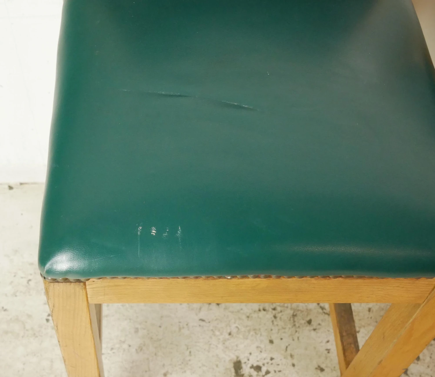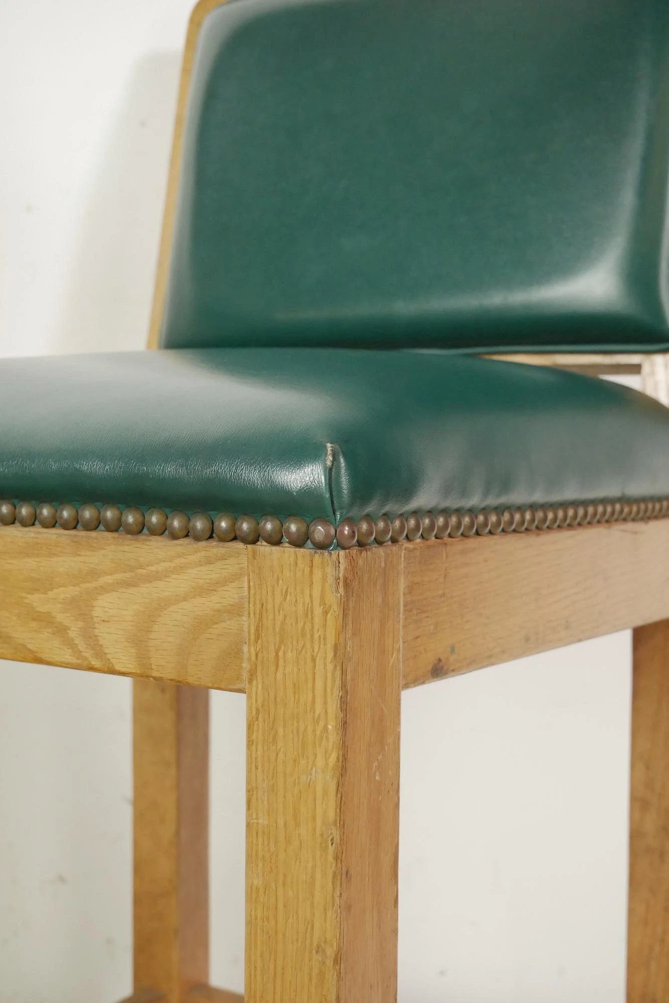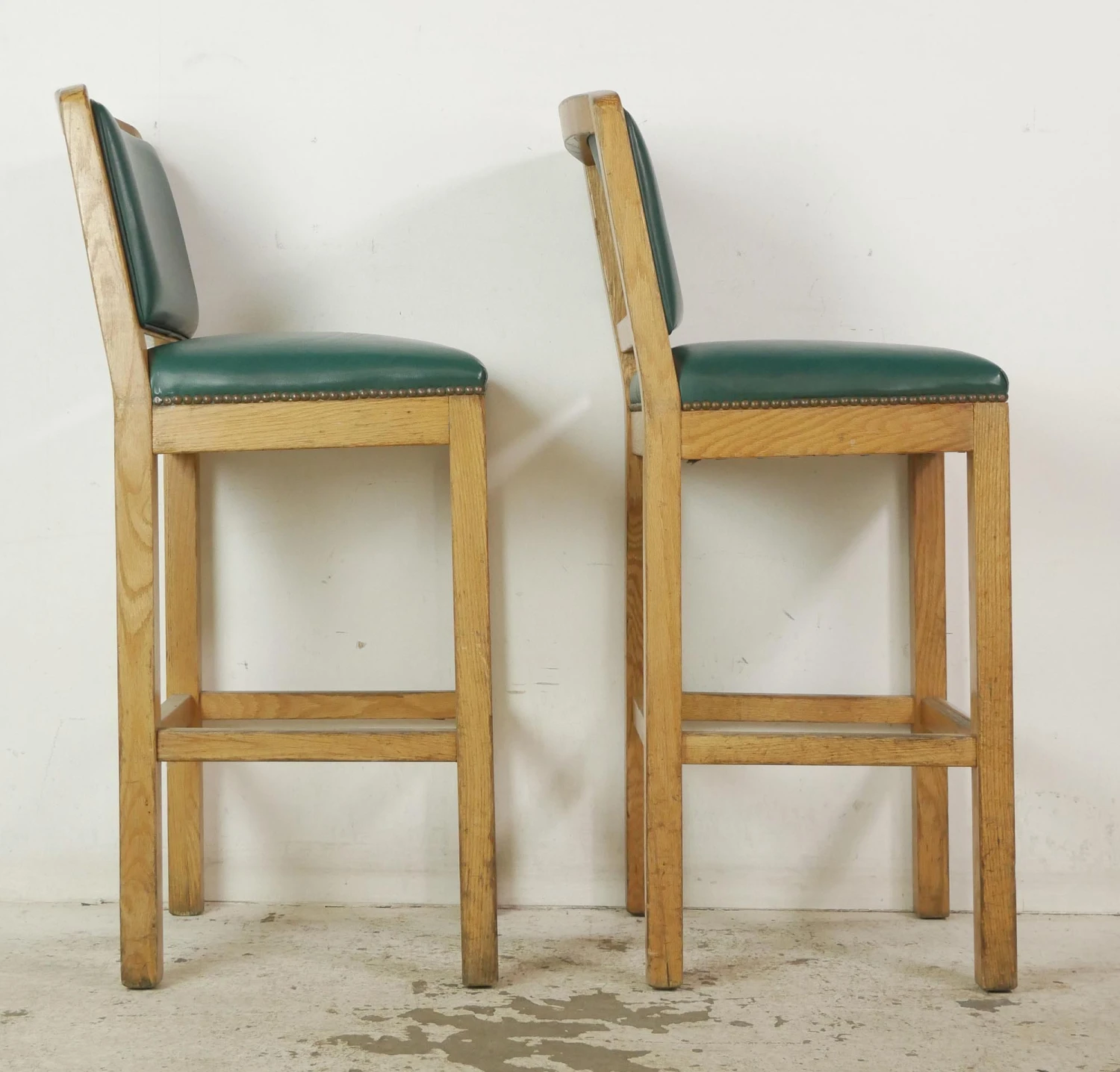 These bar stools were acquired from the racetrack Belmont Park in Elmont, New York. The stools are made of light wood tone oak wood frame, green vinyl upholstery, and brass finish steel studs. Good condition with one chair’s brace having a crack and lots of surface wear. Priced as pair.