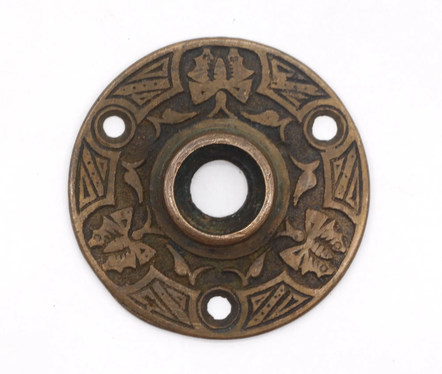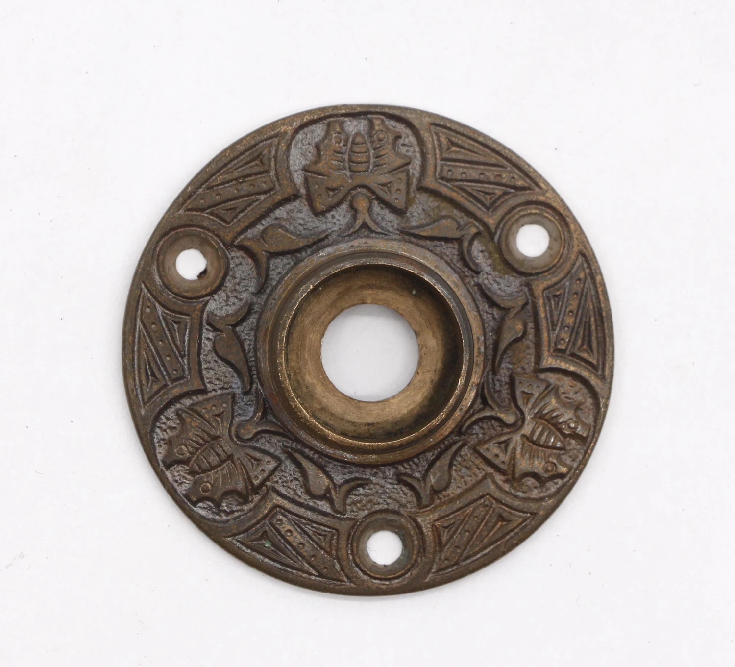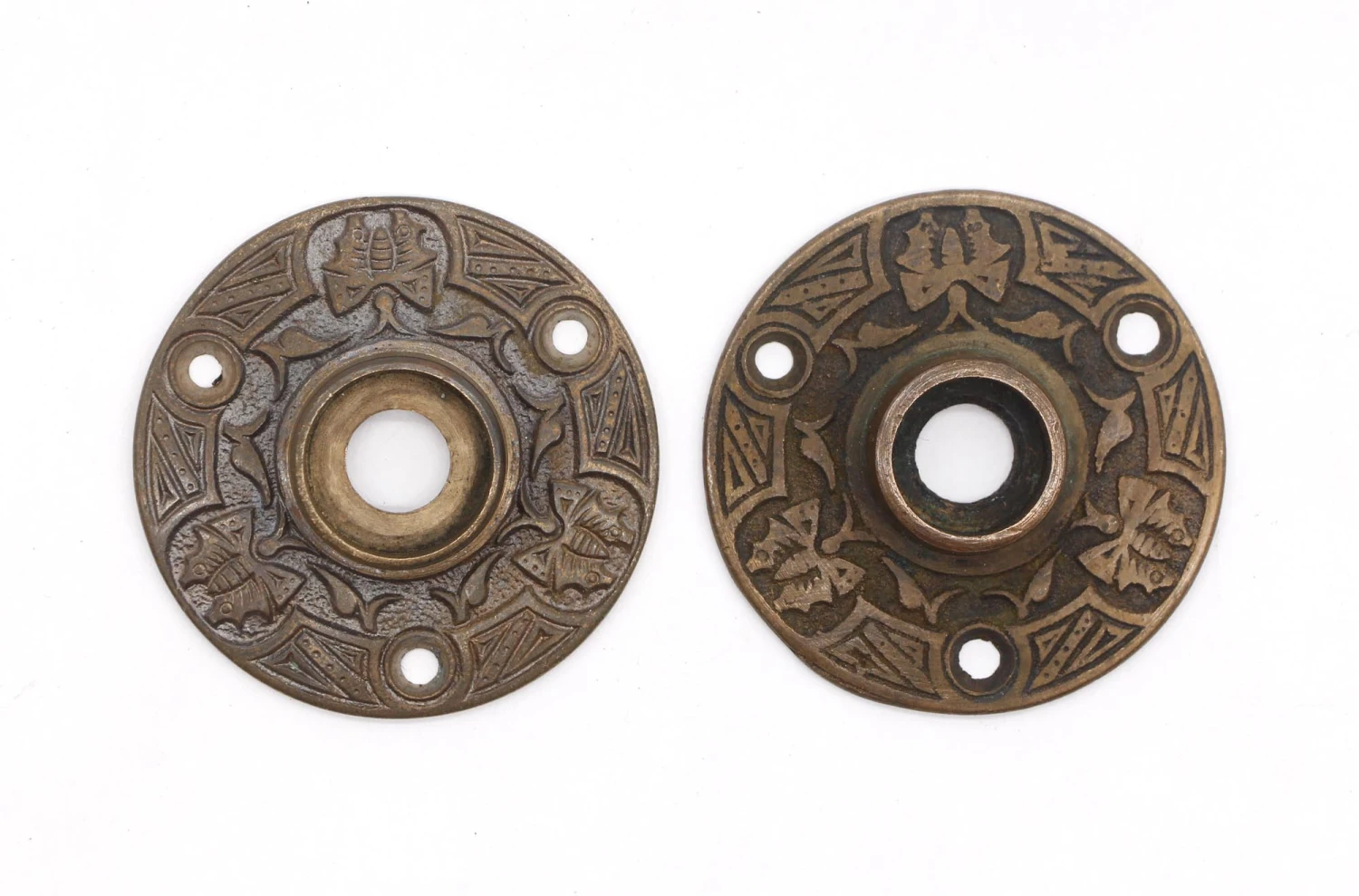 Antique bronze door rosettes with an ornate butterfly design. Patinas vary. Please see the photos. Priced as a pair.