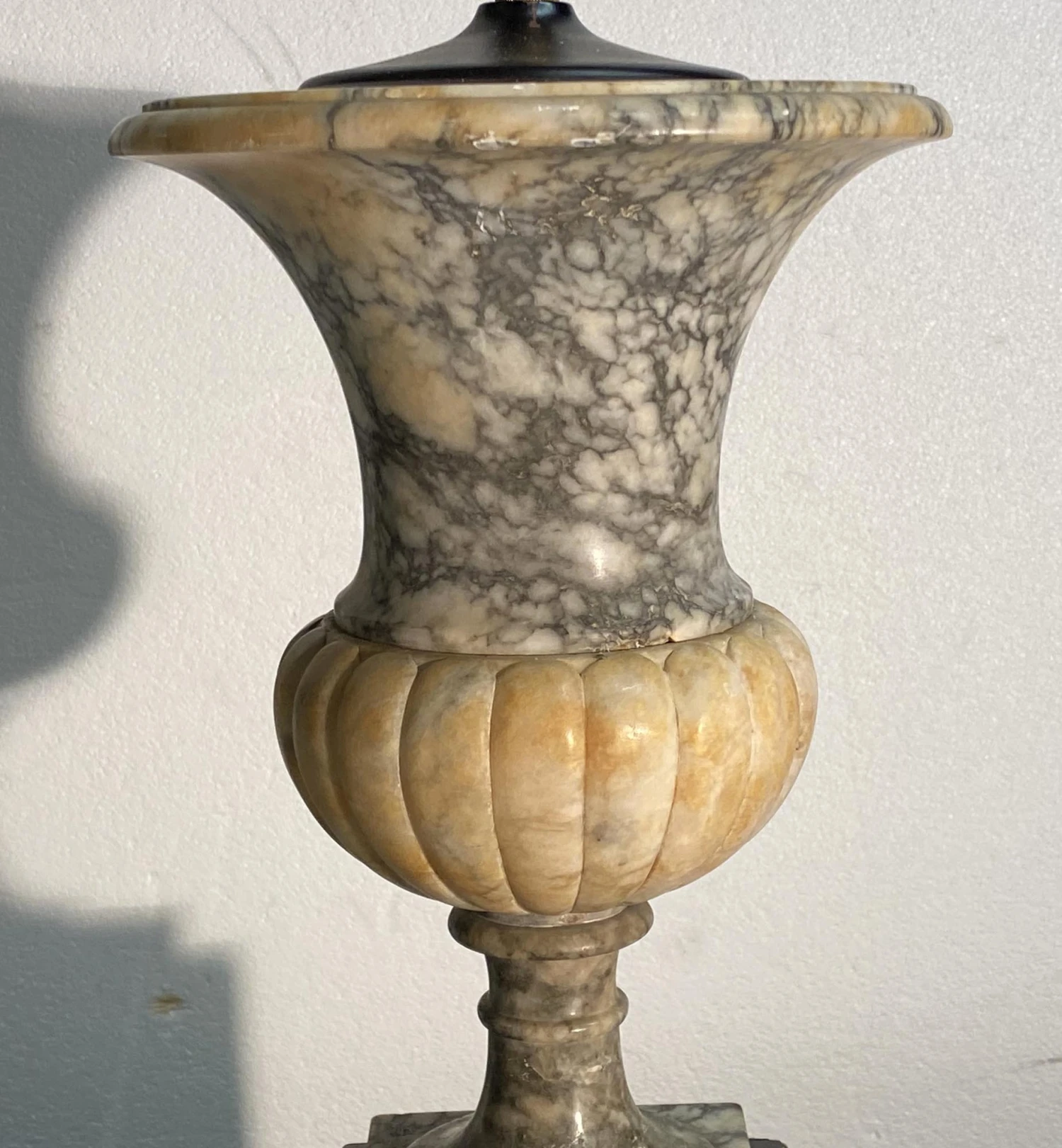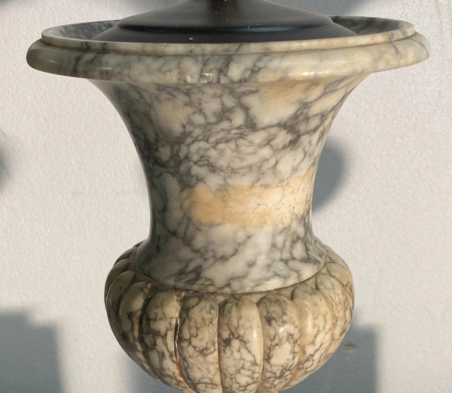 Fluted marble vase lamps on a black and gold wooden base with wreath details. There is some cracking in the marble and variation of color. Priced as a pair. Sold as is. Please inquire about a quote for cleaning and rewiring.