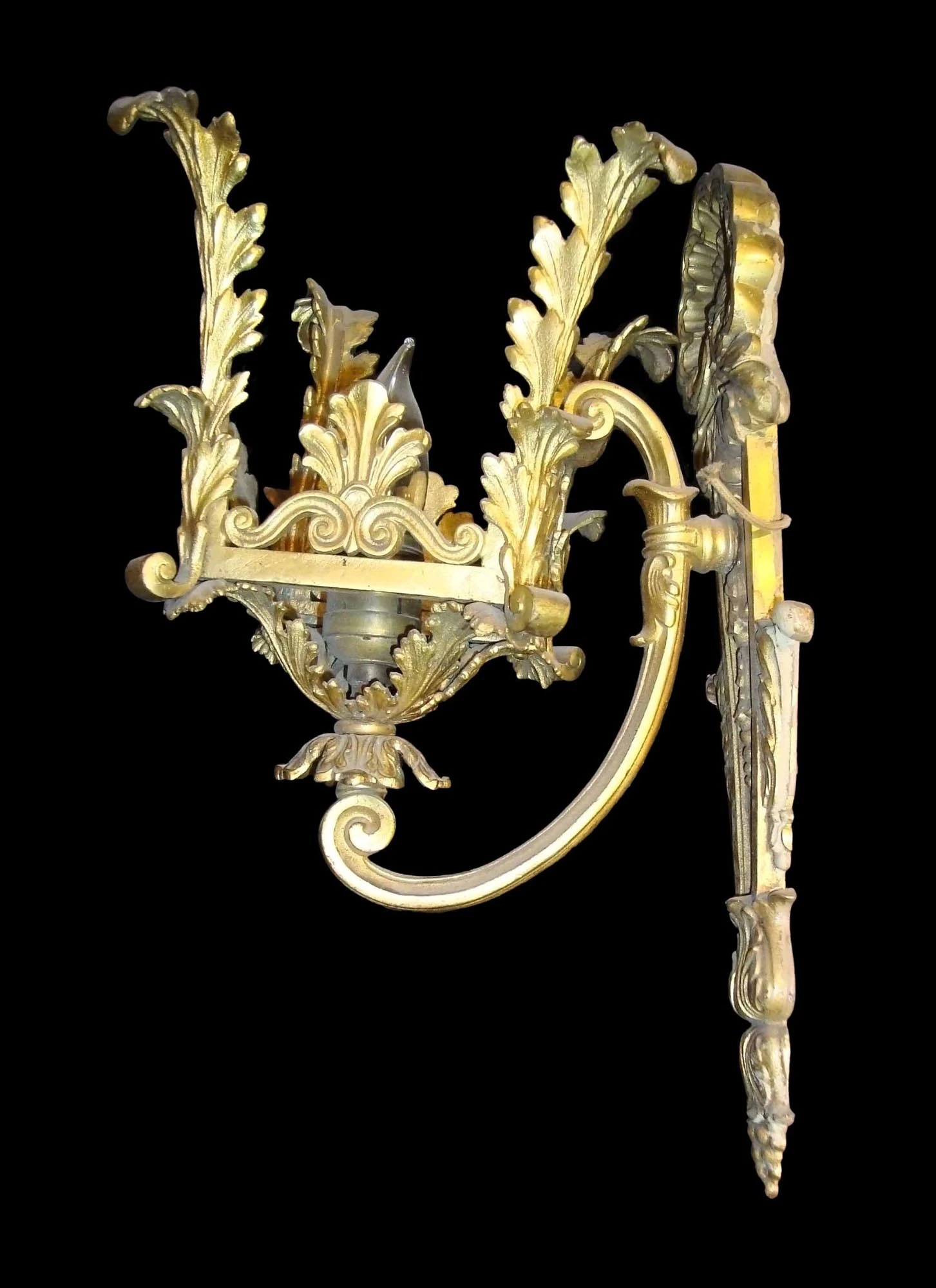 Very ornate Rococo style cast brass sconces with botanical design and a single bulb. This is possibly a reproduction. They are missing the shades. Sold as a pair. Price includes restoration.