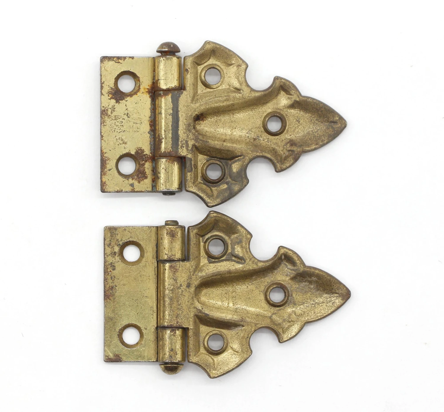 Brass plated steel hinges with surface wear manufactured by Stanley. They are in working condition. Priced as a pair.