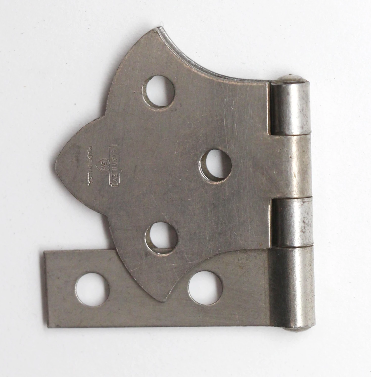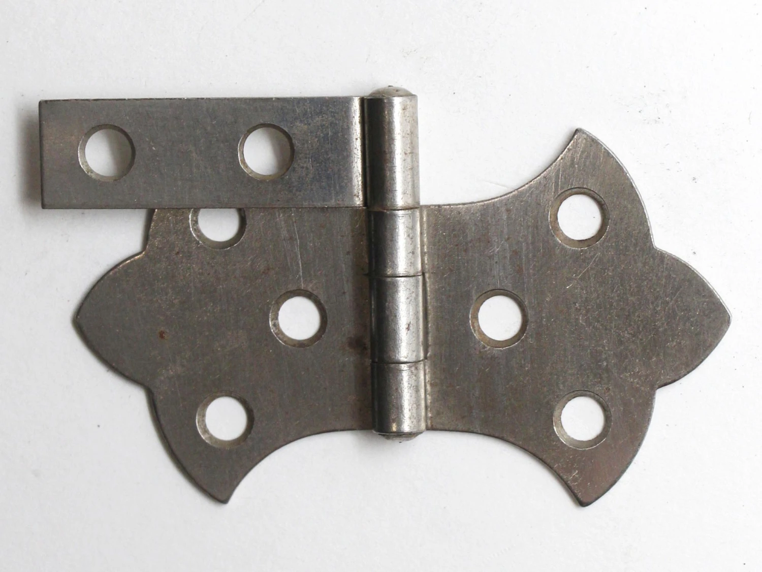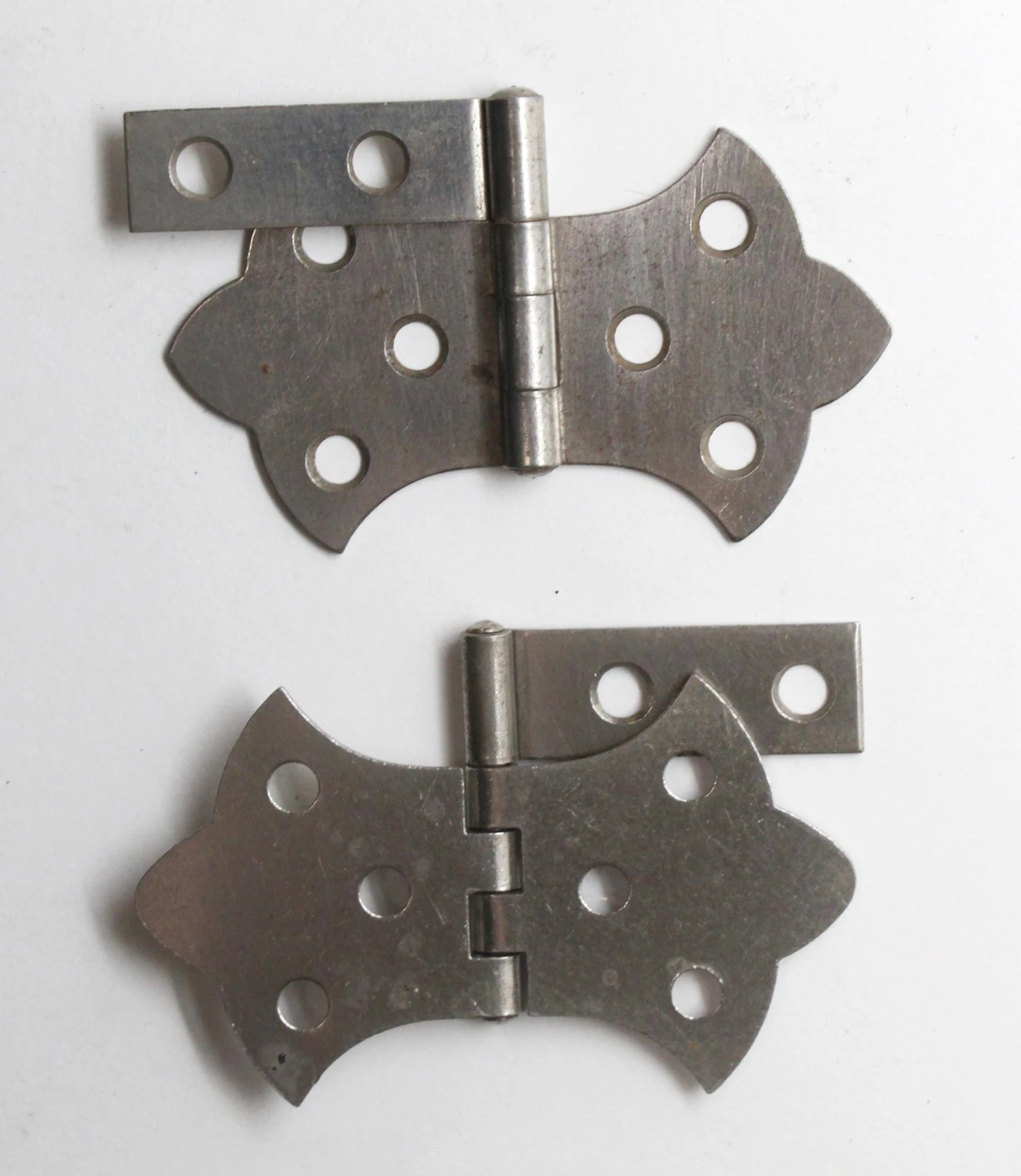 Pair of brushed steel butterfly cabinet hinges with an extra arm support. Good condition with appropriate wear from age. Priced as a pair.