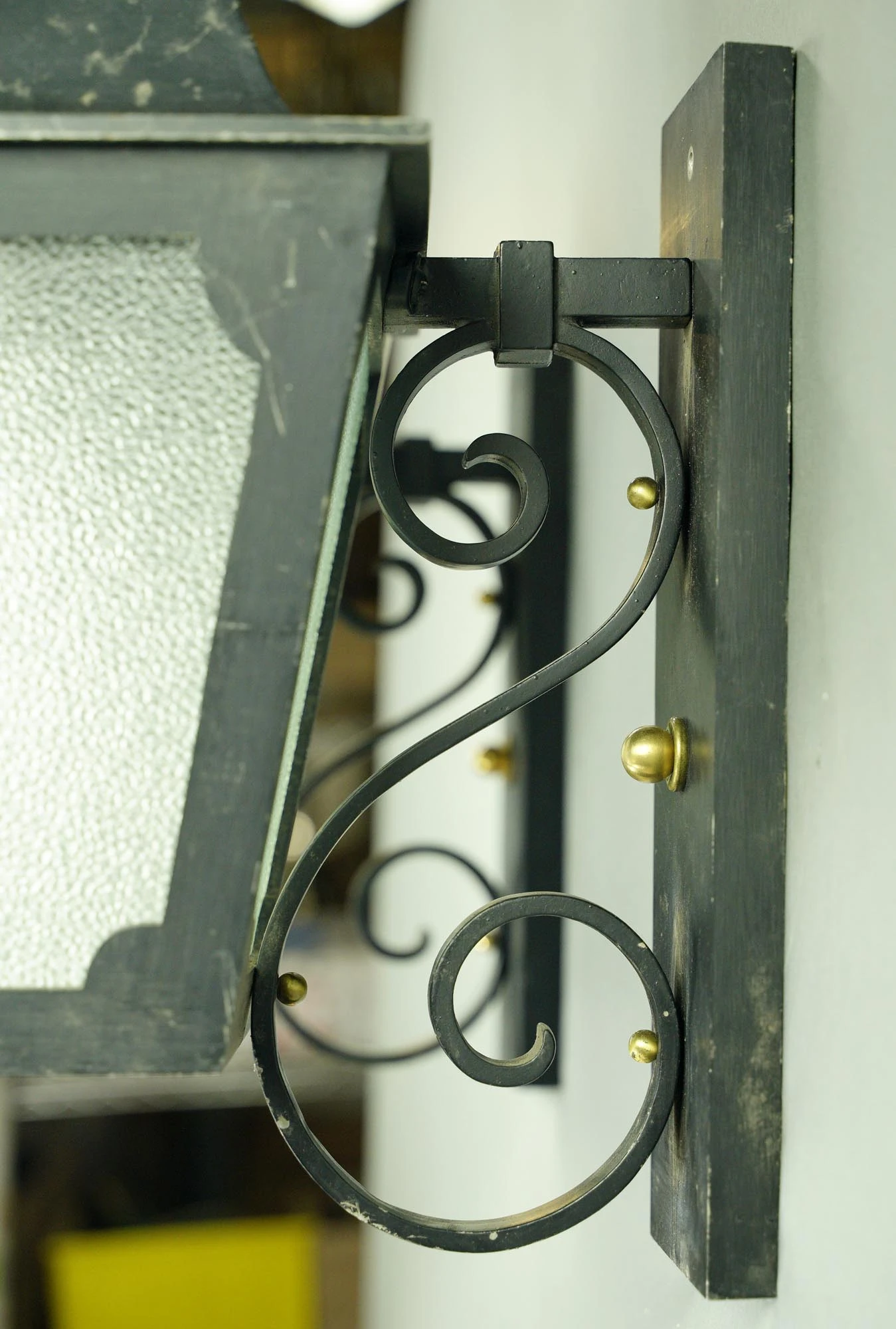 Crafted with a sturdy steel frame, pebbled glass panels, and a brass top, these sconces blend timeless aesthetics with resilience. The pebbled glass panels create a captivating interplay of light, while the black finish exudes a traditional charm. These outdoor sconces make a statement in any setting, infusing warmth and character with their design. They are in good condition with appropriate wear from age. The price includes restoration of cleaning and rewiring. Priced as a pair.