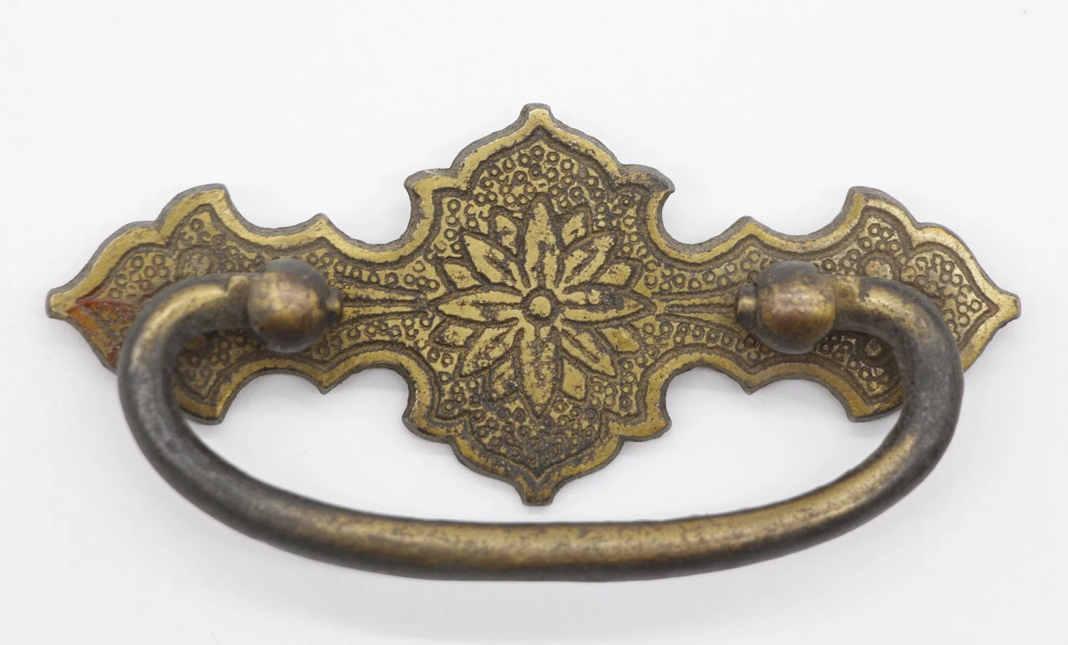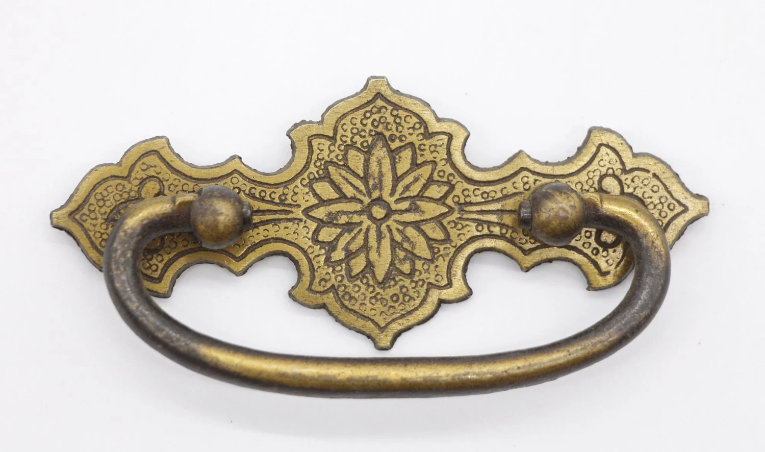 Vintage brass drawer bail drawer pulls with a center flower design. Priced as a pair.