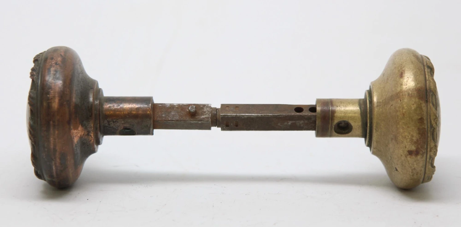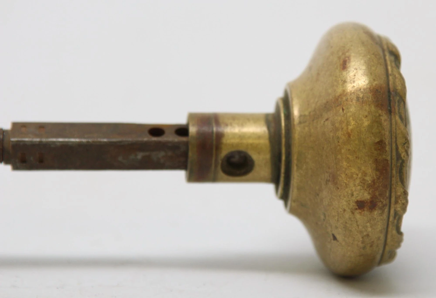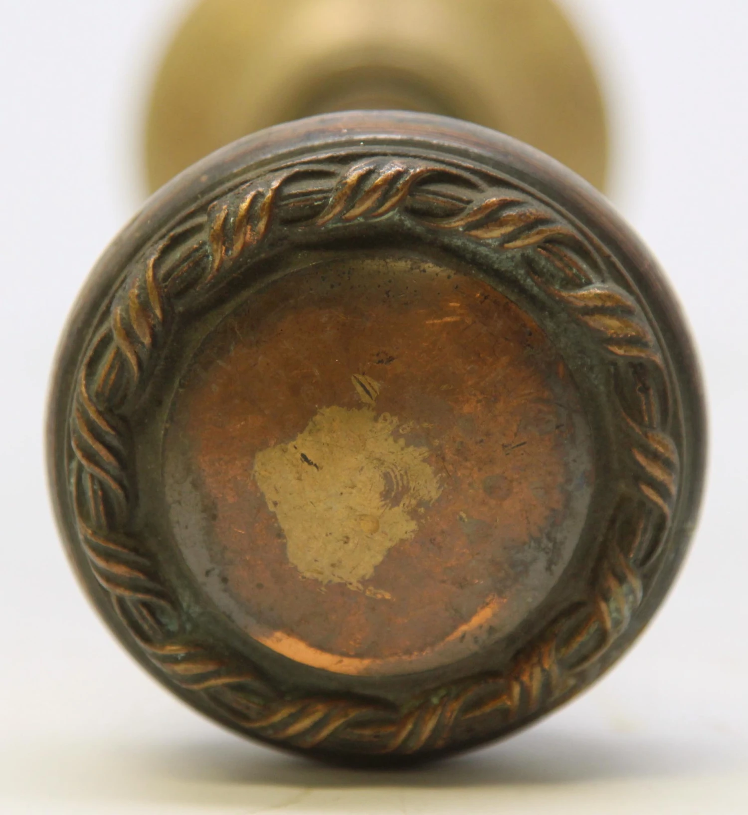 These solid bronze knobs have a rope motif on the face and beautiful original patina. They are larger in size for an exterior door. Priced as a pair of knobs with spindle.