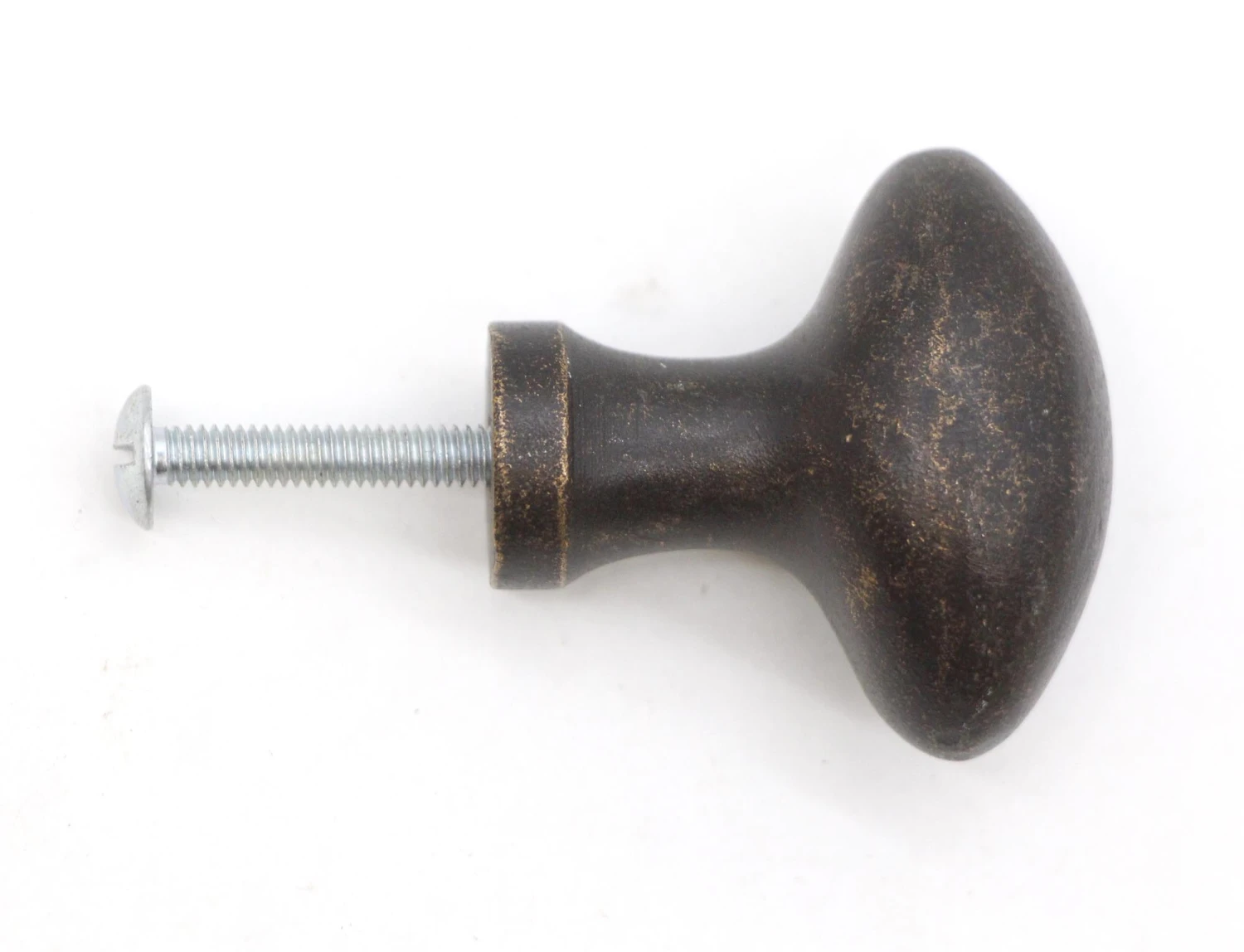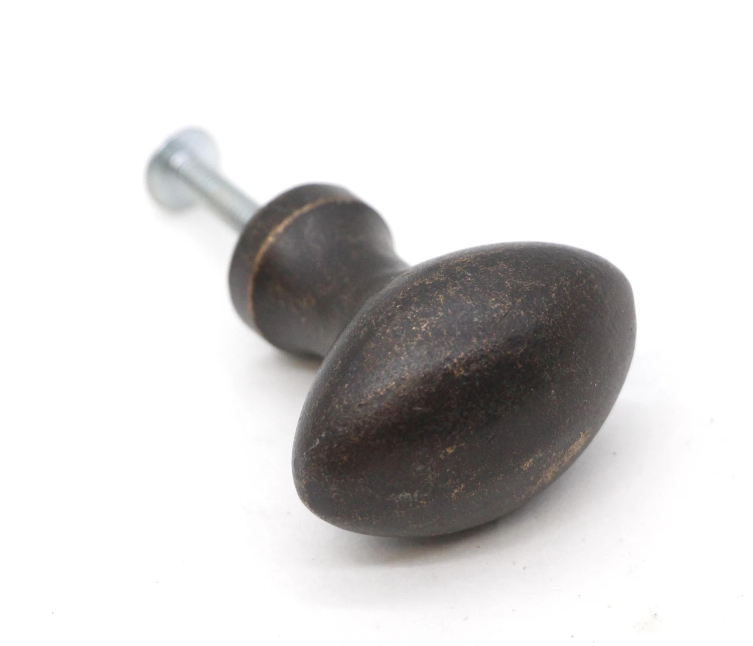 Oval shaped textured cabinet or drawer knobs made of brass with a dark brass finish. Mounting screws are included. Good condition. Priced as a pair.